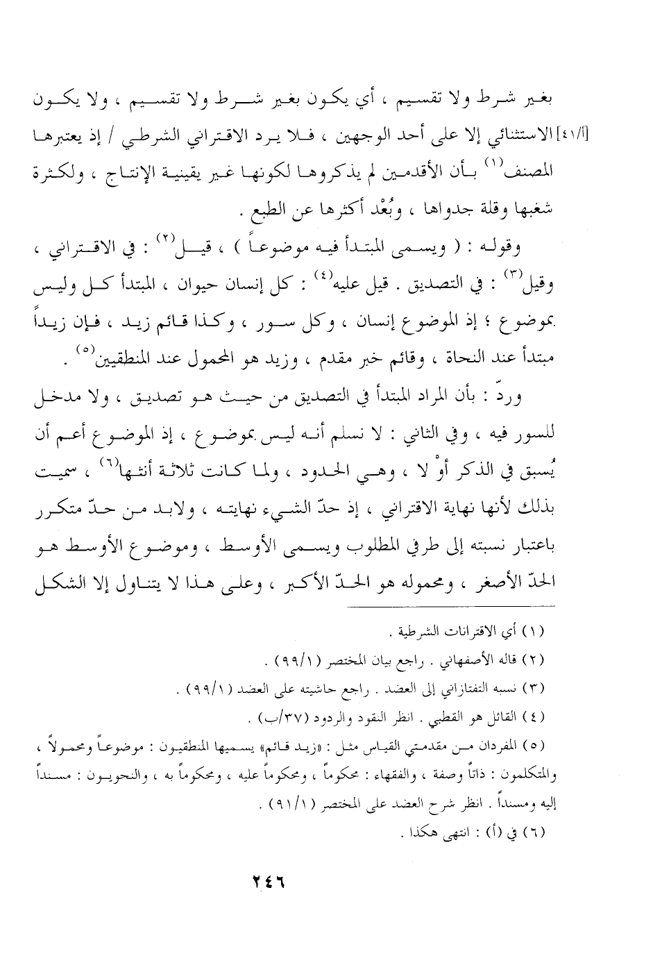 بغير شرط ولا تقسيم, أي يكون بغير شرط ولا تقسيم, ولا يكون الاستثنائي إلا على أحد الوجهين, فلا يرد الاقتراني الشرطي / إذ يعتبرها المصنف بأن الأقدمين لم يذكروها لكونها غير يقينية الإنتاج, ولكثرة شغبها وقلة جدواها, وبعد أكثرها عن الطبع.