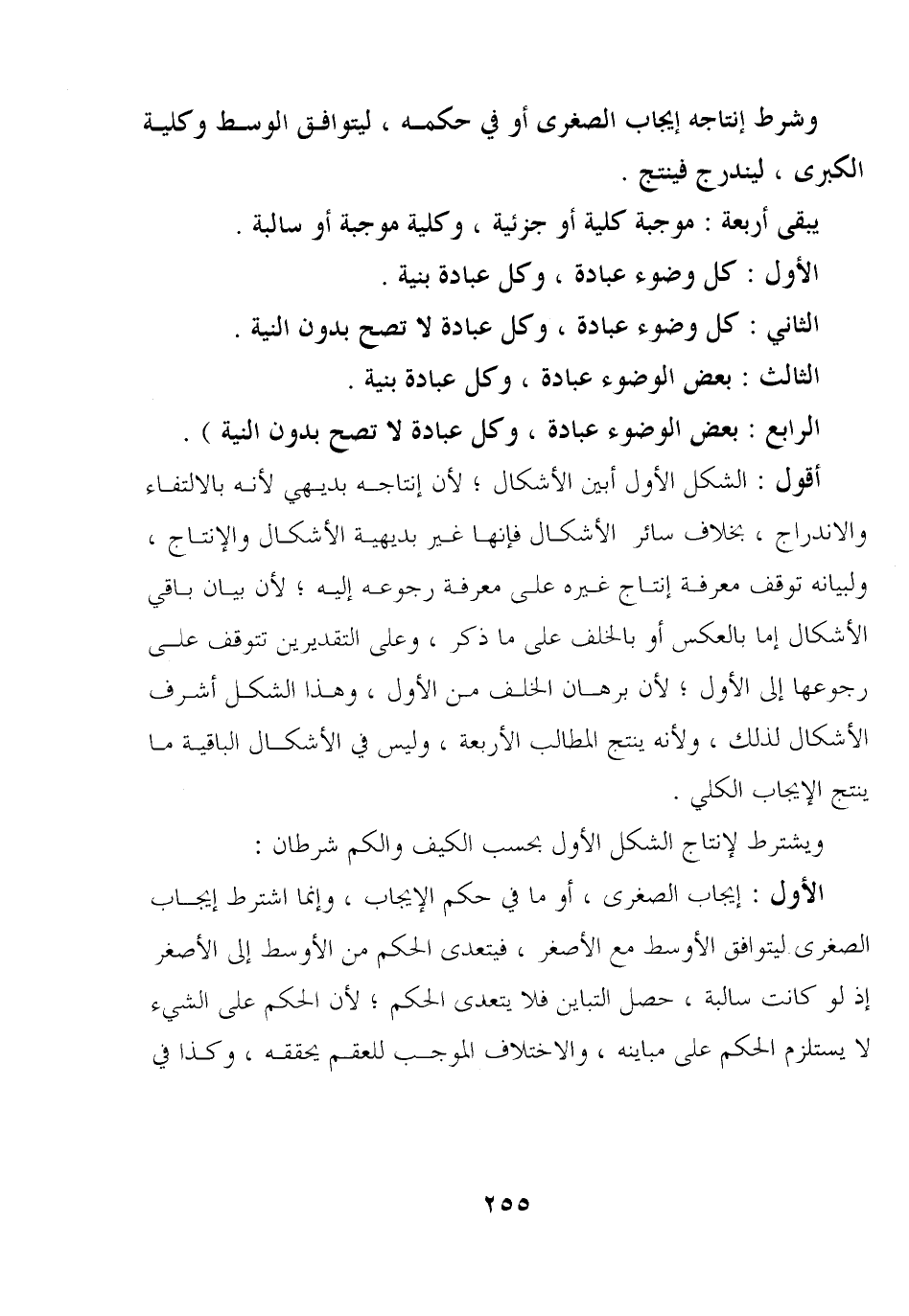 أقول: الشكل الأول أبين الأشكال؛ لأن إنتاجه بديهي لأنه بالالتفاء والاندراج, بخلاف سائر الأشكال فإنها غير بديهية الأشكال والإنتاج, ولبيانه توقف معرفة إنتاج غيره على معرفة رجوعه إليه؛ لأن بيان باقي الأشكال إما بالعكس أو بالخلف على ما ذكر, وعلى التقديرين تتوقف على رجوعها إلى الأول؛ لأن برهان الخلف من الأول, وهذا الشكل أشرف الأشكال لذلك, ولأنه ينتج المطالب الأربعة, وليس في الأشكال الباقية ما ينتج الإيجاب الكلي.