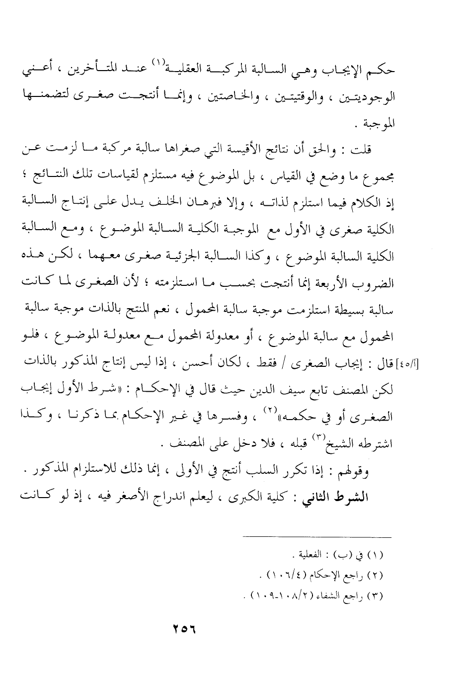 قلت: والحق أن نتائج الأقيسة التي صغراها سالبة مركبة ما لزمت عن مجموع ما وضع في القياس, بل الموضوع فيه مستلزم لقياسات تلك النتائج؛ إذ الكلام فيما استلزم لذاته, وإلا فبرهان الخلف يدل على إنتاج السالبة الكلية صغرى في الأول مع الموجبة الكلية السالبة الموضوع, ومع السالبة الكلية السالبة الموضوع, وكذا السالبة الجزئية صغرى معهما, لكن هذه الضروب الأربعة إنما أنتجت بحسب ما استلزمته؛ لأن الصغرى لما كانت سالبة بسيطة استلزمت موجبة سالبة المحمول, نعم المنتج بالذات موجبة سالبة المحمول مع سالبة الموضوع, أو معدولة المحمول مع معدولة الموضوع, فلو قال: إيجاب الصغرى / فقط, لكن أحسن, إذا ليس إنتاج المذكور بالذات لكن المصنف تابع سيف الدين حيث قال في الإحكام: «شرط الأول إيجاب الصغرى أو في حكمه» , وفسرها في غير الإحكام بما ذكرنا, وكذا اشترطه الشيخ قبله, فلا دخل على المصنف.