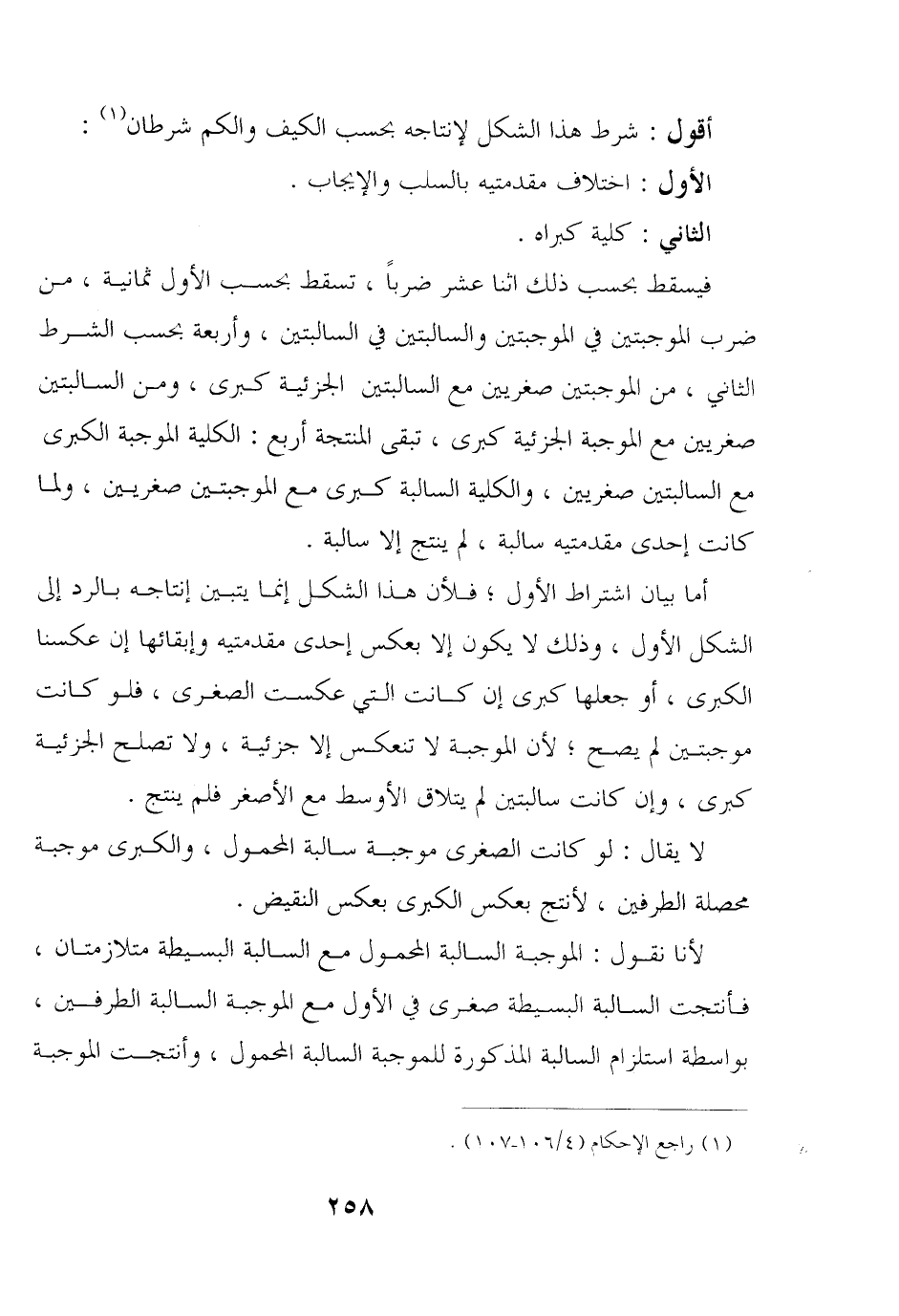 أقول: شرط هذا الشكل لإنتاجه بحسب الكيف والكم شرطان: