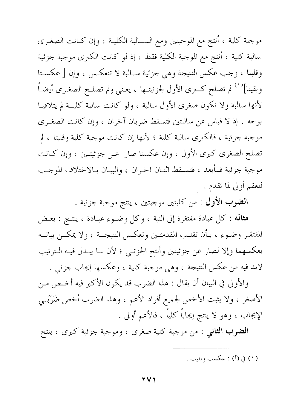 موجبة كلية, أنتج مع الموجبتين ومع السالبة الكلية, وإن كانت الصغرى سالبة كلية, أنتج مع الموجبة الكلية فقط, إذ لو كانت الكبرى موجبة جزئية وقلنا, وجب عكس النتيجة وهي جزئية سالبة لا تنعكس, وإن [عكستا وبقيتا] لم تصلح كبرى الأول لجزئيتها, يعنى ولم تصلح الصغرى أيضًا لأنها سالبة ولا تكون صغرى الأول سالبة, ولو كانت سالبة كلية لم يتلاقيا بوجه, إذ لا قياس عن سالبتين فتسقط ضربان آخران, وإن كانت الصغرى موجبة جزئية, فالكبرى سالبة كلية؛ لأنها إن كانت موجبة كلية وقلبتا, لم تصلح الصغرى كبرى الأول, وإن عكستا صار عن جزئيتين, وإن كانت موجبة جزئية فأبعد, فتسقط اثنان آخران, والبيان بالاختلاف الموجب للعقم أولى لما تقدم.