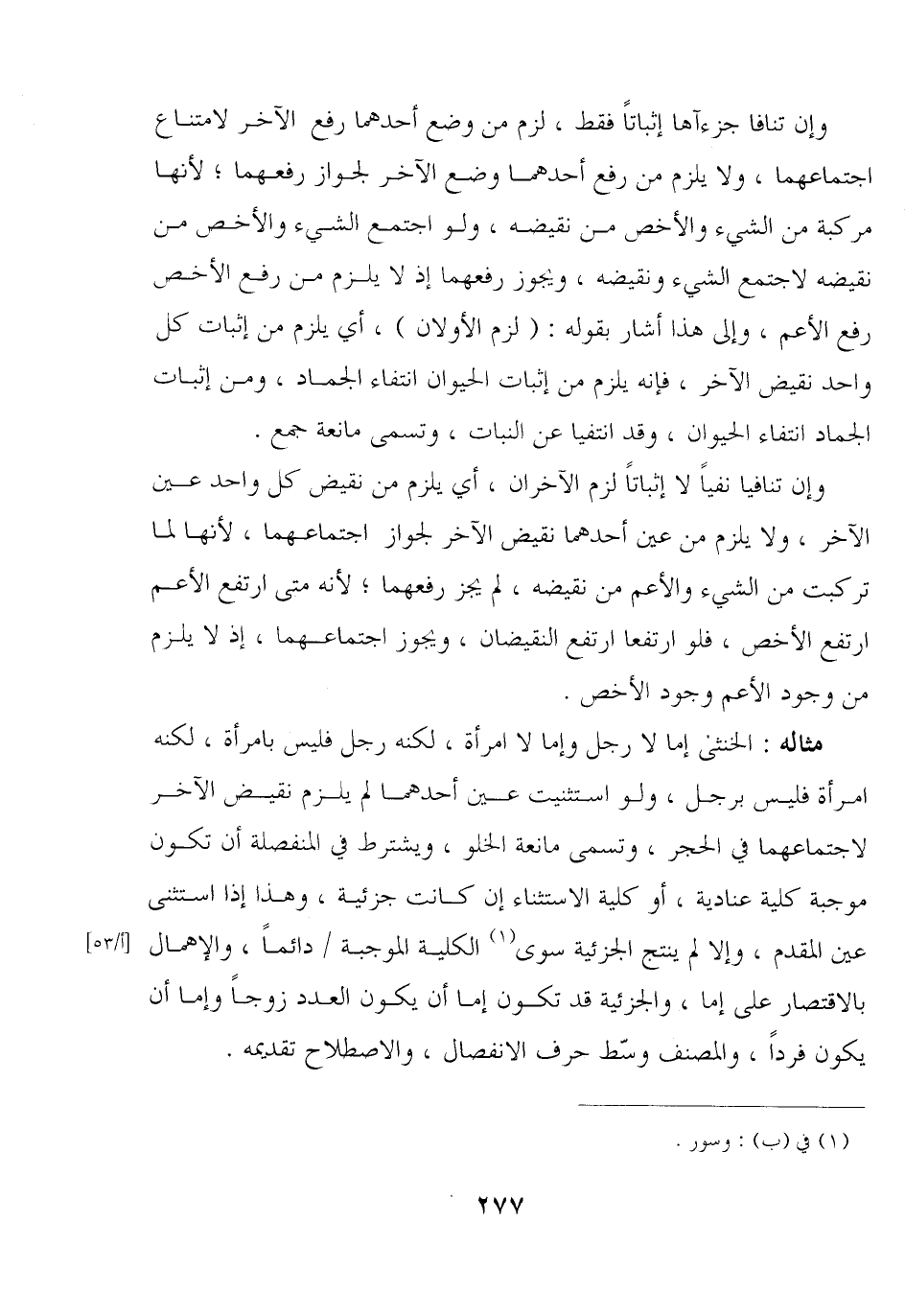 مثاله: المثنى إما لا رجل وإما لا امرأة, لكنه رجل فليس بامرأة, لكنه امرأة فليس برجل, ولو استثنيت عين أحدهما لم يلزم نقيض الآخر لاجتماعهما في الحجر, وتسمى مانعة الخلو, ويشترط في المنفصلة أن تكون موجبة كلية عنادية, أو كلية الاستثناء إن كانت جزئية, وهذا إذا استثنى عين المقدم, وإلا لم ينتج الجزئية سوى الكلية الموجبة / دائمًا, والإهمال بالاقتصار على إما, والجزئية سوى الكلية الموجبة / دائمًا, والإهمال بالاقتصار على إما, والجزئية قد تكون إما أن يكون العدد زوجًا وإما أن يكون فردًا, والمصنف وسط حرف الانفصال, والاصطلاح تقديمه.