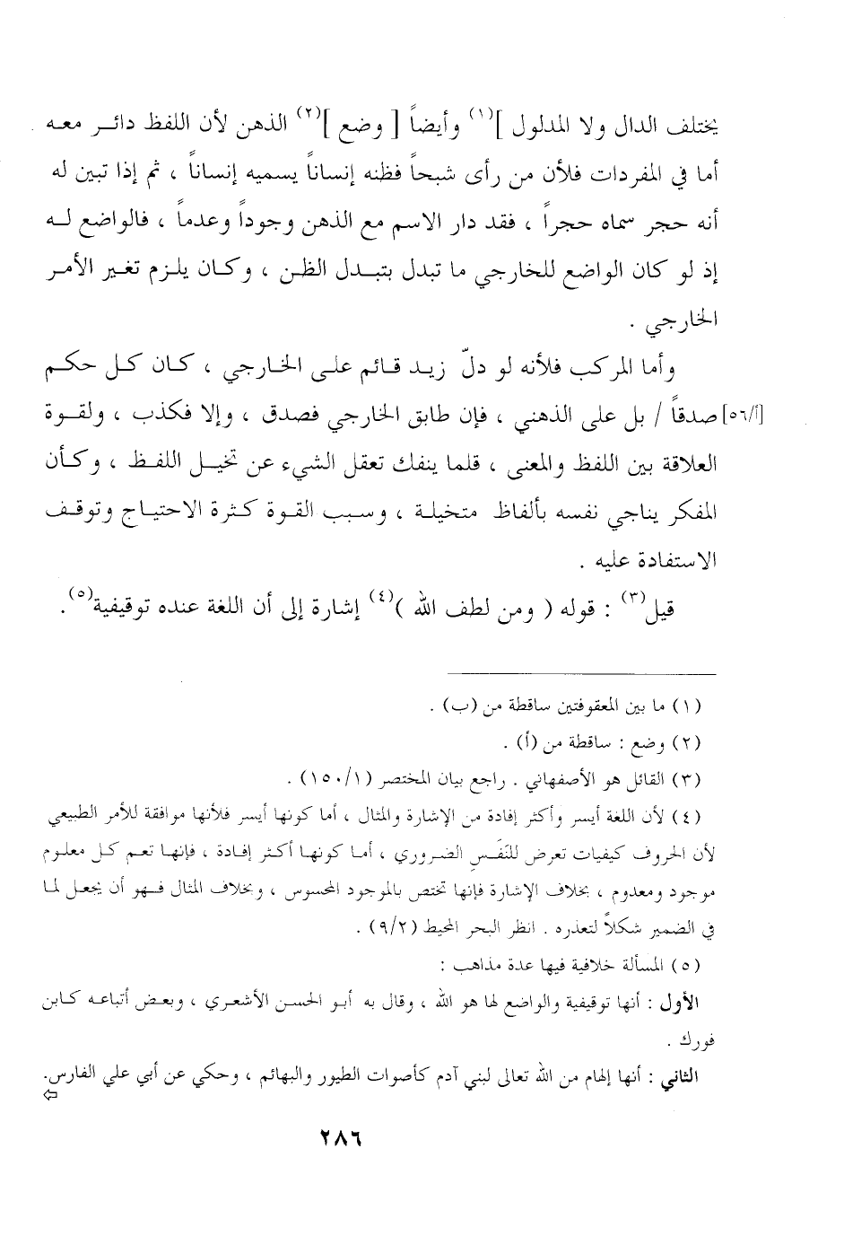 يختلف الدال ولا المدلول] وأيضًا [وضع] الذهن لأن اللفظ دائر معه أما في المفردات فلأن من رأى شبحًا فظنه إنسانًا يسميه إنسانًا, ثم إذا تبين له أنه حجر سماه حجرًا, فقد دار الاسم مع الذهن وجودًا وعدمًا, فالواضع له إذ لو كان الواضع للخارجي ما تبدل بتبدل الظن, وكان يلزم تغير الأمر الخارجي.