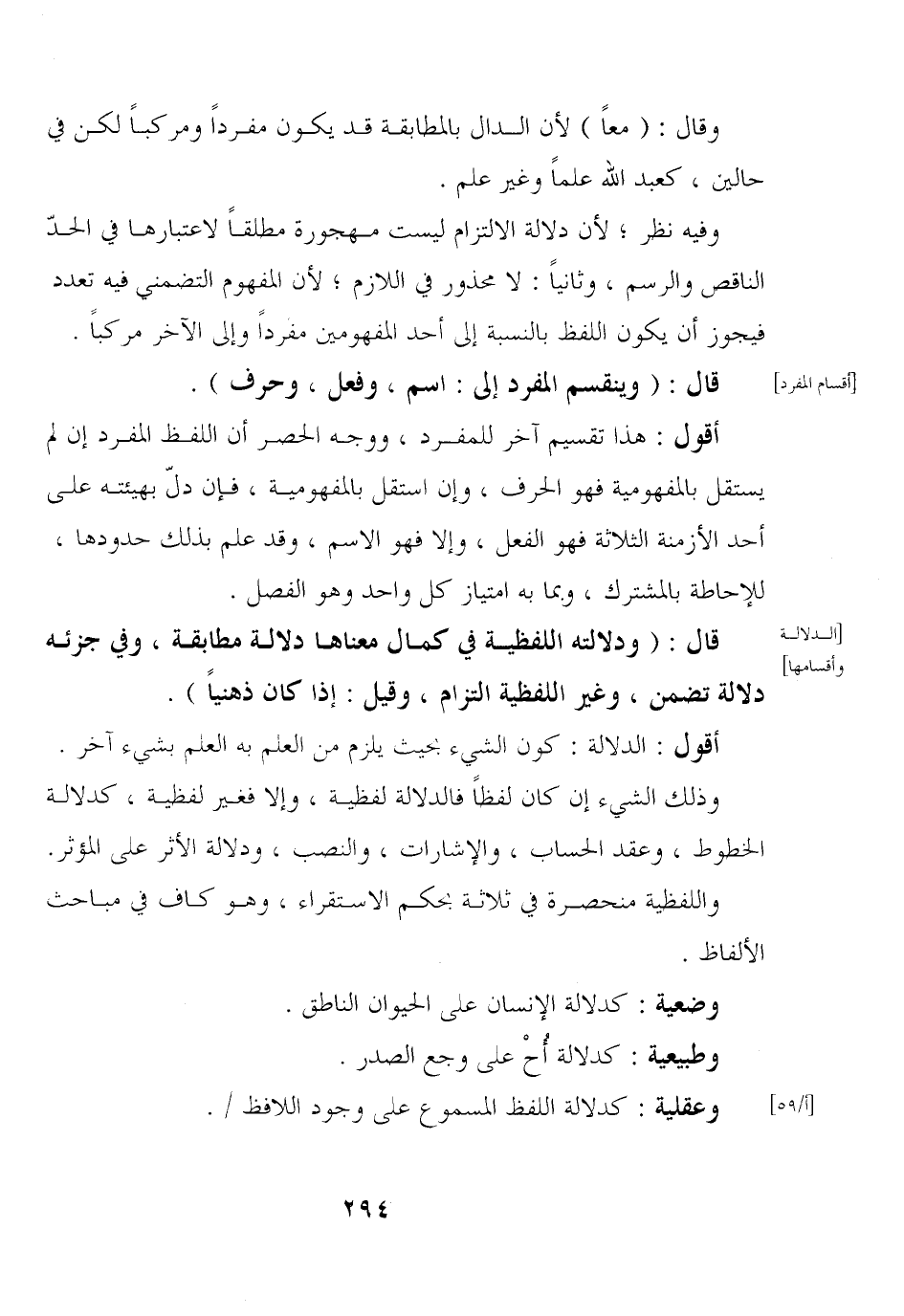 وذلك الشيء إن كان لفظًا فالدلالة لفظية, وإلا فغير لفظية, كدلالة الخطوط, وعقد الحساب, والإشارات, والنصب, ودلالة الأثر على المؤثر. واللفظية منحصرة في ثلاثة بحكم الاستقراء, وهو كاف في مباحث الألفاظ.