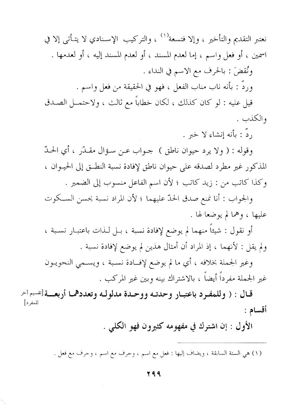 وغير الجملة بخلافه, أي ما لم يوضع لإفادة نسبة, ويسمي النحويون غير الجملة مفردًا أيضًا, بالاشتراك بينه وبين غير المركب.