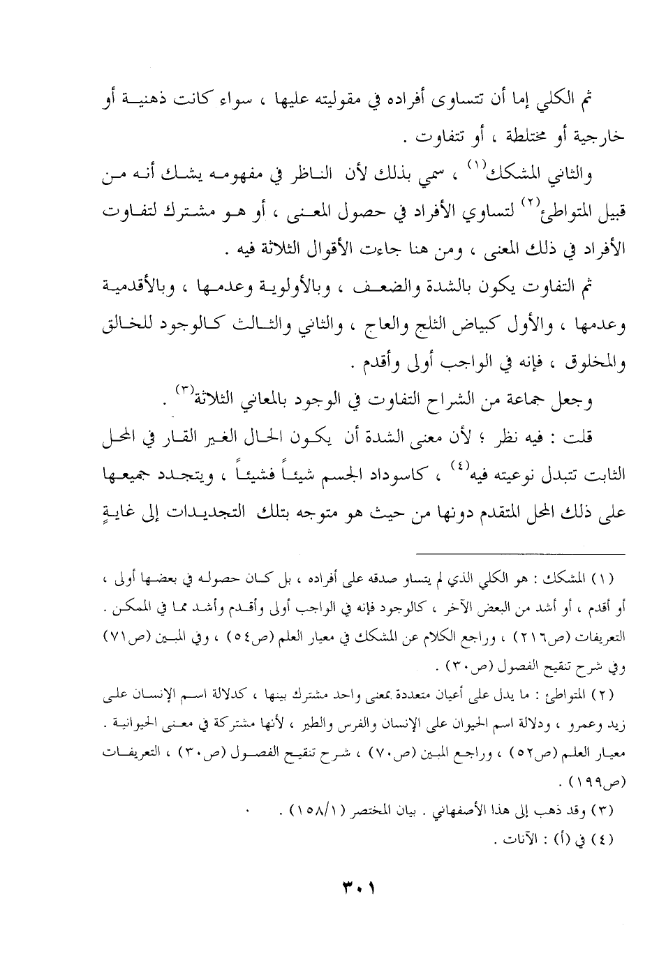 ثم التفاوت يكون بالشدة والضعف, وبالأولوية وعدمها, وبالأقدمية وعدمها, والأول كبياض الثلج والعاج, والثاني والثالث كالوجود للخالق والمخلوق, فإنه في الواجب أولى وأقدم.