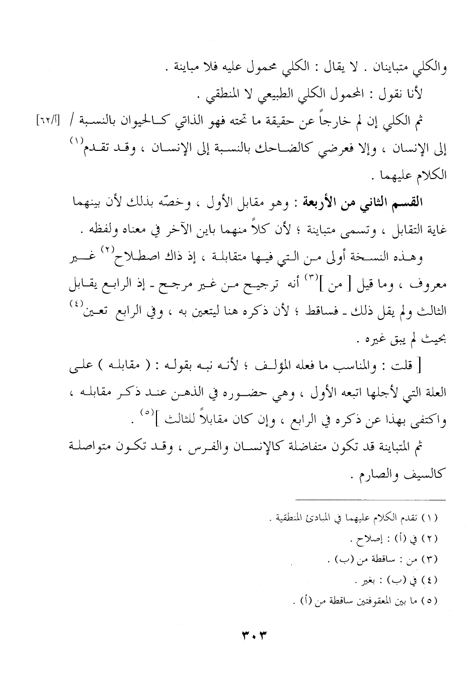 وهذه النسخة أولى من التي فيها متقابلة, إذ ذاك اصطلاح غير معروف, وما قيل [من] أنه ترجيح من غير مرجح - إذ الرابع يقابل الثالث ولم يقل ذلك - فساقط؛ لأن ذكره هنا ليتعين به, وفي الرابع تعين بحيث لم يبق غيره.