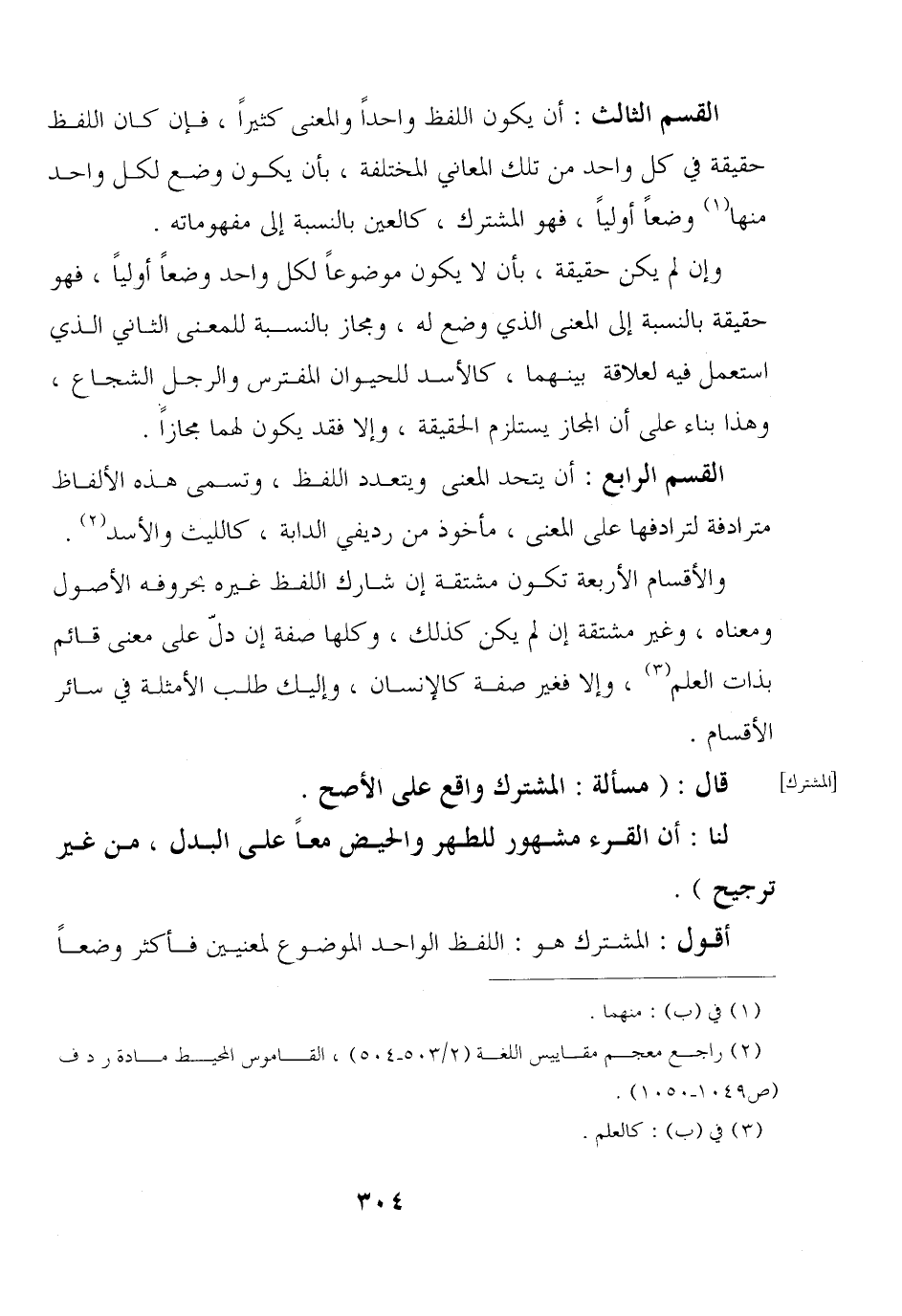 القسم الثالث: أن يكون اللفظ واحدًا والمعنى كثيرًا, فإن كان اللفظ حقيقة في كل واحد من تلك المعاني المختلفة, بأن يكون وضع لكل واحد منها وضعًا أوليًا, فهو المشترك, كالعين بالنسبة إلى مفهوماته.