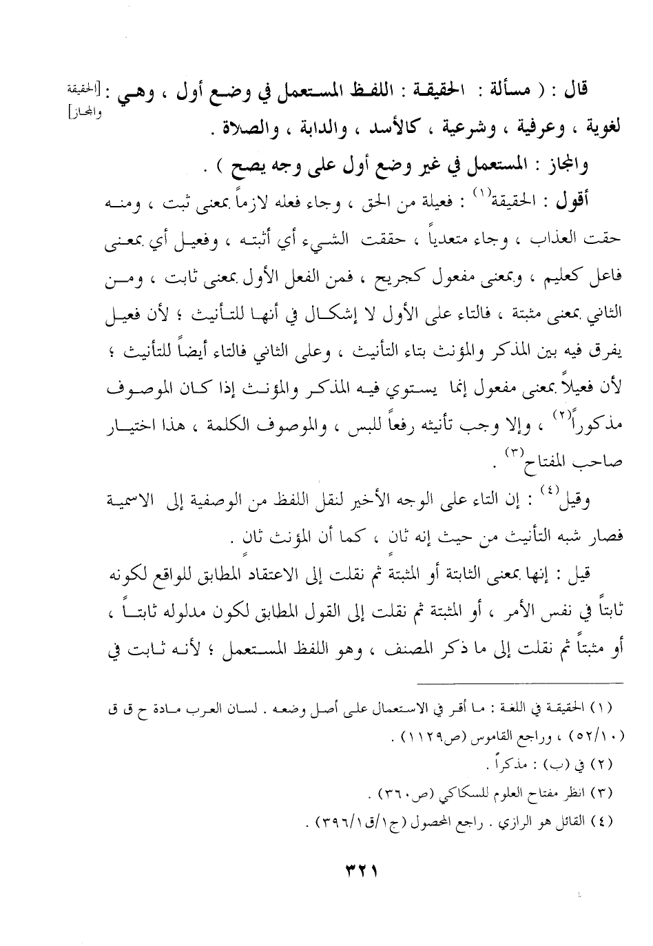 أقول: الحقيقة: فعيلة من الحق, وجاء فعله لازمًا بمعنى ثبت, ومنه حقت العذاب, وجاء متعديًا, حققت الشيء أي أثبته, وفعيل أي بمعنى فاعل كعليم, وبمعنى مفعول كجريح, فمن الفعل الأول بمعنى ثابت, ومن الثاني بمعنى مثبتة, فالتاء على الأول لا إشكال في أنها للتأنيث؛ لأن فعيل يفرق فيه بين المذكر والمؤنث بتاء التأنيث, وعلى الثاني فالتاء أيضًا للتأنيث؛ لأن فعيلًا بمعنى مفعول إنما يستوي فيه المذكر والمؤنث إذا كان الموصوف مذكورًا, وإلا وجب تأنيثه رفعًا للبس, والموصوف الكلمة, هذا اختيار صاحب المفتاح.