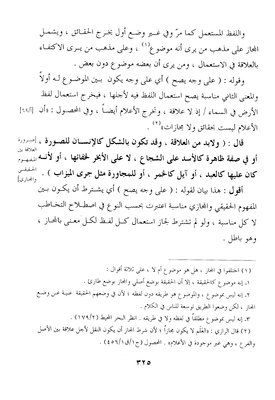قال: (ولابد من العلاقة, وقد تكون بالشكل كالإنسان للصورة, أو في صفة ظاهرة كالأسد على الشجاع, لا على الأبخر لخفائها, أو لأنه كان عليها كالعبد, أو آيل كالخمر, أو للمجاورة مثل جرى الميزاب).