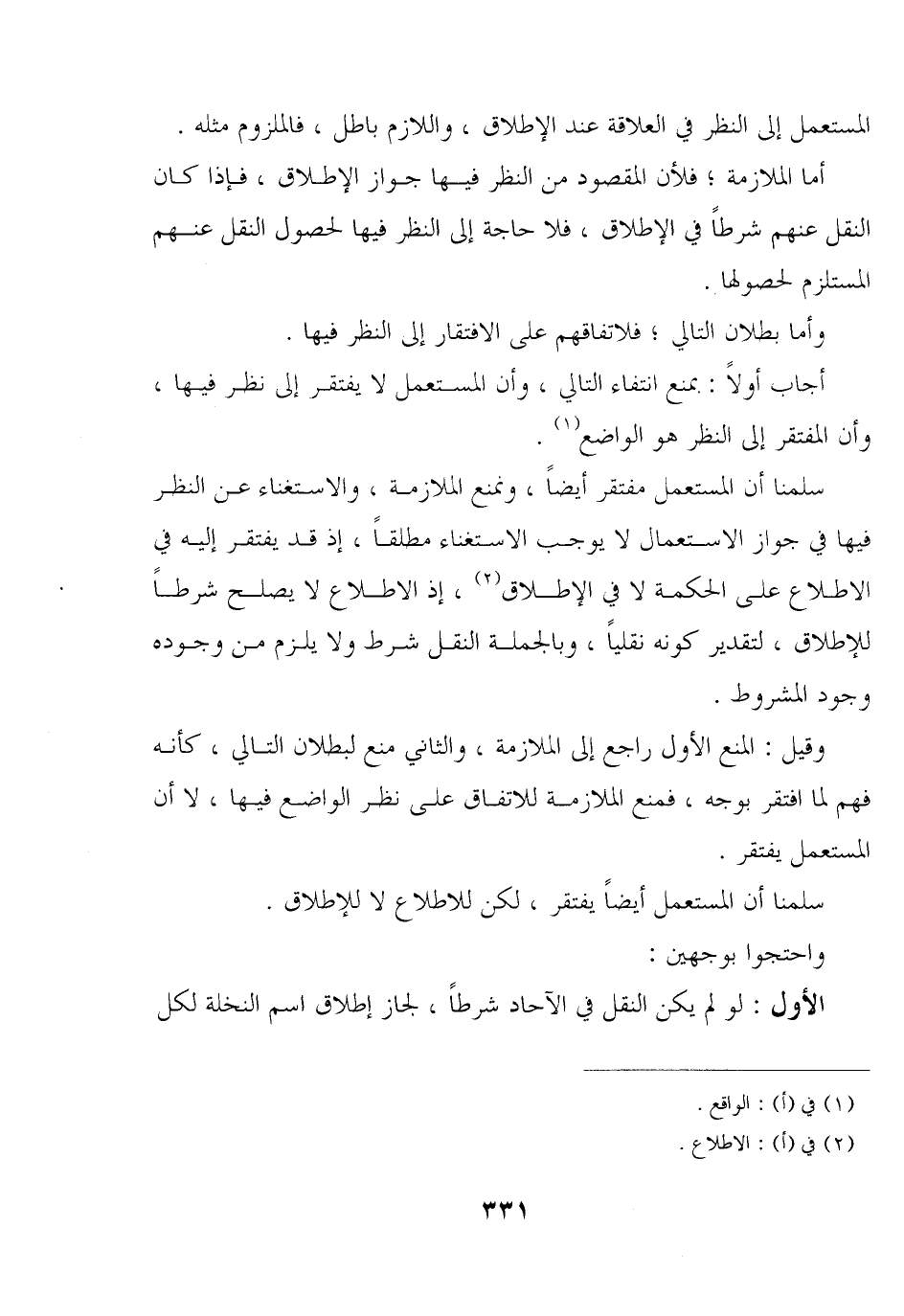 المستعمل إلى النظر في العلاقة عند الإطلاق, واللازم باطل, فالملزوم مثله.
