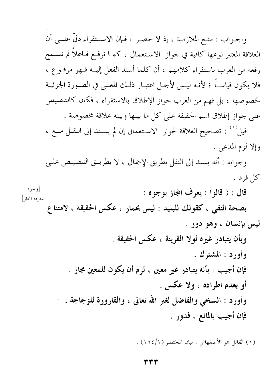 والجواب: منع الملازمة, إذ لا حصر, فإن الاستقراء دل على أن العلاقة المعتبر نوعها كافية في جواز الاستعمال, كما نرفع فاعلًا لم نسمع رفعه من العرب باستقراء كلامهم, أن كلما أسند الفعل إليه فهو مرفوع, فلا يكون قياسًا؛ لأنه ليس لأجل اعتبار ذلك المعنى في الصورة الجزئية لخصوصها, بل فهم من العرب جواز الإطلاق بالاستقراء, فكان كالتنصيص على جواز إطلاق اسم الحقيقة على كل ما بينها وبينه علاقة مخصوصة.