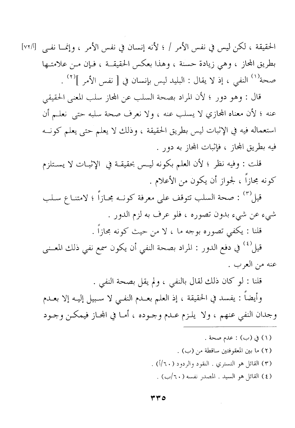 قال: وهو دور؛ لأن المراد بصحة السلب عن المجاز سلب المعنى الحقيقي عنه؛ لأن معناه المجازي لا يسلب عنه, ولا نعرف صحة سلبه حتى نعلم أن استعماله فيه في الإثبات ليس بطريق الحقيقة, وذلك لا يعلم حتى يعلم كونه فيه بطريق المجاز, فإثبات المجاز به دور.