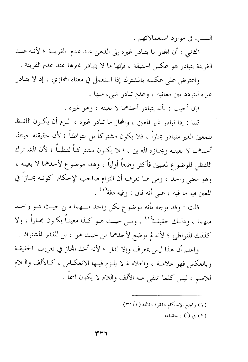 قلنا: إذا تبادر غير المعين, والمجاز ما تبادر غيره, لزم أن يكون اللفظ للمعين الغير متبادر مجازًا, فلا يكون مشتركًا بل متواطئًا؛ لأن حقيقته حينئذ أحدهما لا بعينه ومجازه المعين, فلا يكون مشتركًا لفظيًا؛ لأن المشترك اللفظي الموضوع لمعنيين فأكثر وضعًا أوليًا, وهذا موضوع لأحدهما لا بعينه, وهو معنى واحد, ومن هنا تعرف أن التزام صاحب الإحكام كونه مجازًا في المعين فيه ما فيه, على أنه قال: وفيه دقة.