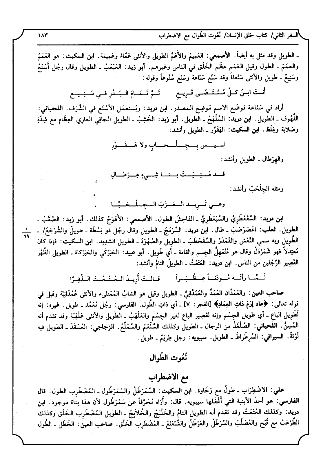 الطَّوِيل وَقد مثل بِهِ أَيْضا، الْأَصْمَعِي، العِمِيم والأَعَمُّ، الطَّوِيل وَالْأُنْثَى عَمَّاءُ وعَمِيمة، ابْن السّكيت، هُوَ العَمَمُ والعمَمَ الطول وَقيل العَمَم عِظَم الخَلْق فِي النَّاس وَغَيرهم، أَبُو زيد، العَبْعَبُ الطَّوِيل وَقَالَ رجُل أَسْنَعُ وسَنِيعٌ، طَوِيل وَالْأُنْثَى سَنْعاءُ وَقد سَنُع سَنَاعة وسَنَع سُنُوعاً وَقَوله: أَنتَ ابنُ كلِّ مُنْتَصىً قَرِيعِ تَمَّ تَمَامَ البَدْرِ فِي سَنِيع أَرَادَ فِي سَنَاعة فَوضع الِاسْم مَوضِع الْمصدر، ابْن دُرَيْد، ويُسْتَعمل الأسْنَع فِي الشَّرَف، اللحياني، اللُّهُوف الطَّوِيل، ابْن دُرَيْد، السَّلْهَجُ الطَّوِيل، أَبُو زيد، الخَشِبُ الطَّوِيل الجافِي العارِي العِظَام مَعَ شِدَّةٍ وصَلابة وغِلَظ ابْن السّكيت، الهَقَوَّر، الطَّوِيل وَأنْشد: لَيْسَ بِجِلْحابٍ وَلَا هَقَوَّرِ والهِرْطال الطَّوِيل وَأنْشد: قد مُنِيَتْ بِنَا شِيءٍ هِرْطالِ وَمثله الجِلْحَبُّ وَأنْشد: وَهِي تُرِيد العَزَبَ الجِلْجَبَّا ابْن دُرَيْد السَّقَعْطَرِيُّ السَّبَعْطَرِيُّ، الفاحِشُ الطول، الْأَصْمَعِي، الأهْوَجُ كَذَلِك، أَبُو زيد، الصَّقَبُ الطَّوِيل، ثَعْلَب، اعْصَوْصَبَ طَال، ابْن دُرَيْد، السَّرْمَجُ الطَّوِيل وَقَالَ رجُل ذُو بَسْطَة، طويلٌ والشَّرْجَعُ الطَّوِيل وَبِه سمي الثَّعْش والقَمْدَرُ والسَّقَحْطَبُ الطَّوِيل والصَّهْوَدُ، الطَّوِيل الشَّديد، ابْن السّكيت، فَإِذا كَانَ مُعتدِلاً فَهُوَ شَمَرْدَلٌ وَقَالَ: هُوَ مُتْمَهِلُّ الجِسم والقامة أَي طَوِيل، أَبُو عبيد، الحَبَرْكَى والحَبَرْكاة الطَّوِيل الظَّهْر القَصِير الرِّجْلين من النَّاس، ابْن دُرَيْد، العُتْعُتُ الطويلُ التامُّ وَأنْشد: لَمَّا رأتْه مُودَناً عِظْيَراً قالتْ أُرِيدُ العُتْعُتَ الذِّفِرَّا صَاحب الْعين، العُمُدُّ والعُمُدَّانُ والعُمُدَّانِيُّ، الطَّوِيل وَقيل هُوَ الشابُّ المُمْتلئ وَالْأُنْثَى عُمُدّانِيَّة وَقيل فِي قَوْله تَعَالَى: (عَاد إرَمَ ذاتِ العِمَاد) أَي ذاتِ الطُّول، الْفَارِسِي، رجُل مُعَمَّد طَوِيل، غَيره، إِنَّه لَطَوِيل الباعِ، أَي طَوِيل الجِسْم وَإنَّهُ لقَصِير الباع لغير الجِسْم والعَلْهَبُ، الطَّوِيل وَالْأُنْثَى عَلْهَبَة وَقد تقدم أَنه المُسِنُّ، اللحياني، الصِّلْغَدُّ من الرِّجَال الطَّوِيل وَكَذَلِكَ السَّلْعَمُ والسَّمَلَّعُ، الزجاجي، العُسْقُدُ الطَّوِيل فِيهِ لَوْثةٌ، السيرافي، السِّرِطْراطُ الطَّوِيل، سِيبَوَيْهٍ، رجل طِرْيَمٌ، طَوِيل.