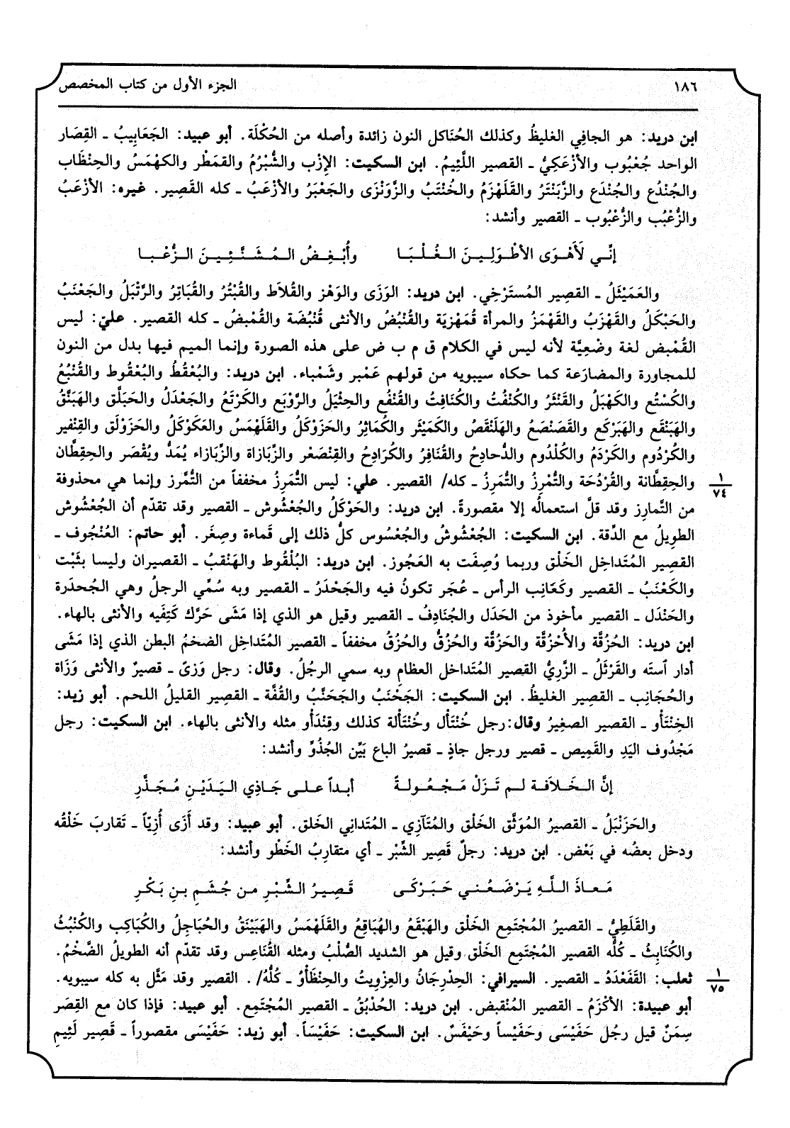 ابْن دُرَيْد، هُوَ الجافِي الغليظُ وَكَذَلِكَ الحُنَاكل النُّون زَائِدَة وَأَصله من الحُكْلَة، أَبُو عبيد، الجَعَابِيبُ القِصَار الْوَاحِد جُعْبُوب والأزْعَكِيُّ الْقصير اللَّئِيم، ابْن السّكيت، الأزِب والشُّبْرُمُ والقمَطْر والكهْمَسُ والحِنْظَاب والجُنْدُع والجُنْدَع والزَّبَنْتَرُ والقَلَهْزَمُ والخُنْتَبُ والزَّوَنْزَي والجَعْبَرُ والأزْعَبُ، كُله القَصِير، غَيره، الأزْعَبُ والزُّعْبُب والزُّعْبُوب الْقصير وَأنْشد: إنِّي لأَهْوَى الأطْوَلِينَ الغُلْبَا وأُبْغِضُ المُشَنِّئينَ الزُّعْبا والعَمَيْثَلُ القصِير المُسْتَرْخِي، ابْن دُرَيْد، الوَزَى والوَهْز والقُلاط والقُبْتُرُ والقُبَاتِرُ والرَّتْبَلُ والجَعْنَبُ والحَبْكَلُ والقَهْزَبُ والقَهْمَزُ وَالْمَرْأَة قُمَهْزيَة والقُنْبُضُ وَالْأُنْثَى قُنْبُضَة والقُمْبضُ كُله الْقصير عَليّ: لَيْسَ القُمْبض لُغَة وضعية لِأَنَّهُ لَيْسَ فِي الْكَلَام ق م ب ض، على هَذَا الصُّورَة وَإِنَّمَا الْمِيم فِيهَا بدل من النُّون للمجاورة والمضارعة كَمَا حَكَاهُ سِيبَوَيْهٍ من قَوْلهم عَمْبر وشَمْباء، ابْن دُرَيْد، والبُعْقُطُ والبُعْقُوط والقُنْبُعُ والكُتْعُ والكَهْبَلُ والقَنْثَرُ والكُنْفُثُ والكُنَافِثُ والقُنْفُع والحِثْيَلُ والرَّوْبَع والكَرْتَعُ والجَعْدَلُ والحَبَلَّق والهَبَنَّقُ والهَبَنّقَع والهَبَرْكَع والقَصَنْصَعُ والهَلَنْقَصُ والكَمَيْثَر والكُمَاثِرُ والحَزَوْكَلُ والقَلهْمَسُ والعَكَوْكَلُ والحَزَوْلَق والقِنْفِير والكُرْدُوم والكَرْدَمُ والكُلْدُوم والدُّحادِحُ والقُنَافِرُ والكُرَادِحُ والقِنْصَعُر والزِّبَازاة والزِّبازَاء يُمَدُّ ويُقْصَر والحِقِطَّان والحِقِطَّانة والقُرْدُحَة والتُّمّرِزُ والتُّمَرِزُ كُله الْقصير، عَليّ: لَيْسَ التُّمَرِزُ مخففاً من التُّمَّرز وَإِنَّمَا هِيَ محذوفة من التُّمارِز وَقد قلّ اسْتِعْمَاله إِلَّا مَقْصُورا، ابْن دُرَيْد، والحَوْكَلُ والجُعْشُوش الْقصير وَقد تقدم أَن الجُعْشُوش الطويلُ مَعَ الدِّقة، ابْن السّكيت، الجُعْشُوشُ والجُعْسُوس كل ذَلِك إِلَى قَماءة وصِغَر، أَبُو حَاتِم، العُنْجُوف الْقصير المُتَداخِل الخَلْق وَرُبمَا وصفت بِهِ العَجُوز، ابْن دُرَيْد، البُلْقُوط والهَنْقبُ القصيران وليسا بثبت والكَعْنَبُ، الْقصير وكَعَانِب الرَّأْس عُجَر تكون فِيهِ والحَجْدَرُ الْقصير وَبِه سمي الرجل وَهِي الحجْدَرة والحَنْدَل الْقصير مَأْخُوذ من الحَدَل والجُنَادِفُ الْقصير وَقيل هُوَ الَّذِي إِذا مَشى حرك كَتِفَيه وَالْأُنْثَى بِالْهَاءِ، ابْن دُرَيْد، الحُزُقَّة والأُحْزُقَّة والحَزُقَّة والحُزُقُّ والحُزُقُ مخففاً الْقصير المتداخل الضخم الْبَطن الَّذِي إِذا مَشى أدَار اسْتَه والقَرْثَلُ الزَّرِيُّ الْقصير المُتَداخل الْعِظَام وَبِه سمي الرُجُل، وَقَالَ، رجل وَزىً قصير وَالْأُنْثَى وَزَاة والحُجَانِب، القصِير الغليظ، ابْن السّكيت الحَجْنَبُ والحَجنَّبُ والقُفَّة القصِير القليلُ اللَّحْم، أَبُو زيد، الخِنْتَأْو الْقصير الصغِيرُ، وَقَالَ، رجل خُنْتَأْل وخُنْتَأْلة كَذَلِك وقِنْدَأْوٌ مثله وَالْأُنْثَى بِالْهَاءِ، ابْن السّكيت، رجل مَجْدُوف اليَدِ والقَمِيص قصير وَرجل جاذٍ، قصير الباع بيّن الجُذُوِّ وَأنْشد: إنَّ الخِلافة لم تَزَلْ مَجْعُولةً أبدا على جَاذِي اليدَيْنِ مُجَذَّرِ والحَزَنْبَلُ القصيرُ المُوَثَّق الخَلْق والمُتَآزِي المُتَدانِي الخَلق، أَبُو عبيد، وَقد أَزَى أُزِيّاً تَقاربَ خَلْقُه وردخل بعضه فِي بعض، ابْن دُرَيْد، رجلٌ قَصِير الشِّبْر أَي مُتَقَارب الخَطُو وَأنْشد: مَعاذَ اللهِ يَرْضَعُني حَبَكْرَي قَصِيرُ الشِّبْرِ من جُشَمِ بن بَكْرِ والقَلَطِيُّ القصيرُ المُجْتَمِع الخَلْق والهَبْقَعُ والهُبَاقِعُ والقَلْهَمسُ والهَبَيْنَقُ و