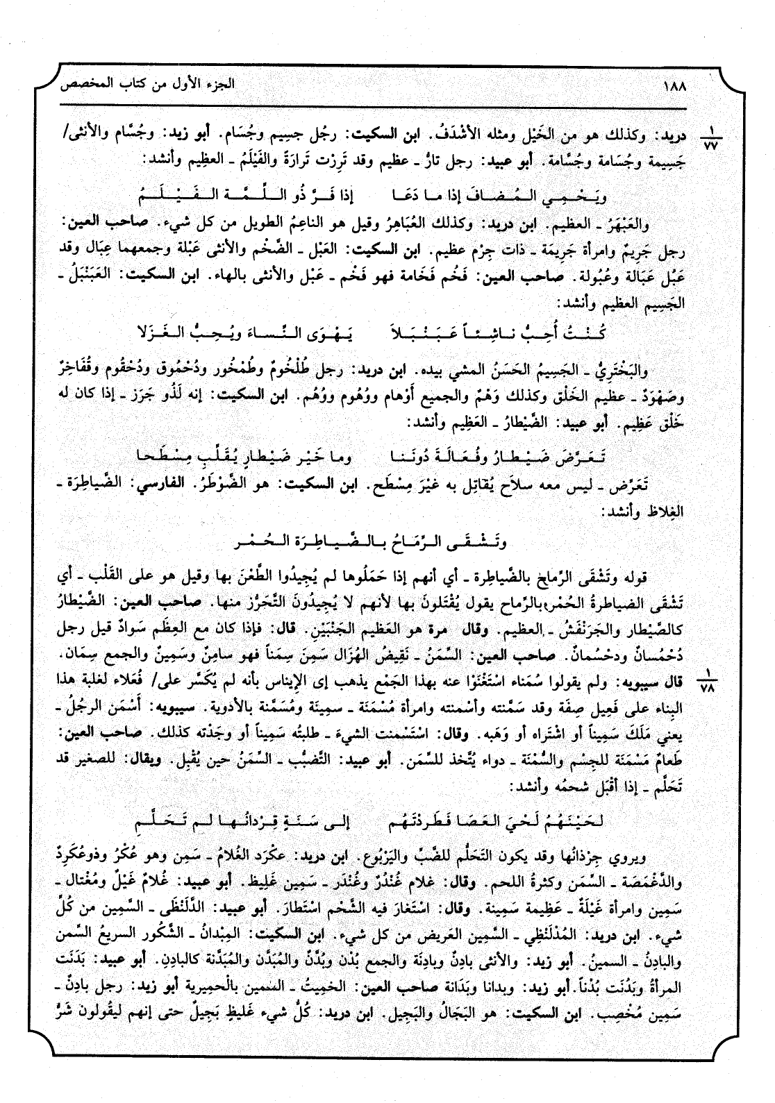 دُرَيْد، وَكَذَلِكَ هُوَ من الخَيْل وَمثله الأشْدَفُ، ابْن السّكيت، رجُل جَسِيم وجُسَام، أَبُو زيد، وجُسَّام وَالْأُنْثَى جَسِيمة وجُسَامة وجُسَّامة، أَبُو عبيد، رجل تارُّ عَظِيم وَقد تَرِرْت تَرارَةً والفَيْلَمُ العظِيم، وَأنْشد: ويَحْمِي المُضافَ إِذا مَا دَعَا إِذا فَرَّ ذُو اللِّمَّة الفَيْلَمُ والعَبْهَرُ الْعَظِيم، ابْن دُرَيْد، وَكَذَلِكَ العُبَاهِرُ وَقيل هُوَ الناعِمُ الطَّوِيل من كل شَيْء، صَاحب الْعين، رجل جَرِيمٌ وَامْرَأَة جَرِيمَة، ذَات جِرْم عَظِيم، ابْن السّكيت، العَبْل الضَّخْم وَالْأُنْثَى عَبْلة وجمعهما عِبَال وَقد عَبُل عَبَالة وعُبُولة، صَاحب الْعين، فَخُم فَخَامة فَهُوَ فَخْم عَبْل وَالْأُنْثَى بِالْهَاءِ، ابْن السّكيت، العَبَنْبَلُ الجسيم الْعَظِيم وَأنْشد: كُنْتُ أحبُّ ناشِئاً عَبَنْبَلاً يَهْوَى النِّساء ويُحِبُّ الغَزَلا والبَخْتَرِيُّ الجَسِيمُ الحَسَنُ الْمَشْي بِيَدِهِ، ابْن دُرَيْد، رجل طُلْخُومٌ وطُمْخُور ودُحْمُوق ودُحْقُوم وقُفَاخِرٌ وصَهْوَدٌ، عَظِيم الخَلْق وَكَذَلِكَ وَهْمٌ والجميع أَوْهام ووُهُوم ووُهُم، ابْن السّكيت، إِنَّه لَذُو جَرَز إِذا كَانَ لَهُ خَلْق عَظِيم، أَبُو عبيد، الضَّيْطارُ الْعَظِيم وَأنْشد: تَعَرَّضَ ضَيْطارُ وفُعَالَة دُونَنا وَمَا خَيْر ضَيْطارٍ يُقَلِّب مِسْطَحا تَعَرَّض لَيْسَ مَعَ سِلاح يُقاتِل بِهِ غيْرَ، مِسْطَح، ابْن السّكيت، هُوَ الضَّوْطَرُ، الْفَارِسِي، الضَّياطِرَة الغِلاظ وَأنْشد: وتَشْقَى الرِّمَاحُ بالضَّياطِرَة الحُمْر قَوْله وتَشْقَى الرِّماح بالضَّياطِرة أَي أَنهم إِذا حَمَلُوها لم يُجِيدُوا الطَّعْنَ بهَا وَقيل هُوَ على القَلْب أَي تَشْقَى الضياطرةُ الحُمْر بالرِّماح يَقُول يُقْتَلونَ بهَا لأَنهم لَا يُجِيدُونَ التَّحَرُّ زَمَنهَا، صَاحب الْعين، الضَّيْطارُ كالصّيطار والجَرَنْفَشُ الْعَظِيم، وَقَالَ: مرّة هُوَ العَظيم الجَنْبَيْنِ، قَالَ: فَإِذا كَانَ مَعَ العِظَم سَوادٌ قيل رجل دُحْمُسانٌ ودُحْسُمانٌ، صَاحب الْعين، السِّمَنُ نَقِيضُ الهُزَال سَمِنَ سِمَناً فَهُوَ سامِنٌ وسَمِينٌ وَالْجمع سِمَان، قَالَ سِيبَوَيْهٍ: وَلم يَقُولُوا سُمَناء اسْتَغْنَوْا عَنهُ بِهَذَا الْجمع يذهب إِلَى الإيناس بِأَنَّهُ لم يُكَسَّر على فُعَلاء لغَلَبَة هَذَا الْبناء على فَعِيل صفة وَقد سَمَّنته وأسْمنته وَامْرَأَة مُسْمَنَة سمِيَنة ومُسَمَّنة بالأدوية سِيبَوَيْهٍ، أَسْمَن الرجُلُ يَعْنِي مَلَكَ سَمِيناً أَو اشْتَراه أَو وَهَبه، وَقَالَ اسْتَسْمنت الشَّيْء طلبته سَمِيناً أَو وجَدْته كَذَلِك، صَاحب الْعين، طَعامٌ مَسْمَنَة للجِسْم والسُّمْنَة دَوَاء يتَّخذ للسِّمَن، أَبُو عبيد، التَّضبُّب السِّمَنُ حِين يقبل وَيُقَال للصَّغِير قد تَحَلَّم إِذا أقْبَل شحمُه وَأنْشد: لَحْيَنُهُم لَحْيَ العَصَا فَطَردْتَهُم إِلَى سَنَةٍ قِرْدانُها لم تَحَلَّمِ ويروى جِرْذانُها وَقد يكون التَحَلُّم للضَّبِّ واليَرْبُوع، ابْن دُرَيْد، عكْرَد الغُلامُ سَمِن وَهُوَ عُكْرُ ودوعُكَرِدٌ والدُّغْمَصَة السِّمَن وكثرةُ اللَّحْم، وَقَالَ: غُلَام غُنْدُرٌ وغُنْدَر، سَمِين غَلِيظ، أَبُو عبيد، غُلامٌ غَيْلٌ ومُغْتال سَمِين وَامْرَأَة غَيْلَةٌ عَظِيمَة سَمِينة وَقَالَ: اسْتَغارَ فِيهِ الشَّحْم، اشْتَطارَ. أَبُو عبيد، الدَّلَنْظَي السَّمِين من كُل شَيْء، ابْن دُرَيْد، المُدْلَنْظِي السَّمِين العَريض من كل شَيْء، ابْن السّكيت، المِبْدانُ الشَّكُور السريعُ السِّمن والبادِنُ السمين، أَبُو زيد، وَالْأُنْثَى بادِنٌ وبادِنَة وَالْجمع بُدْن وبُدَّنٌ والمُبَدَّن والمُبَدَّنة كالبادِنِ، أَبُو عبيد، بَدَنَت المرأةُ بَدُنَت بُدْناً، أَبُو زيد، وبَدَاناً وبَدَانَة، صَاحب الْعين، الخَمِيتُ، السمين بالحِمْيَرِيَّة، أَبُو زيد، رجل بادِنٌ، سَمِين م
