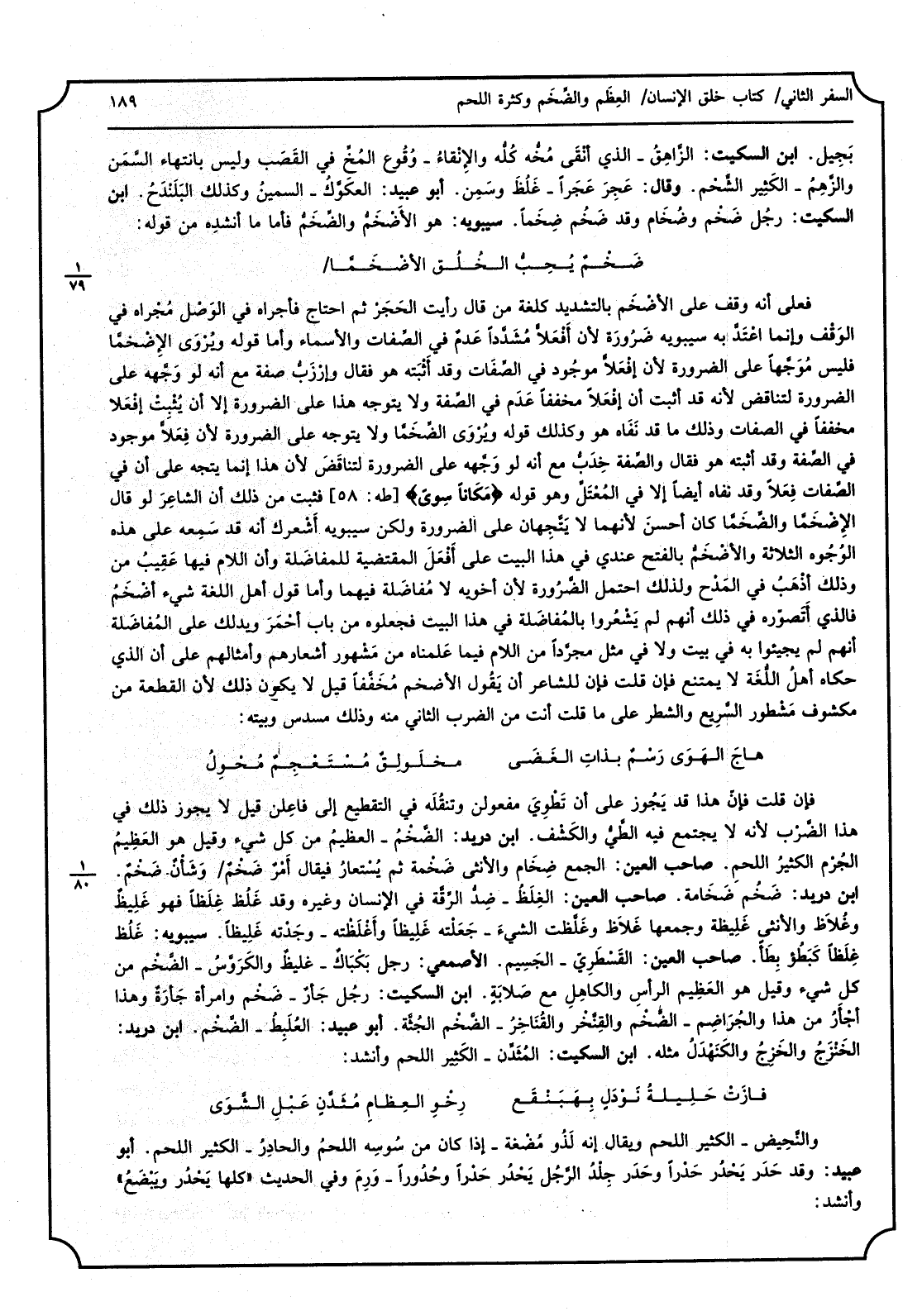 بَجِيل، ابْن السّكيت، الزَّاهِقُ الَّذِي أنْقَى مُخُّه كُله والانْقاءُ وُقُوع المُخِّ فِي القَصَب وَلَيْسَ بانتهاء السِّمَن والزَّهِمُ الكَثِير الشَّحْم، وَقَالَ: عَجِر عَجَراً غلظ وسَمِن، أَبُو عبيد، العكَوَّكُ السمينُ وَكَذَلِكَ البَلَنْدَحُ، ابْن السّكيت، رجُل ضَخْم وضُخَام وَقد ضخُم ضِخَماً، سِيبَوَيْهٍ، هُوَ الأضْخَمُّ فَأَما مَا أنْشدهُ من قَوْله: ضَخْمٌ يُحِبُّ الخُلُق الأضْخَمَّا فعلى أَنه وقف على الأضْخَمِ بِالتَّشْدِيدِ كلغة من قَالَ رَأَيْت الحَجَرْ ثمَّ احْتَاجَ فأجراه فِي الوَصْل مُجْراه فِي الوَقْف وَإِنَّمَا اعْتد بِهِ سِيبَوَيْهٍ ضَرُورَة لِأَن أَفْعَلاً مُشَدّداً عدم فِي الصِّفَات والأسماء وَأما قَوْله ويروى الأضْخمَّا فَلَيْسَ مُوَجَّهاً على الضَّرُورَة لِأَن إفْعَلاً مَوْجُود فِي الصِّفَات وَقد أثْبته هُوَ فَقَالَ وإرْزَبٌّ صفة مَعَ أَنه لَو وَجَّهه على الضَّرُورَة لتناقض لِأَنَّهُ قد أثبت أَن إفْعَلاً مخففاً عدم فِي الصّفة وَلَا يتَوَجَّه هَذَا على الضَّرُورَة إِلَّا أَن يثبت إفْعَلاً مخففاً فِي الصِّفَات وَذَلِكَ مَا قد نَفَاه هُوَ وَكَذَلِكَ قَوْله ويُرْوَى الضِّخَمَّا وَلَا يتَوَجَّه على الضَّرُورَة لِأَن فِعَلاً مَوْجُود فِي الصِّفة وَقد أثْبته هُوَ فَقَالَ والصِّفة خِدَبٌ مَعَ أَنه لَو وَجَّهه على الضَّرُورَة لتناقَضَ لِأَن هَذَا إِنَّمَا يتَّجه على أَن فِي الصِّفَات فِعَلاً وَقد نَفَاهُ أَيْضا إِلَّا فِي المُعْتَلِّ وَهُوَ قَوْله مَكَاناً سِوىً فَثَبت من ذَلِك أَن الشَّاعِر لَو قَالَ الأضْخَمَّا والضِّخَمَّا كَانَ أحسن أَنَّهُمَا لَا يَتَّجِهان على الضَّرُورَة وَلَكِن سِيبَوَيْهٍ أشعرك أَنه قد سَمعه على هَذِه الْوُجُوه الثَّلَاثَة والأضْخَمُ بِالْفَتْح عِنْدِي فِي هَذَا الْبَيْت على أَفْعَلَ الْمُقْتَضِيَة للمفاضَلة وَأَن اللَّام فِيهَا عقيب من وَذَلِكَ أَذْهَبُ فِي المَدْح وَلذَلِك احْتمل الضَّرُورَة لِأَن أَخَوَيْهِ لَا مُفاضَلة فيهمَا وَأما قَول أهل اللُّغَة شَيْء أضْخَمُ فَالَّذِي أتصوّره فِي ذَلِك أَنهم لم يشعروا بالمفاضلة فِي هَذَا الْبَيْت فجعلوه من بَاب أَحْمَرَ ويدلك على المفاضلة أَنهم لم يجيئوا بِهِ فِي بَيت وَلَا فِي مثل مُجَردا من اللَّام فِيمَا علمناه من مَشْهُور أشعارهم وأمثالهم على أَن الَّذِي حَكَاهُ أهل اللُّغَة لَا يمْتَنع فَإِن قلت فَإِن للشاعر أَن يوقل الأضخم مخففاً قيل لَا يكون ذَلِك لِأَن الْقطعَة من مَكْشُوف مشطور السَّرِيع والشطر على مَا قلت أَنْت من الضَّرْب الثَّانِي مِنْهُ وَذَلِكَ مسدس وبيته: هاجَ الهَوَى رَسْمٌ بذاتِ الغَضَى مخْلَوْلِقٌ مُسْتَعْجِمٌ مُحْوِلُ فَإِن قلت فَإِن هَذَا قد يجوز على أَن تَطْوِيَ مفعولن وتنقله فِي التقطيع إِلَى فاعلن قيل لَا يجوز ذَلِك فِي هَذَا الضَّرْب لِأَنَّهُ لَا يجْتَمع فِيهِ الطَّيُّ والكشف، ابْن دُرَيْد، الضَّخْمُ العظيمُ من كل شَيْء وَقيل هُوَ العَظِيمُ الجِرْم الكثيرُ اللحمِ، صَاحب الْعين، الْجمع ضِخَام وَالْأُنْثَى ضَخْمة ثمَّ يُسْتعارُ فَيُقَال أَمْرٌ ضَخْمٌ وشَأْنٌ ضَخْمٌ، ابْن دُرَيْد، ضَخُم ضَخَامة، صَاحب الْعين، الغِلَظُ ضدّ الرِّقَّة فِي الْإِنْسَان وَغَيره وَقد غَلُظ غِلَظاً فَهُوَ غَلِيظٌ وغُلاظ وَالْأُنْثَى غَلِيظة وَجَمعهَا غِلاظ وغَلَّظت الشَّيْء جَعَلْته غَلِيظاً وأَغْلَظْته وجدته غَلِيظاً، سِيبَوَيْهٍ، غَلُظ غِلَظاً كَبَطُؤ بِطَأً، صَاحب الْعين، القَسْطَرِيَ الجَسِيم، الْأَصْمَعِي، رجل بَكْبَاكٌ، غليظٌ والكرَوَّسُ الضَّخْم من كل شَيْء وَقيل هُوَ العَظِيم الرأسِ والكاهِلِ مَعَ صَلابَةٍ، ابْن السّكيت، رجل جَأْرٌ ضَخْم وَامْرَأَة جَأْرَةٌ وَهَذَا أجْأَرُ من هَذَا والجُرَاضِم الضَّخْم والقِنَّخْر والقُنَاخِرُ الضَّخْم الجُثَّة، أَبُو عبيد، العُلَبِطُ الضَّخْم، ابْن دُرَ