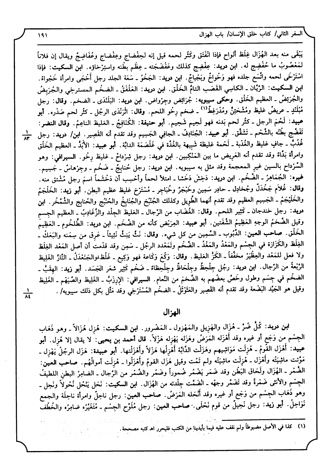 يبْقى مِنْهُ بعد الهُزَال غِلضظ أَلْوَاح فَإِذا انْفَتَق وكثرُ لَحْمه قيل إِنَّه لِحْفضاج وعِفْضاج وعُفَاضِجٌ وَيُقَال إِن فلَانا لَمْعُصوبٌ مَا حُفْضِج لَهُ، ابْن دُرَيْد، عِفْضِج كَذَلِك وعَفْضَجَته عِظَم بَطْنه واسترخاؤه، ابْن السّكيت، فَإِذا استرخى لَحْمه واتَّسَع جلده فَهُوَ وَخْواخٌ وبَجْباجٌ، ابْن دُرَيْد، الجَخْوُ سَعَة الْجلد رجل أَجْخَى وَامْرَأَة جَخْواءُ، ابْن السّكيت، الرَّيّان الكاسي القَصَب التامّ الخَلْق، ابْن دُرَيْد، العَلْفَقُ الضخْم المسترخي والجُرَبِضُ والجُرَئِضُ الْعَظِيم الخَلْق، وَحكى سِيبَوَيْهٍ، جُرَائِض وجِرْواض، ابْن دُرَيْد، البَلَنْدَى، الضخم وَقَالَ: رجل مُبْلَنْدٍ، عريضٌ غليظ ومُشْحَئِنٌّ ومُدْرَغِطٌ ضخم رخو اللَّحْم، وَقَالَ: اثْرَنْدَي الرجُل كثُر لحم صَدْره، أَبُو عبيد، لَحُمَ الرجل، كثُر لحم بدَنه فَهُوَ لَحِيم شَحِيم، أَبُو حنيفَة، الكُنَافِجُ الغليظ الناعِمُ وَقَالَ النَّضر: تَفَضَّج بَطْنه بالشَّحْم تَشَقَّق، أَبُو عبيد، الجُنَادِفُ الجافِي الجَسِيم وَقد تقدم أَنه القَصِير، ابْن دُرَيْد، رجل غُدُبٌّ جافٍ غليظ والغُدْبة لَحْمة غَلِيظَة شَبيهَة بالغُدَّة فِي غَلْصَمَة الدابّة، أَبُو عبيد، الأَبَدُّ الْعَظِيم الخَلْق وَامْرَأَة بَدَّاءُ وَقد تقدم أَنه العَرِيض مَا بَين المَنْكبين، ابْن دُرَيْد، رجل شِرْادحٌ غليظ رِخْو، السيرافي، وَهُوَ السِّرْداح بِالسِّين غير الْمُعْجَمَة وَقد مثل بِهِ سِيبَوَيْهٍ، ابْن دُرَيْد، رجل حُنابِجٌ ضَخْم وجِرْهاسٌ جسيم، غَيره، الجُمَاهِرُ الضَّخْم، ابْن دُرَيْد، دَخِشَ دَخَشاً امْتَلَأَ لَحْمًا وأحْسِب أَن دَخْشَماً اسْم رجل مُشْتَقّ مِنْهُ، وَقَالَ: غُلام جَخْدَلٌ وجُخَادِل حادِر سَمِين وخَبْجَرٌ وخُبَاجِر مُسْتَرْخ غليظ عَظِيم الْبَطن، أَبُو زيد، الخَلْجَمُ والخَلَيْجَمُ الجَسِيم الْعَظِيم وَقد تقدم أَنَّهُمَا الطَّوِيل وَكَذَلِكَ الجُنْبُخ والجُنَابِخُ والحُنْبُج والحنُابِج والشُّمَّخْر، ابْن دُرَيْد، رجل خندجان كثير اللَّحْم وَقَالَ: الغُضَاب من الرِّجال الغليظ الجِلْد والزُّغَادِبُ الْعَظِيم الجسمِ وَقيل الضخم الْوَجْه الْعَظِيم الشَّفَتين، أَبُو عبيد، العِرَبْض كَأَنَّهُ من الضِّخَم، ابْن دُرَيْد، الطُّلخُوم، الْعَظِيم الْخلق، صَاحب الْعين، الدَّبُوب السَّمِين من كل شَيْء، وَقَالَ: نَثَّ يَنِثُّ نَثِيثاً عَرِق من سِمَنه والبَعَكُ الغِلَظ والكَزَازة فِي الجِسْم والمَعْدُو والمَغْدُ الضَّخْم وتَمَعْدد الرجُل سَمِن وَقد قدمت أَن أصل المَعْد الغِلَظ وَلَا فعل للمَعْد والعِظْيَرُ مخففاً الكَزُّ الغليظ، وَقَالَ: وَكُعَ وَكَاعة فَهُوَ وَكِيع، غَلُظ والجَنَعْدَلُ التَّارُّ الغليظ الرَّبْعةُ من الرِّجَال، ابْن دُرَيْد، رجل جِلْحِظٌ وجِلْحَاظٌ وجِلْحِظاءٌ ضخم كثير شعَر الجَسَد، أَبُو زيد، الهِقَبُّ الضخْم فِي جِسَم وطُول وخصَّ بَعضهم بِهِ الضَّخم من النَّعام، السيرافي، الإرْزَبُّ الغَلِيظ والصِّيهَمْ الغليظ وَقيل هُوَ الجَيِّد البَضْعة وَقد تقدم أَنه القَصِير والعَثَوْثَلُ الضخْم المُسْتَرخِي وَقد مثَّل بِكُل ذَلِك سِيبَوَيْهٍ.
