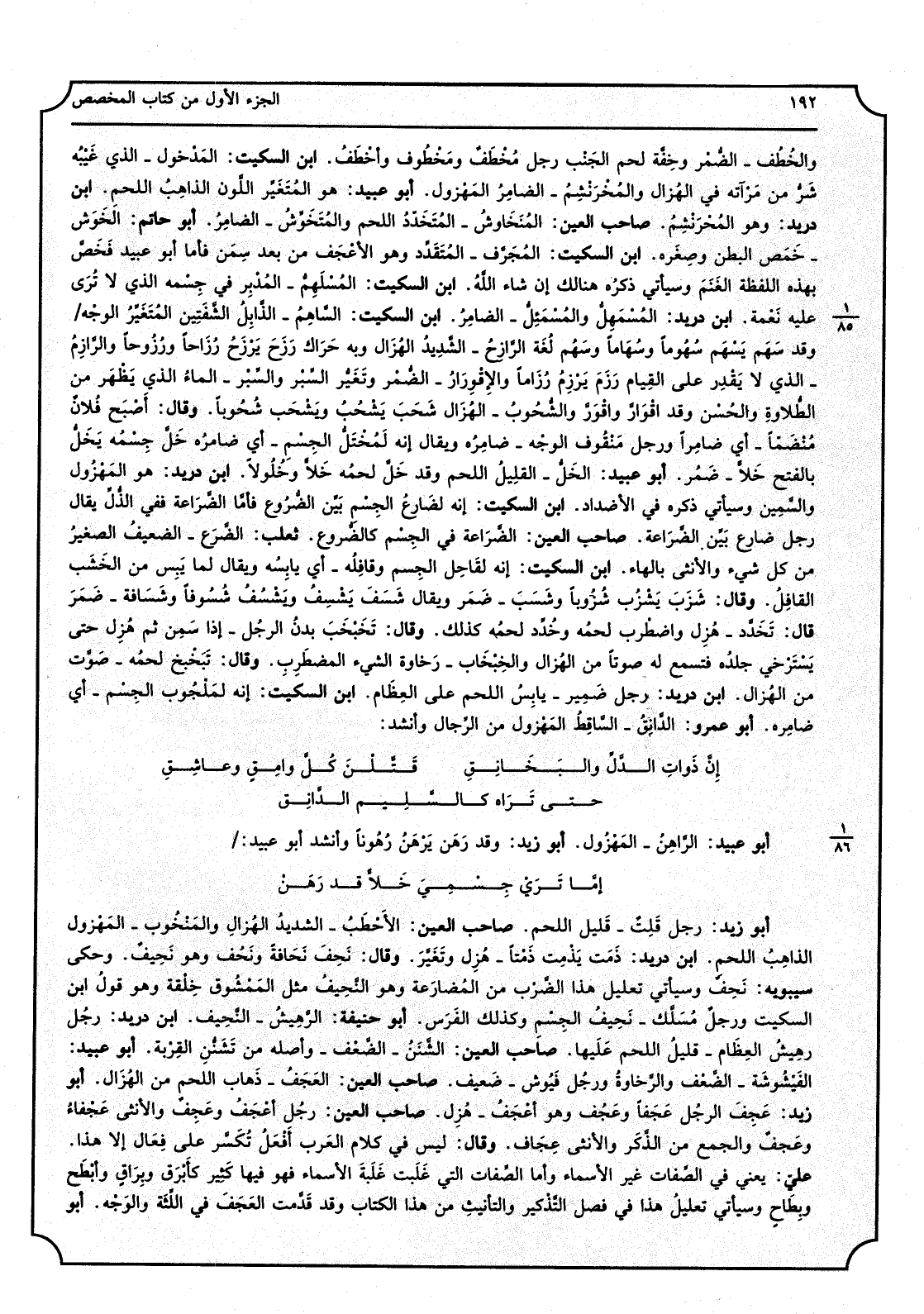 والخُطُف الضُّمْر وخِفَّة لحم الجَنْب رجل مُخْطَفٌ ومَخْطُوف وأخْطَفُ، ابْن السّكيت، المَدْخول الَّذِي غَيْبُه شَرٌّ من مَرْآته فِي الهُزال والمُخْرَنِشْمُ الضامر المَهْزول، أَبُو عبيد، هُوَ المتنغير اللَّوْن الذَّاهِب اللَّحْم، ابْن دُرَيْد، وَهُوَ المُحْرَنِشْمُ، صَاحب الْعين، المُتَخَاوِشُ المُتَخَدّدُ اللَّحْم والمُتَخَوِّشُ الضامِرُ، أَبُو حَاتِم، الخَوَش خَمَص الْبَطن وصغره، ابْن السّكيت، المُجَرَّف المُتَقَدِّد وَهُوَ الأعْجَف من بعد سِمَن فَأَما أَبُو عبيد فَخص بِهَذِهِ الفظة الغَنَم وَسَيَأْتِي ذكره هُنَالك إِن شَاءَ الله، ابْن السّكيت، المُسْلَهِمُّ المُدْبِر فِي جِسْمه الَّذِي لَا ترى عَلَيْهِ نَعْمة، ابْن دُرَيْد، المُسْمَهِلُّ والمُسْمَئِلُّ الضامَرُ، ابْن السّكيت، السَّاهِمُ الذَّابِلُ الشَّفَتين الْمُتَغَيّر الْوَجْه وَقد سَهَم يَسْهَم سُهُوماً وسُهَاماً وسَهُم لُغَة الرَّازِحُ الشَّديد الهُزَال وَبِه حَرَاك رَزَحَ يَرْزَحُ رُزَاحاً ورُزُوحاً والرَّازِمُ الَّذِي لَا يقدر على الْقيام رَزَمَ يَرْزِمُ رُزَاماً والإقْوِرَارُ الضُّمْر وَتغَير السِّبْر والسِّبْر، المَاء الَّذِي يظْهر من الطُّلاوة والحُسْن وَقد اقْوَارَّ واقْوَرَّ والشُّحُوبُ الهُزَال شَحَبَ يَشْحُبُ ويَشْحَب شُحُوباً، وَقَالَ: أصبح فلَان مُنْضَمَّاً أَي ضامراً وَرجل مَنْقُوف الْوَجْه ضامْرُه، وَيُقَال إِنَّه لمختلُّ الجِسْمِ أَي ضامره خَلَّ جِسْمُه يَخَلُّ بِالْفَتْح خَلاً ضَمُر، أَبُو عبيد، الخَلُّ الْقَلِيل اللَّحْم وَقد خَلَّ لحمُه خَلاً وخُلُولا، ابْن دُرَيْد، هُوَ المَهْزُول والسَّمِين وَسَيَأْتِي ذكره فِي الأضداد، ابْن السّكيت، إِنَّه لضَارِعُ الجسْمِ بيِّن الضُّرُوع فَأَما الضَّرَاعة فَفِي الذُّل يُقَال رجل ضارِع بيِّن الضَّرَاعة، صَاحب الْعين، الضَّرَاعة فِي الْجِسْم كالضُّروع، ثَعْلَب، الضَّرَع الضعيفُ الصغيرُ من كل شَيْء وَالْأُنْثَى بِالْهَاءِ، ابْن السّكيت، إِنَّه لقَاحِل الجِسْم وقافله أَي يابسه وَيُقَال لما يَبِس من الخَشَب القافِلُ، وَقَالَ: شَزَبَ يَشْزُب شُزُوباً وشَسَبَ ضَمَر وَيُقَال شَسَفَ يَشْسِفُ ويَشْسُفُ شُسُوفاً وشَسَاقة ضَمَر قَالَ: تَخَدَّد هُزِل واضْطرب لحمُه وخدد لَحْمه كَذَلِك، وَقَالَ: تَخَبْخَبَ بدنُ الرجُل إِذا سَمِن ثمَّ هُزِل حَتَّى يَسْتَرْخي جلدُه فتمسع لَهُ صَوتا من الهُزال والخِنْجَاب رخاوة الشَّيْء المضطرب، وَقَالَ: تَبَخْبخ لحمُه صوَّت من الهُزال، ابْن دُرَيْد، رجل ضَمِير يابِسُ اللَّحْم على العِظَام، ابْن السّكيت، إِنَّه لَمْلُجوب الجِسْم أَي ضامره، أَبُو عَمْرو، الدَّانِقُ السَّاقِطُ المَهْزول من الرِّجال وَأنْشد: إنَّ ذَواتِ الدَّلِّ والبَخَانِقِ قَتَّلْنَ كُلَّ وامِقٍ وعاشِقِ حَتَّى تَرَاه كالسَّلِيم الدَّانِق أَبُو عبيد، الرَّاهِنُ المَهْزُول، أَبُو زيد، وَقد رَهَن يَرْهَنُ رُهُوناً وَأنْشد أَبُو عبيد: إمَّا تَرَىْ جِسْمِيَ خَلاً قد رَهَنْ أَبُو زيد، رجل قَلِتٌ، قَليل اللَّحْم، صَاحب الْعين، الأحْطَبُ الشديدُ الهُزال والمَنْخُوب المَهْزول الذَّاهِب اللَّحْم، ابْن دُرَيْد، ذَمَت يَذْمِت ذَمْتاً هُزِل وتغيَّرَ، وَقَالَ: نَحِفَ نَحَافةً ونَحُف وَهُوَ نَحِيفٌ وَحكى سِيبَوَيْهٍ، نَحِفٌ وَسَيَأْتِي تَعْلِيل هَذَا الضَّرْب من المضارعة وَهُوَ النَّحِيفُ مثل المَمْشُوق خِلْقة وَهُوَ قولُ ابْن السّكيت ورجلٌ مُسَلَّك نَحِيفُ الجِسْمِ وَكَذَلِكَ الفَرَس، أَبُو حنيفَة، الرَّهِيشُ النَّحِيف، ابْن دُرَيْد، رجل رهِيشُ العِظَام قَلِيل اللَّحْم عَلَيْهَا، صَاحب الْعين، الشَّنَنُ الضَّعْف وَأَصله من تَشَنُّن القِرْبة، أَبُو عبيد، الفَيْشُوشَة الضَّعْف والرَّخاوُة ورجُل فَيُوش ضَعيف، صَاحب الْعين، العَجَفُ ذَهاب اللَّحْم من الهُزَال، أَبُو زيد، عَجِفَ
