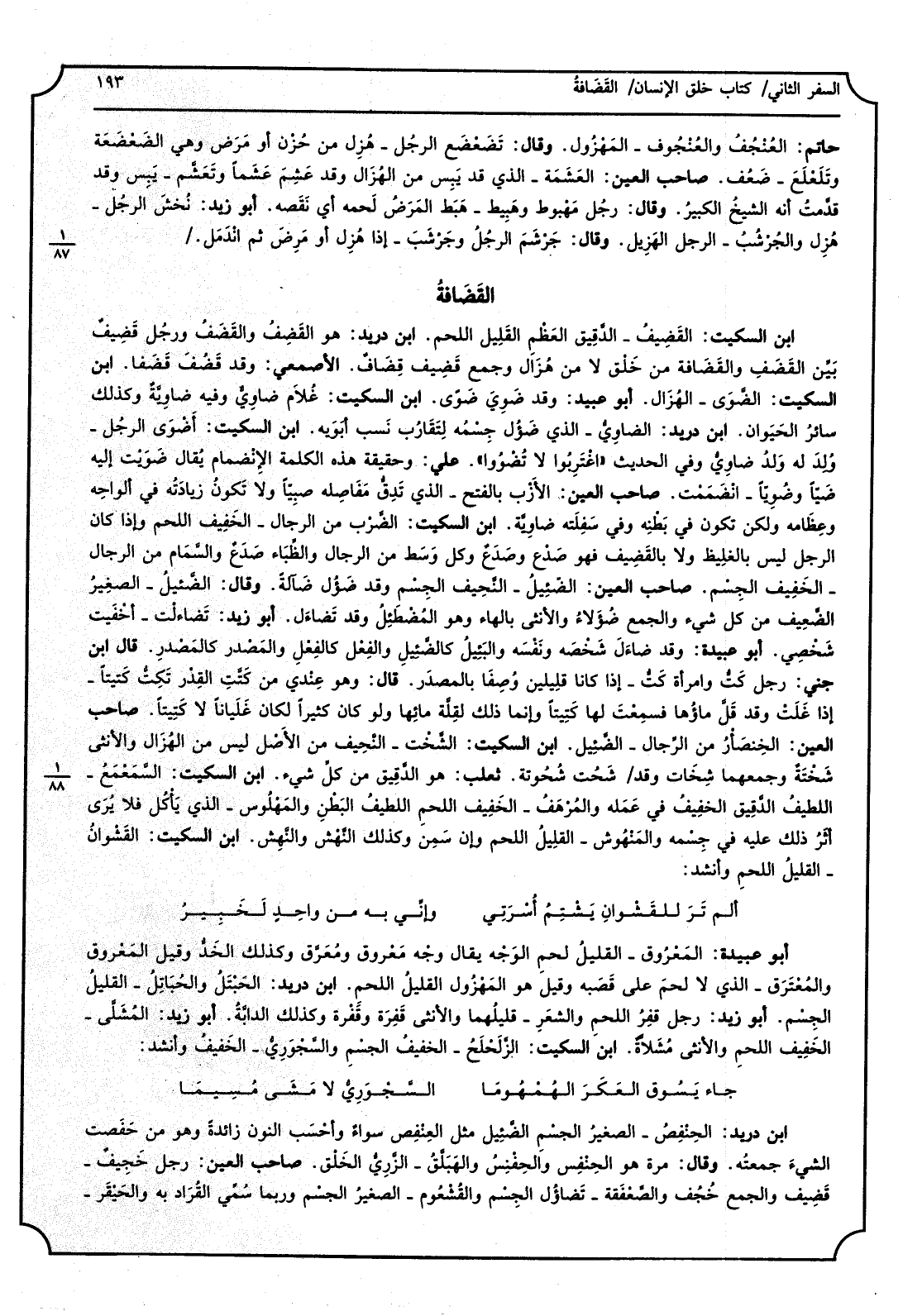 ابْن السّكيت، القَضِيفُ الدَّقِيق العَظْمِ القَلِيل اللَّحْم، ابْن دُرَيْد هُوَ القَضِفُ والقَضَفُ ورجُل قَضِيفٌ بيِّن القَضَفِ والقَضَافة من خَلْق لَا من هُزَال وَجمع قَضِيف قِضَافٌ، الْأَصْمَعِي، وَقد قَضُفَ قَضَفاً، ابْن السّكيت، الضَّوَى الهُزَال، أَبُو عبيد، وَقد ضَوِيَ ضَوىً. ابْن السّكيت، غُلام ضاوِيٌّ وَفِيه ضاوِيَّةٌ وَكَذَلِكَ سائرُ الْحَيَوَان، ابْن دُرَيْد، الضاوِيُّ الَّذِي ضَؤُل جِسْمَه لتقارب نَسب أبَوَيه، ابْن السّكيت، أَضْوَى الرجُل وُلِدَ لَهُ ولَدٌ ضاوِيٌّ وَفِي الحَدِيث اغْتَرِبُوا لَا تُضْوُوا، عَليّ، وَحَقِيقَة هَذِه الْكَلِمَة الانْضِمام يُقَال ضَوَيْت إِلَيْهِ ضَيّاً وضُوِياً انْضَمَمْت، صَاحب الْعين، الأزْب بِالْفَتْح، الَّذِي تَدِقُّ مَفَاصِله صبِيّاً وَلَا تكون زِيَادَته فِي ألواحه وعظامه وَلَكِن تكون فِي بَطْنه وَفِي سفلته ضاوِيّة، ابْن السّكيت، الضَّرْب من الرِّجَال الخَفِيف اللَّحْم وَإِذا كَانَ الرجل لَيْسَ بالغليظ وَلَا بالقَضِيف فَهُوَ صَدْع وصَدَعٌ وكل وَسَط من الرِّجَال والظِّبَاء صَدَعٌ والسَّمَام من الرِّجَال، الخَفِيف الجِسْم، صَاحب الْعين، الضَّئِيلُ النَّحِيف الجِسْم وَقد ضَؤُل ضَآلةً، وَقَالَ: الضَّئِيلُ الصغيرُ الضَّعِيف من كل شَيْء وَالْجمع ضُؤَلاءُ وَالْأُنْثَى بِالْهَاءِ وَهُوَ المُضْطَئِلُ وَقد تَضاءَل، أَبُو زيد، تَضاءلْت أخْفَيت شَخْصِي، أَبُو عُبَيْدَة، وَقد ضاءَلَ شَخْصَه وَنَفسه والبَئِيلُ وكالضَّئِيلِ والفِعْل كالفعْلِ والمصدر كالمصدر قَالَ ابْن جني: رجل كَتٌّ وَامْرَأَة كَتٌّ، إِذا كَانَا قليلين وُصِفَا بِالْمَصْدَرِ، قَالَ: وَهُوَ عِنْدِي من كَتَّتِ القِدْر تَكِتُّ كَتيتاً إِذا غَلَتْ وَقد قَلَّ ماؤُها فَسمِعت لَهَا كَتِيتاً وَإِنَّمَا ذَلِك لقلّة مائِها وَلَو كَانَ كثيرا لَكَانَ غلياناً لَا كَتِيتاً صَاحب الْعين، الخِنْصَأْرُ من الرِّجَال الضَّئِيل، ابْن السّكيت، الشَّخْت النَّحِيف من الأَصْل لَيْسَ من الهزال وَالْأُنْثَى شَخْتَةٌ وَجَمعهَا شِخَات وَقد شَحُت شُحُوتة، ثَعْلَب، هُوَ الدَّقِيق من كل شَيْء، ابْن السّكيت، السَّمَعْمَعُ اللَّطِيف الدَّقِيق الْخَفِيف فِي عمله والمُرْهَفُ الْخَفِيف الْخَفِيف اللَّحْم اللطيفُ البَطْنِ والمَهْلُوس الَّذِي يَأْكُل فَلَا يُرَى أثرُ ذَلِك عَلَيْهِ فِي جِسْمه والمَنْهُوش القليلُ اللَّحْم وَإِن سَمِن وَكَذَلِكَ النَّهْش والنَّهِش، ابْن السّكيت، القَشْوانُ الْقَلِيل اللَّحْم وَأنْشد: ألم تَرَ للقَشْوانِ يَشْتِمُ أُسْرَتِي وإنِّي بِهِ من واحدٍ لَخَبِيرُ أَبُو عُبَيْدَة، المَعْرُوق القليلُ لحم الوَجْه يُقَال وجْه مَعْروق ومُعَرَّق وَكَذَلِكَ الخَدُّ وَقيل المَعْروق والمُعْتَرَق، الَّذِي لَا لحم على قَصَبه وَقيل هُوَ المَهْزُول القليلُ اللَّحْم، ابْن دُرَيْد، الحَبْتَلُ والحُبَاتِلُ القليلُ الجِسْم، أَبُو زيد، رجل قَفِرُ اللَّحْم والشعَرِ قليلُهما وَالْأُنْثَى قَفِرَة وقَفْرة وَكَذَلِكَ الدابَّة، أَبُو زيد، المُشْلَّى الْخَفِيف اللَّحْم والانثى مُشَلاةٌ، ابْن السّكيت، الزَّلَحْلَحُ الْخَفِيف الْجِسْم والسَّجْوَرِيُّ الْخَفِيف وَأنْشد: جَاءَ يَسُوق العَكَرَ الهُمْوُمَا السَّجْوَرِيُّ لَا مَشَى مُسِيمَا ابْن دُرَيْد الحِنْفِصُ الصَّغِير الْجِسْم الضَّئِيل مثل العِنْفِص سَوَاء وأحْسَب النُّون زَائِدَة وَهُوَ من حَفَصت الشَّيْء جمعتُه، وَقَالَ مرّة: هُوَ الحِنْفِس والحِفْنِسُ والهَبَلَّقُ الزَّرِيُّ الخَلْق، صَاحب الْعين رجل خَجِيفٌ قَضِيف وَالْجمع خُجُف والصَّعْفَقة تَضاؤُل الْجِسْم والقُشْعُوم الصغيرُ الْجِسْم وَرُبمَا سمي القُرَاد بِهِ والحَيْقَر