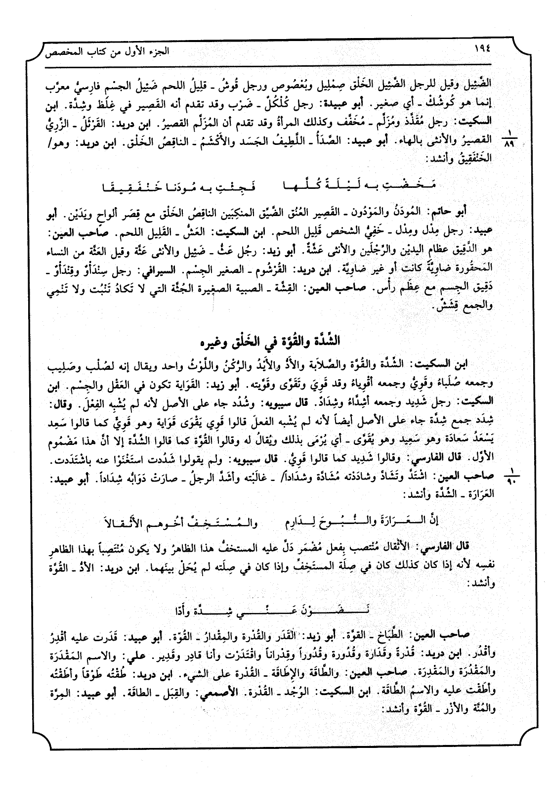 ابْن السّكيت، الشِّدَّة والقُوَّة والصَّلابَة والأَدُّ والأَيْدُ والرُّكْنُ واللَّوْثُ وَاحِد وَيُقَال إِنَّه لصُلْب وصَلِيب وَجمعه صُلَباءُ وقَوِيٌّ وَجمعه أقْوِياءُ وَقد قَوِيَ وتَقَوَّى وقَوَّته، أَبُو زيد، القَوَاية تكون فِي العَقْل والجِسْم، ابْن السّكيت، رجل شَدِيد وَجمعه أشِدَّاءٌ وشِدَادٌ، قَالَ سِيبَوَيْهٍ: وشُدُد جَاءَ على الأَصْل لِأَنَّهُ لم يشبه الْفِعْل، وَقَالَ: شِدَد جمع شِدَّة وشدد جَاءَ على الأَصْل أَيْضا لِأَنَّهُ لم يشبه الْفِعْل قَالُوا قَوِي يَقْوَى قَوَايِة وَهُوَ قَوِيٌّ كَمَا قَالُوا سَعِد يَسْعَدُ سَعادةً وَهُوَ سَعِيد وَهُوَ يُقَوَّى أَي يُرْمَى بذلك ويُقال لَهُ وَقَالُوا القُوَّة كَمَا قَالُوا الشِّدَّة إِلَّا أنَّ هَذَا مَضْمُوم الأول، قَالَ الْفَارِسِي: وَقَالُوا شَدِيد كَمَا قَالُوا قَوِيٌّ، قَالَ سِيبَوَيْهٍ: وَلم يَقُولُوا شَدُدت استَغْنَوُا عَنهُ باشْتَدَدت، صَاحب الْعين، اشْتَدَّ وتَشَادَّ وشادَدْته مُشَادَّة وشدَاداً غَالبته وأشَدَّ الرجلُ صارَتْ دَوَابُّه شِدَاداً، أَبُو عبيد، العَرَارَة الشِّدَّة، وَأنْشد: إنَّ العَرَارَةَ والنُّبُوحَ لِدَارِم والمُسْتَخِفَّ أخُوهم الأثْقالا قَالَ الْفَارِسِي: الأثْقال مُنْتصب بِفعل مُضْمَر دلَّ عَلَيْهِ المستخفُّ هَذَا الظَّاهِر وَلَا يكون مُنْتَصباً بِهَذَا الظَّاهِر نَفسه لِأَنَّهُ إِذا كَانَ كَذَلِك كَانَ فِي صِلَة المستَخِفِّ وَإِذا كَانَ فِي صِلَته لم يُحَلْ بَينهمَا، ابْن دُرَيْد، الأدُّ القُوَّة وَأنْشد: نَضَوْنَ عَنِّي شِدَّة وأَدّاً صَاحب الْعين، الطَّبَاخ القوَّة، أَبُو زيد، القَدَر والقُدْرة والمِقْدارُ القُوة، أَبُو عبيد، قَدَرت عَلَيْهِ أقْدِرُ وأقْدُر، ابْن دُرَيْد، قُدْرةً وقَدَارة وقُدُورة وقُدُوراً وقِدْراناً واقْتَدَرْت وَأَنا قادِر وقَدِير، عَليّ: وَالِاسْم المَقْدَرَة والمَقْدُرَة والمَقْدِرَة، صَاحب الْعين، والطَّاقَة والإطَاقَة القُدْرة على الشَّيْء، ابْن دُرَيْد، طُقْتُه طَوْقاً وأطَقْتُه وأطَقْت عَلَيْهِ وَالِاسْم الطَّاقَة، ابْن السّكيت، الوُجْد القُدْرة، الْأَصْمَعِي، والقِبَل الطاقَة، أَبُو عبيد، المِرَّة والمُنَّة والأزْر القُوَّة وَأنْشد: