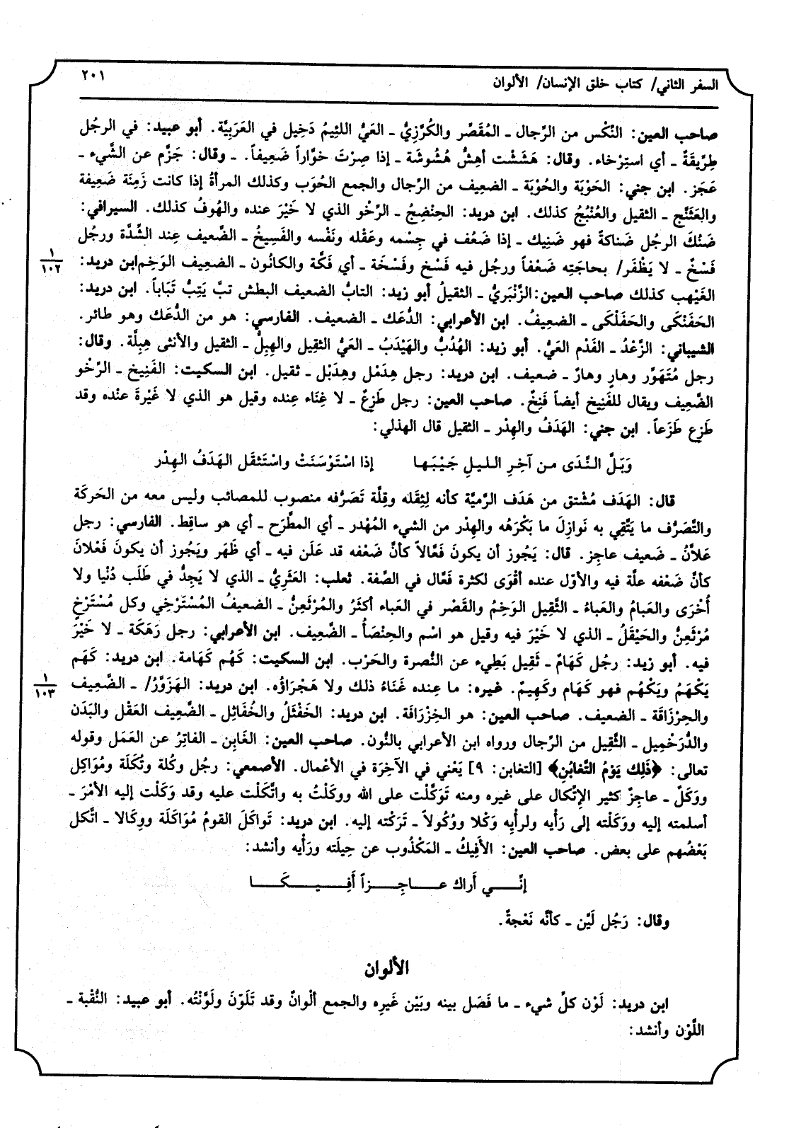 صَاحب الْعين، النِّكْس من الرِّجال المُقَصِّر والكُرَّزِيُّ العِيُّ اللئِيمُ دَخِيل فِي العَرَبيَّة، أَبُو عبيد، فِي الرجل طِرِّيقَةٌ أَي استِرْخاء وَقَالَ: هَشَشت أهِشُّ هُشُوشَة إِذا صِرْت خوَّاراً ضَعِيفاً وَقَالَ: جَزَّم عَن الشَّيْء عَجَز، ابْن جني، الحَوْبَة والحُوْبَة، الضَّعِيف من الرِّجَال وَالْجمع الحُوَب وَكَذَلِكَ الْمَرْأَة إِذا كَانَت زَمِنَة ضَعِيفة والعَثَنَّج الثقيل والعُنْبُجُ كَذَلِك، ابْن دُرَيْد، الحِنْضِجُ الرِّخْو الَّذِي لَا خير عِنْده والهُوفُ كَذَلِك، السيرافي، ضَنُكَ الرجل ضَناكةً فَهُوَ ضَنِيك، إِذا ضَعُف فِي جِسْمه وعقله وَنَفسه والفَسِيخُ الضَّعيف عِنْد الشدَّة وَرجل فَسْخٌ لَا يَظْفر بحاجَتِه ضَعْفاً ورجُل فِيهِ فَسْخ وفَسْخَة أَي فَكَّة والكانُون الضَّعِيف الوَخِم، ابْن دُرَيْد، الغَيْهب كَذَلِك، صَاحب الْعين، الزَّنْبَرِيُّ الثقيلُ، أَبُو زيد، التابُّ الضَّعِيف البطَشْ تَبَّ يَتِبُّ تَبَابا، ً ابْن دُرَيْد، الحَفَنْكَى والحَفَلْكَى الضَّعِيف، ابْن الْأَعرَابِي، الدُّعَك الضَّعِيف، الْفَارِسِي: هُوَ من الدُّعَك وَهُوَ طَائِر، الشَّيْبَانِيّ، الزَّعْدُ الفَدْم العَيُّ، أَبُو زيد، الهُدُبُّ والهَيْدَبُ العَيُّ الثقيل والهِبِلُّ الثقيل وَالْأُنْثَى هِبِلَّة، وَقَالَ: رجل مُتَهَوِّر وهارٍ وهارٌ ضَعِيف، ابْن دُرَيْد، رجل هِدَمْل وهِدَبْل ثقيل، ابْن السّكيت، الفَنِيخ الرِّخْو الضَّعِيف وَيُقَال للفَنِيخ أَيْضا فَنِخٌ، صَاحب الْعين، رجل طَزِعٌ لَا غَنَاء عِنْده وَقيل هُوَ الَّذِي لَا غَيْرَة عِنْده وَقد طَزِع طَزَعاً، ابْن جني، الهَدَفُ والهِدْر الثقيل قَالَ الْهُذلِيّ: دُرَيْد، الحَفَنْكَى والحَفَلْكَى الضَّعِيف، ابْن الْأَعرَابِي، الدُّعَك الضَّعِيف، الْفَارِسِي: هُوَ من الدُّعَك وَهُوَ طَائِر، الشَّيْبَانِيّ، الزَّعْدُ الفَدْم العَيُّ، أَبُو زيد، الهُدُبُّ والهَيْدَبُ العَيُّ الثقيل والهِبِلُّ الثقيل وَالْأُنْثَى هِبِلَّة، وَقَالَ: رجل مُتَهَوِّر وهارٍ وهارٌ ضَعِيف، ابْن دُرَيْد، رجل هِدَمْل وهِدَبْل ثقيل، ابْن السّكيت، الفَنِيخ الرِّخْو الضَّعِيف وَيُقَال للفَنِيخ أَيْضا فَنِخٌ، صَاحب الْعين، رجل طَزِعٌ لَا غَنَاء عِنْده وَقيل هُوَ الَّذِي لَا غَيْرَة عِنْده وَقد طَزِع طَزَعاً، ابْن جني، الهَدَفُ والهِدْر الثقيل قَالَ الْهُذلِيّ: وَبَلَّ النَّدَى من آخِرِ الليلِ جَيْبَهاإذا اسْتَوْسَنَتْ واسْتَثقَل الهَدَفُ الهِدْر قَالَ: الهَدَف مُشْتق من هَدَف الرَّميَّة كَأَنَّهُ لثِقَله وقِلَّة تَصَرُّفه مَنْصُوب للمصائب وَلَيْسَ مَعَه من الْحَرَكَة والتَّصَرُّف مَا يَتَّقِي بِهِ نَوَازِل مَا يَكْرَهُه والهِدْر من الشَّيْء المُهْدر أَي المطَّرَح أَي هُوَ سَاقِط، الْفَارِسِي، رجل عَلانُ ضَعِيف عَاجز، قَالَ: يجوز أَن يكون فَعَّالاً كأنَّ ضَعْفه قد عَلَن فِيهِ، أَي ظَهَر وَيجوز أَن يكون فَعْلانَ كأنَّ ضَعْفه عِلَّة فِيهِ والأوَل عِنْده أقْوَى لِكَثْرَة فَعَّال فِي الصِّفة، ثَعْلَب العَثريُّ: الَّذِي لَا يَجِدُّ فِي طلب دُنْيا وَلَا أُخْرَى والعَبامُ والعَباءُ الثَّقِيل الوَخِمُ والقَصْر فِي العَباء أكثرُ والمُرْثَعِنُّ الضعيفُ المُسْتَرْخِي وكل مُسْتَرْخٍ مُرْثِعَنٌّ والحَيْقَلُ الَّذِي لَا خَيْرَ فِيهِ وَقيل هُوَ اسْم والحِنْصَأُ الضَّعِيف، ابْن الْأَعرَابِي، رجل رَهَكَة لَا خَيْرَ فِيهِ، أَبُو زيد، رجُل كَهَامٌ ثَقِيل بَطِيء عَن النُّصرة والحَرْب، ابْن السّكيت، كَهُم كَهَامة، ابْن دُرَيْد، كَهُم يَكْهَمُ ويَكْهُم فَهُوَ كَهَام وكَهِيمٌ، غَيره، مَا عِنده ذناء ذَلِك وَلَا هَجْراؤه، ابْن دُرَيْد، الهَزَوَّرُ الضَّعِيف والحِرْزَاقَة الضَّعِيف، صَاحب الْعين، هُوَ الخِزْرَافَة، ابْن دُرَيْد، الخَفْثَلُ والخُفَاثِل الضَّعِيف العَقْل والبَدَن والد