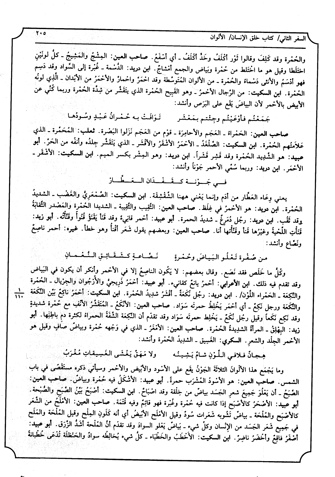 والحمرة وَقد كلف وَقَالُوا أكلف وخد أكلف أَي أسفع صَاحب الْعين المشج والمشيج كل لونين اختلطا وَقيل هُوَ مَا اخْتَلَط من حمرَة وَبَيَاض وَالْجمع أمشاج، ابْن دُرَيْد الدسمة، غبرة إِلَى السوَاد وَقد دسم فَهُوَ أدسم وَالْأُنْثَى دسماء والحمرة من الألوان المتوسطة وَقد احمر واحمار والأحمر من الْأَبدَان الَّذِي لَونه الْحمرَة، بَان السّكيت، من الرِّجَال الْأَحْمَر وَهُوَ الْقَبِيح الْحمرَة الَّذِي يتقشر من شدَّة الْحمرَة وَرُبمَا كنى عَن الْأَبْيَض بالأحمر لِأَن الْبيَاض يَقع على البرص وَأنْشد: جمعتم فأوعيتم وجئتم بمعشر تواقت بِهِ حمْرَان عبد وسودها صَاحب الْعين الْحَمْرَاء الْعَجم والأحامرة قوم من الْعَجم نزلُوا الْبَصْرَة. ثَعْلَب، الْمُحرمَة الَّذين علامتهم الْحمرَة، ابْن السّكيت الصلغد الْأَحْمَر الْأَشْقَر والأقشر الَّذِي يتقشر جلده وَأَنْفه من الْحر، أَبُو عبيد، هُوَ الشَّديد الْحمرَة وَقد قشر قشراً ابْن دُرَيْد وَهُوَ المشر بِكَسْر الْمِيم ابْن السّكيت، الْأَشْقَر الْأَحْمَر ابْن دُرَيْد، وَرُبمَا سمي الْأَحْمَر جومناً وَأنْشد: فِي جونة كقفدان الْعَطَّار يَعْنِي وعَاء الْعَطَّار من ادم وَإِنَّمَا يَعْنِي هَهُنَا الشقشقة ابْن السّكيت الصمعري وَالْغَضَب الشَّديد الْحمرَة ابْن دُرَيْد هُوَ الْأَحْمَر فِي غلظ صَاحب الْعين الثقيب والثقيبة الشَّديد الْحمرَة والمصدر الثقابة وَقد ثقب ابْن دُرَيْد رجل دمرغ شَدِيد الْحمرَة أَبُو عبيد، أَحْمَر قانئ وَقد قنأ يقنؤ قنوأً وقنأته. أَبُو زيد، قنأت اللِّحْيَة وَغَيرهَا قنأ وقنأتها أَنا، صَاحب الْعين، وَبَعْضهمْ يَقُول شعر أقنأ وَهُوَ خطأ غَيره أَحْمَر ناصع ونصاع وَأنْشد: من صفرَة تعلو الْبيَاض وَحُمرَة نصاعة كشقائق النُّعْمَان وكل مَا خلص فقد نصع، وَقَالَ بَعضهم: لَا يكون الناصع إِلَّا فِي الْأَحْمَر وَأنكر أَن يكون فِي الْبيَاض وَقد تقدم فِيهِ ذَلِك، ابْن الْأَعرَابِي أَحْمَر يَانِع كقانئ أَبُو عبيد، أَحْمَر ذريحي والأرجوان والجريال، الْحمرَة والنكعة الْحَمْرَاء اللَّوْن ابْن دُرَيْد، رجل نكعة أقشر شَدِيد الْحمرَة ابْن السّكيت أَحْمَر ناكع بَين النكعة والنكعة وَرجل نكع أَي أَحْمَر يخلط حمرته سَواد، صَاحب لعين، الأنكع المتقشر الْأنف مَعَ حمرَة شَدِيدَة وَقد نكع نكعاً وَقيل رجل نكع يخلط حمرته سَواد وَقد تقدم أَن النكعة الشّفة الْحَمْرَاء لِكَثْرَة دم بَاطِنهَا أَبُو زيد، البهلق الْمَرْأَة الشَّدِيدَة الْحمرَة صَاحب الْعين الأمغر الَّذِي فِي وَجهه حمرَة وَبَيَاض صَاف وَقيل هُوَ الْأَحْمَر الْجلد وَالشعر السكرِي، الغسيق الشَّديد الْحمرَة وَأنْشد: هجلن فَلَا فِي اللَّوْن شام يشينه وَلَا مهق يغشى الغسيقات مغرب وَمَا يجمع هَذِه الألوان الثَّلَاثَة الجون يَقع على الْأسود والأبيض والأحمر وَسَيَأْتِي ذكره مستقصى فِي بَاب الشَّمْس، صَاحب الْعين، هُوَ الْأسود المشرب حمرَة، د أَبُو عبيد الأشكل فِيهِ حمرَة وَبَيَاض صَاحب الْعين الصُّبْح أَن يَعْلُو جَمِيع شعر الْجَسَد بَيَاض من خلقَة وَقد اصباح، ابْن السّكيت، أصبح بَين الصُّبْح والصبحة، أَبُو عبيد، الأصحر كالأصبح إِذا كَانَت فِيهِ حمرَة وغبرة فَهُوَ قاتم وَفِيه قتمة، صَاحب الْعين الأملح من الشّعْر كالأصبح والملحة بَيَاض تشوبه شَعرَات سود وَقيل الأملح الْأَبْيَض أَي لون كلون الْملح وَقيل الملحة وَالْملح فِي جَمِيع شعر الْجَسَد من الْإِنْسَان وكل شَيْء بَيَاض يَعْلُو السوَاد وَقد تقدم أَن الملحة أَشد الزرق، أَبُو عبيد، أصفر فَاقِع وأخضر ناضر ابْن السّكيت، الأخطب والخطباء كل شَيْء يخالطه سَواد والحنظلة تدعى خطبانةً