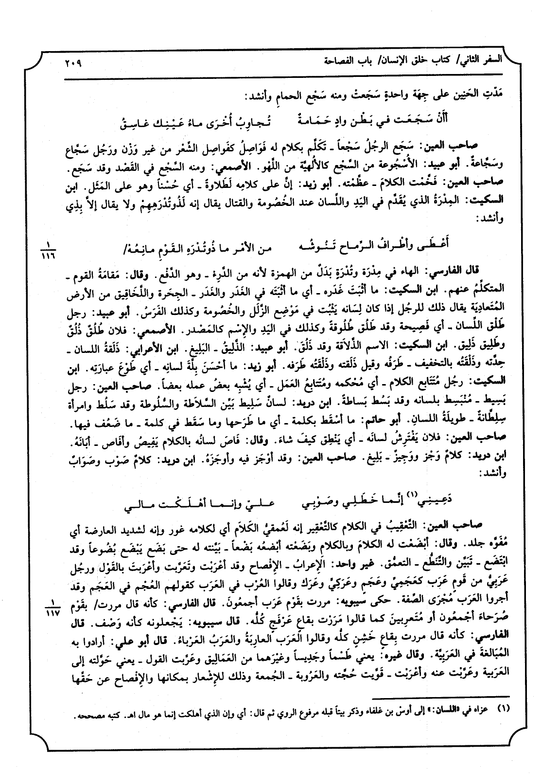 مدت الحنين على جِهَة وَاحِدَة سجعت وَمِنْه سجع الْحمام وَأنْشد: أأن سجعت فِي بطن وَاد حمامة تجاوب أُخْرَى مَاء عَيْنك غَاسِق صَاحب الْعين، سجع الرجل سجعاً تكلم بِكَلَام لَهُ فواصل كفواصل الشّعْر من غير وزن وَرجل سجاع وسجاعة، أَبُو عبيد، الأسجوعة من السجع كالألهية من اللَّهْو، الْأَصْمَعِي، وَمِنْه السجع فِي الْقَصْد وَقد سجع صَاحب الْعين، فخمت الْكَلَام عَظمته، أَبُو زيد، إِن عَليّ كَلَامه لطلاوة أَي حسنا وَهُوَ على الْمثل ابْن السّكيت، المدرة الَّذِي يقدم فِي الْيَد وَاللِّسَان عِنْد الْخُصُومَة والقتال يُقَال إِنَّه لذُو تدرههم وَلَا يُقَال إِلَّا بِذِي وَأنْشد: أعْطى وأطرف الرماح تنوشه من الْأَمر مَا ذُو تدره الْقَوْم مانعه قَالَ الْفَارِسِي، الْهَاء فِي مدره وتدره بدل من الْهمزَة لِأَنَّهُ من الدرء وَهُوَ الدّفع وَقَالَ: مقامة الْقَوْم، الْمُتَكَلّم عَنْهُم، ابْن السّكيت، مَا أثبت غدره أَي مَا أثْبته فِي الْغدر والغدر، الْحُجْرَة واللخاقيق من الأَرْض المتعادية يُقَال ذَلِك للرجل إِذا كَانَ لِسَانه يثبت فِي مَوضِع الزلل وَالْخُصُومَة وَكَذَلِكَ الْفرس، أَبُو عبيد، رجل طلق اللِّسَان، أَي فصيحه وَقد طلق طلوقةً وَكَذَلِكَ فِي الْيَد وَالِاسْم كالمصدر الْأَصْمَعِي، فلَان طلق ذلق وطليق ذليق، ابْن السّكيت، الِاسْم الذلاقة وَقد ذلق أَبُو عبيد، الذليق البليغ ابْن الْأَعرَابِي ذلقة اللِّسَان حِدته وذلقته بِالتَّخْفِيفِ طرفه وَقيل ذلقته وذلقته طرفه، أَبُو زيد، مَا أحسن بلة لِسَانه، أَي طوع عِبَارَته، ابْن السّكيت رجل متتابع الْكَلَام أَي محكمه ومتتابع الْعَمَل، أَي يشبه بعض عمله بَعْضًا، صَاحب الْعين، رجل بسيط منبسط بِلِسَانِهِ وَقد بسط بساطةً ابْن دُرَيْد، لِسَان سليط بَين السلاطة والسلوطة وَقد سلط وَامْرَأَة سلطانة طَوِيلَة اللِّسَان أَبُو حَاتِم مَا أسقط بِكَلِمَة أَي مَا طرحها وَمَا سقط فِي كلمة مَا ضعف فِيهَا صَاحب الْعين، فلَان يفترش لِسَانه أَي ينْطق كَيفَ شَاءَ، وَقَالَ: فاص لِسَانه بالْكلَام يفِيض وافاض أبانه ابْن دُرَيْد، كَلَام وجز ووجيز بليغ صَاحب الْعين، وَقد أوجز فِيهِ وأواجزه، ابْن دُرَيْد، كَلَام صوب وصواب وَأنْشد: دعيني إِنَّمَا خطلي وصوبي عَليّ وَإِنَّمَا أهلكت مَالِي صَاحب الْعين، التقعيب فِي الْكَلَام كالتقعير، وَقَالَ: إِنَّه لعمقي الْكَلَام أَي لكَلَامه غور وَإنَّهُ لشديد الْعَارِضَة أَي مفوه جلد وَقَالَ: أبضعت لَهُ الْكَلَام وبالكلام وبضعته أبضعه بضعاً، بَينته لَهُ حَتَّى بضع نبضع بضوعاً وق ابتضع تبين والتنطع التعمق غير وَاحِد، الْإِعْرَاب الإفصاح وَقد أعربت وتعربت وأعربت بالْقَوْل وَرجل عَرَبِيّ من قَول عرب كعجمي وعجم وعركي وعرك وَقَالُوا الْعَرَب فِي الْعَرَب كَقَوْلِهِم الْعَجم فِي الْعَجم وَقد أحروا الْعَرَب مجْرى الصّفة حكى سِيبَوَيْهٍ: مَرَرْت بِقوم عرب أَجْمَعُونَ قَالَ الْفَارِسِي: كَأَنَّهُ قَالَ مَرَرْت بِقوم صرحاء أَجْمَعُونَ أَو متعربين كَمَا قَالُوا مَرَرْت بقاع عرفج كُله، قَالَ سِيبَوَيْهٍ: يجعلونه كَأَنَّهُ وصف، قَالَ الْفَارِسِي: كَأَنَّهُ قَالَ مَرَرْت بقاع خشن كُله، وَقَالُوا الْعَرَب العاربة وَالْعرب العرباء، قَالَ أَبُو عَليّ: أَرَادوا بِهِ الْمُبَالغَة فِي الْعَرَبيَّة وَقَالَ غَيره، يَعْنِي طسماً وجديساً وَغَيرهمَا من العماليق وعربت القَوْل يَعْنِي حولته إِلَى الْعَرَبيَّة وعربت عَنهُ وأعربت قويت حجَّته والعروبة وَالْجُمُعَة وَذَلِكَ للإشعار بمكانها والإفصاح عَن حَقّهَا