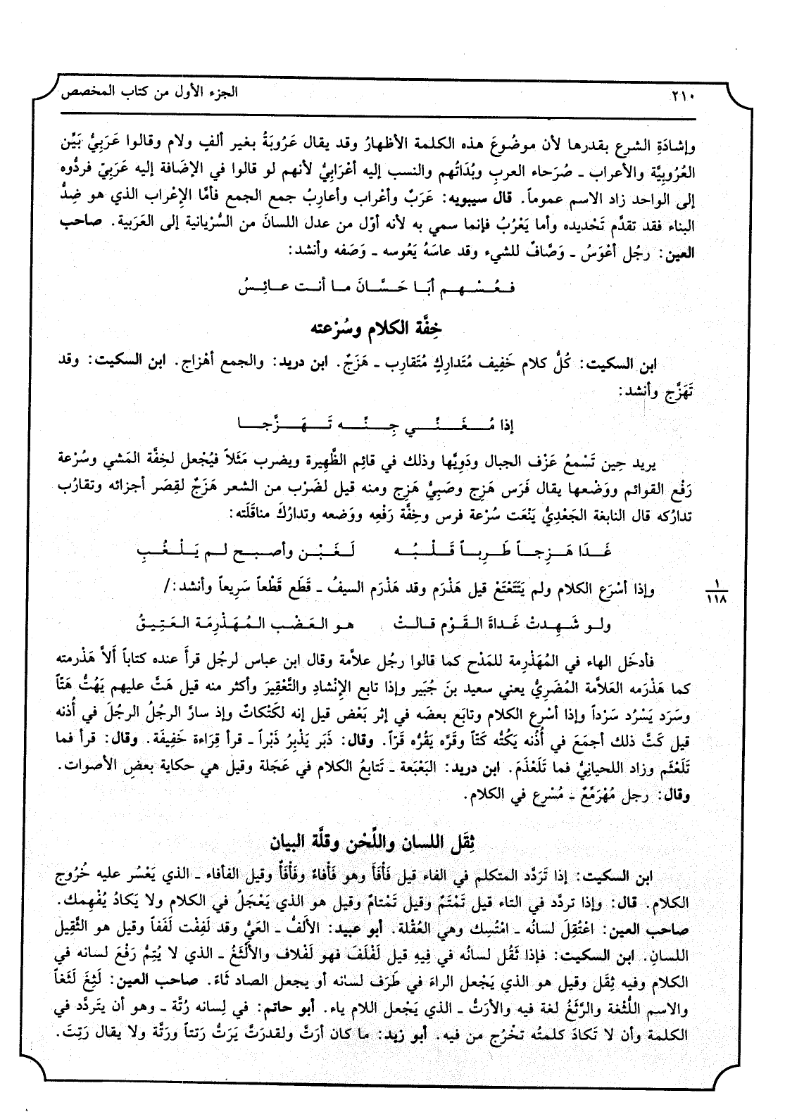 ابْن السّكيت كل كَلَام خَفِيف متدارك مُتَقَارب هزج ابْن دُرَيْد وَالْجمع أهزاج ابْن السّكيت، وَقد تهزج وَأنْشد: إِذا مغنى جنه تهزجا يُرِيد حِين تسمع عزف الْجبَال ودويها وَذَلِكَ فِي قَائِم الظهيرة وَيضْرب مثلا لخفة الْمَشْي وَسُرْعَة رفع القوائم ووضعها يُقَال فرس هزج وَصبي هزج وَمِنْه قيل لضرب من الشّعْر هزج لقصر أَجْزَائِهِ وتقارب تَدَارُكه قَالَ النَّابِغَة الْجَعْدِي ينعَت سرعَة فرس وخفة رَفعه وَوَضعه وتدارك مناقلته: غَدا هزجاً طَربا قلبه لغبن وَأصْبح لم يلغب وَإِذا أسْرع الْكَلَام وَلم يتتعتع قيل هذرم وَقد هذرم السَّيْف قطع قطعا سَرِيعا وَأنْشد: وَلَو شهِدت غَدَاة الْقَوْم قَالَت هُوَ العضب المهذرمة الْعَتِيق فَأدْخل الْهَاء فِي المهذرمة للمدح كَمَا قَالُوا رجل عَلامَة وَقَالَ ابْن عَبَّاس لرجل قَرَأَ عِنْده كتابا أَلا هذرمته كَمَا هذرمه الْعَلامَة المضري يَعْنِي سعيد بن جُبَير وَإِذا تَابع الإنشاد والتقعير وَأكْثر مِنْهُ قيل هت عَلَيْهِم يهت هتاً وسرد يسْرد سرداً وَإِذا أسْرع الْكَلَام وتابع بعضه فِي إِثْر بعض قيل إِنَّه لكتات وَإِذا سَار الرجل الرجل فِي إِذْنه قيل كت ذَلِك أجمع فِي أُذُنه يكته كتاً وقره يقره قراً، وَقَالَ: ذبر يذبر ذبراً، قَرَأَ قِرَاءَة خَفِيفَة وَقَالَ: قَرَأَ فَمَا نلعثم وَزَاد اللحياني فَمَا تلعذم، ابْن دُرَيْد البعبعة تتَابع الْكَلَام فِي عجلة وَقيل هِيَ حِكَايَة بعض الْأَصْوَات وَقَالَ: رجل مهرمع مسرع فِي الْكَلَام.