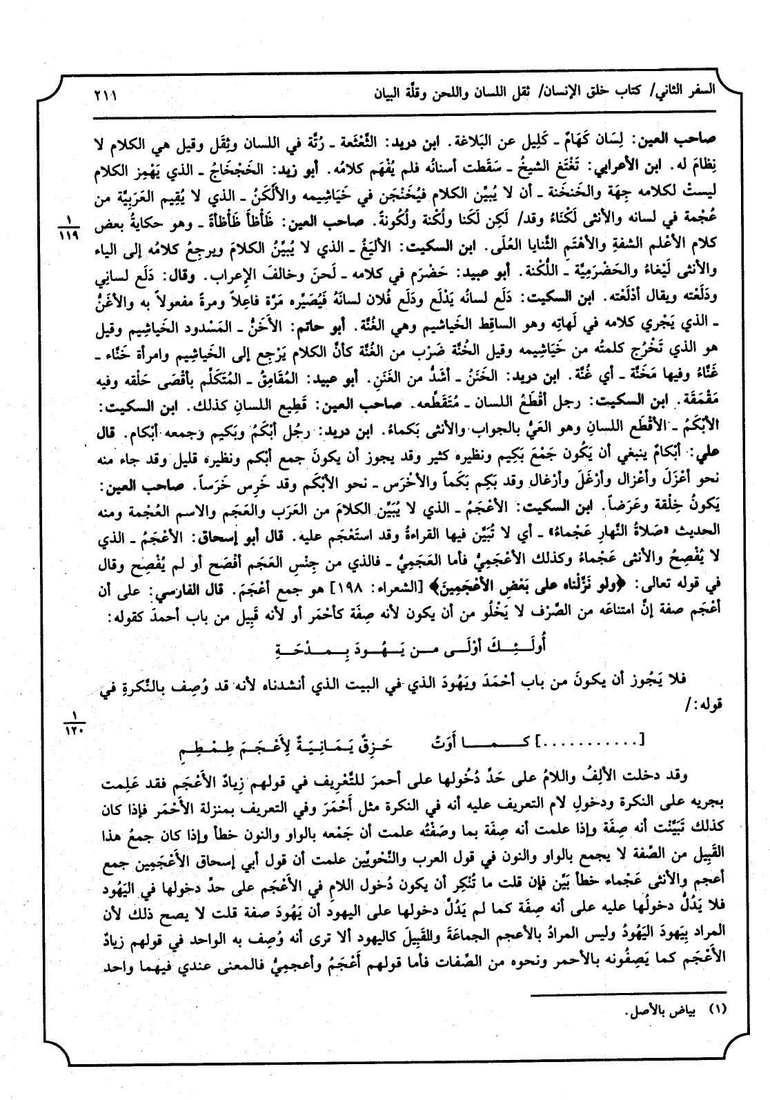 صَاحب الْعين، لِسَان كهام، كليل كليل عَن البلاغة ابْن دُرَيْد، الثعثعة رتة فِي اللِّسَان وَثقل وَقيل هِيَ الْكَلَام لَا نظام لَهُ، ابْن الْأَعرَابِي، تغتغ الشَّيْخ سَقَطت أَسْنَانه فَلم يفهم كَلَامه، أَبُو زيد، الخجخاج الَّذِي يهمز الْكَلَام لَيست لكَلَامه جِهَة والخخنة أَن لَا يبين الْكَلَام فيخنخن فِي خياشيمه والألكن الَّذِي لَا يُقيم الْعَرَبيَّة من عجمة فِي لِسَانه وَالْأُنْثَى لكناء وَقد لَكِن ولُكنه ولُكُونةً صَاحب الْعين ظَأظأََ ظأظأةً وَهُوَ حِكَايَة بعض كَلَام الأعلم الشّفة والأهتم الثنايا العلى، ابْن السّكيت الأليغ الَّذِي لَا يبين الْكَلَام وَيرجع كَلَامه إِلَى الْيَاء وَالْأُنْثَى ليغاء والحضرمية اللكنة أَبُو عبيد حضرم فِي كَلَامه اجن وَخَالف الْإِعْرَاب وَقَالَ: دلع لساني ودلعته وَيُقَال أدلعته، ابْن السّكيت دلع لِسَانه يدلع فلَان لِسَانه فيقصره مرّة فَاعِلا وَمرَّة مَفْعُولا بِهِ والأغن الَّذِي يجْرِي كَلَامه فِي لهانه وَهُوَ السَّاقِط الخياشيم وَهِي الغنة أَبُو حَاتِم الأخن المسدود الخياشيم وَقيل هُوَ الَّذِي تخرج كَلمته من خياشيمه وَقيل الخنة من الغنة كَأَن الْكَلَام يرجع إِلَى الخياشيم وَامْرَأَة خناء غناء وفيهَا مخنة، أَي غنة ابْن دُرَيْد الخنن أَشد من الغنن أَبُو عبيد، المقامق الْمُتَكَلّم بأقصى حلقه وَفِيه مقمقة ابْن السّكيت، رجل أقطع اللِّسَان متقطعه صَاحب الْعين، قطيع اللِّسَان كَذَلِك ابْن السّكيت، الأبكم الأقطع اللِّسَان وَهُوَ العي بِالْجَوَابِ وَالْأُنْثَى كَمَاء بكماء، ابْن دُرَيْد، رجل أبكم وبكيم وَجمعه أبكام، قَالَ عَليّ: أبكام يَنْبَغِي أَن يكون جمع بكيم وَنَظِيره كثير وَقد يجوز أَن يكون جمع أبكم وَنَظِيره قَلِيل وَقد جَاءَ مِنْهُ نَحْو خرس خرساً، صَاحب الْعين يكون خلقَة وعرضاً ابْن السّكيت الْأَعْجَم الَّذِي لَا يبين الْكَلَام من الْعَرَب والعجم وَالِاسْم العجمة وَمِنْه الحَدِيث صَلَاة النَّهَار عجماء أَي لَا يبين فِيهَا الْقِرَاءَة وَقد استعجم عَلَيْهِ، قَالَ أَبُو إِسْحَاق: الْأَعْجَم الَّذِي لَا يفصح وَالْأُنْثَى عجماء وَكَذَلِكَ الأعجمي فَأَما العجمي فَالَّذِي من جنس الْعَجم أفْصح أَو لم يفصح وَقَالَ فِي قَوْله تَعَالَى: (وَلَو نزلنَا على بعض الأعجمين) هُوَ جمع أعجم، قَالَ الفرسي: على أَن أعجم صفة إِن امْتِنَاعه من الصّرْف لَا يَخْلُو من أَن يكون لِأَنَّهُ صفة كأحمر أَو لِأَنَّهُ قبيل من بَاب أَحْمد كَقَوْلِه: أُولَئِكَ أولى من يهود بمدحه فَلَا يجوز أَن يكون من بَاب أَحْمد ويهود الَّذِي فِي الْبَيْت الَّذِي أنشدناه لِأَنَّهُ وصف بالنكرة فِي قَوْله: كَمَا أوت، حزق يملنية لأعجم طمطم وَقد دخلت الْألف وَاللَّام على حد دُخُولهَا على أَحْمَر للتعريف فِي قَوْلهم زِيَاد الْأَعْجَم فقد علمت بجريه على النكرَة وَدخُول لَام التَّعْرِيف عَلَيْهِ أَنه فِي النكرَة مثل أَحْمَر وَفِي التَّعْرِيف بِمَنْزِلَة الْأَحْمَر فَإِذا كَانَ كَذَلِك تبينت أَنه صفة وَإِذا علمت أَنه صفة بِمَا وَصفته علمت أَن جمعه بِالْوَاو وَالنُّون خطأ وَإِذا كَانَ جمع هَذَا الْقَبِيل من الصّفة لَا يجمع بِالْوَاو وَالنُّون فِي قَول الْعَرَب والنحويين علمت أَن قَول أبي إِسْحَاق الأعجمين جمع أعجم وَالْأُنْثَى عجماء خطأ بَين فَإِن قلت مَا تنكر أَن يكون دُخُول اللَّام فِي الْأَعْجَم على حد دُخُولهَا فِي الْيَهُود فَلَا يدل دُخُولهَا عَلَيْهِ على أَنه يكون دُخُول اللَّام فِي الْأَعْجَم على حد دُخُولهَا فِي الْيَهُود فَلَا يدل دُخُولهَا عَلَيْهِ على أَنه صفة كَمَا يدل دُخُولهَا على الْيَهُود أَن يهود صفة قلت لَا يَصح ذَلِك أَن المُرَاد بيهود الْيَهُود وَلَيْسَ المُرَاد بالأعجم الْجَمَاعَة والقبيل كاليهود أَلا ترى أَنه وصف بِهِ الْوَاحِد فِي قَوْلهم زِيَاد الْأَعْجَم كَمَا يصفونه بالأحمر وَنَحْوه من الصِّفَات 