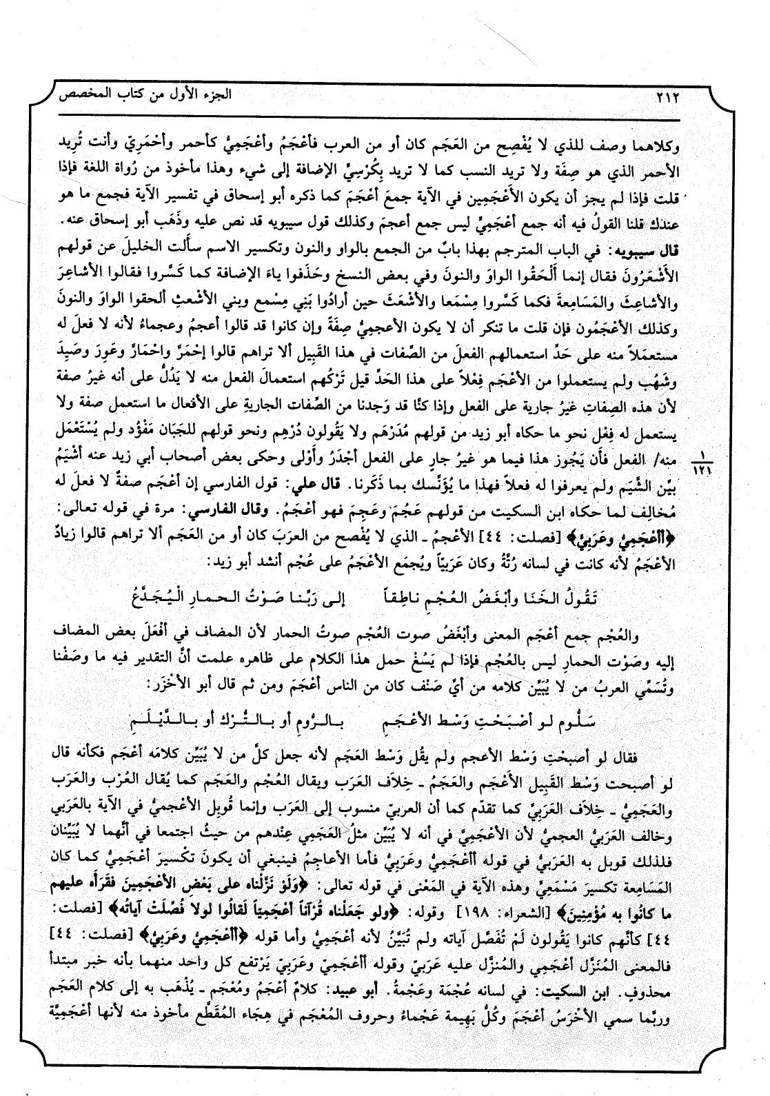 وَكِلَاهُمَا وصف للَّذي لَا يفصح من الْعَجم كَانَ أَو من الْعَرَب فأعجم وأعجمي كأحمر وأحمري وَأَنت تُرِيدُ الْأَحْمَر الَّذِي هُوَ صفة وَلَا تُرِيدُ النّسَب كَمَا تُرِيدُ بكرسي الْإِضَافَة إِلَى شَيْء وَهَذَا مَأْخُوذ من رُوَاة اللُّغَة فَإِذا قلت فَإِذا لم يجزأن يكون الأعجمين فِي الْآيَة جمع أعجم كَمَا ذكره أَبُو إِسْحَاق فِي تَفْسِير الْآيَة فَجمع مَا هُوَ عنْدك قُلْنَا القَوْل فِيهِ أَنه جمع أعجمي لَيْسَ جمع أعجم وَكَذَلِكَ قَول سِيبَوَيْهٍ قد نَص عَلَيْهِ وَذهب أَبُو إِسْحَاق عَنهُ قَالَ سِيبَوَيْهٍ: فِي الْبَاب المترجم بِهَذَا بَاب من الْجمع بِالْوَاو وَالنُّون وتكسير الِاسْم سَأَلت الْخَلِيل عَن قَوْلهم الأشعرون فَقَالَ إِنَّمَا ألْحقُوا الْوَاو وَالنُّون وَفِي بعض النّسخ وحذفوا يَاء الْإِضَافَة كَمَا كسروا فَقَالُوا الأشاعر والأشاعث والمسامعة فَكَمَا كسروا مسمعاً والأشعث حِين أَرَادوا بنى مسمع وَبني مسمع وَبني لبأشعث ألْحقُوا الْوَاو وَالنُّون وَكَذَلِكَ الأعجمون فإت قلت مَا تنكر أَن لَا يكون الأعجمي صفة وَإِن كَانُوا قد قَالُوا أعجم وعجماء لِأَنَّهُ لَا فعل لَهُ مُسْتَعْملا مِنْهُ على حد استعمالهم الْفِعْل من الصِّفَات فِي هَذَا الْقَبِيل أَلا تراهم قَالُوا أَحْمَر واحمار وعور وصيد وشهب وَلم يستعملوا من الْأَعْجَم فعلا على هَذَا الْحَد قيل تَركهم اسْتِعْمَال الْفِعْل مِنْهُ لَا يدل على أَنه غير صفة لِأَن هَذِه الصِّفَات غير جَارِيَة على الْفِعْل وَإِذا كُنَّا قد وجدنَا من الصِّفَات الْجَارِيَة على الْأَفْعَال مَا اسْتعْمل صفة وَلَا يسْتَعْمل لَهُ فعل نَحْو مَا حَكَاهُ أَبُو زيد من وقلهم مدرهم وَلَا يَقُولُونَ دِرْهَم وَنَحْو قَوْلهم للجبان مفؤد وَلم يسْتَعْمل مِنْهُ الْفِعْل فَإِن يجوز هَذَا فِيمَا هُوَ غير جَار على الْفِعْل أَجْدَر وأولىوحكى بعض أَصْحَاب أبي زيد عَنهُ أَشْيَم بَين الشيم وَلم يعرفوا لَهُ فعلا فَهَذَا مَا يؤنسك بِمَا ذكرنَا، قَالَ عَليّ: قَول الْفَارِسِي إِن أعجم صفة لَا فعل لَهُ مُخَالف لما حَكَاهُ ابْن السّكيت من قَوْلهم عجم وعجم فَهُوَ أعجم وَقَالَ الْفَارِسِي: رمة فِي قَوْله تَعَالَى: (أأعجمي وعربي الْأَعْجَم الَّذِي لَا يفصح من الْعَرَب كَانَ أَو من الْعَجم أَلا تراهم قَالُوا زِيَاد الْأَعْجَم لِأَنَّهُ كَانَت فِي لِسَانه رتة وَكَانَ عَرَبيا وَيجمع الْأَعْجَم على عجم أنْشد أَبُو زيد: تَقول الْخَنَا وَأبْغض الْعَجم ناطقاً إِلَى رَبنَا صَوت الْحمار اليجدع والعجم جمع أعجم، الْمَعْنى وَأبْغض صَوت الْعَجم صَوت الْحمار لِأَن الْمُضَاف فِي أفعل بعض الْمُضَاف إِلَيْهِ وَصَوت الْحمار لَيْسَ بالعجم قإذا لم يسغْ حمل هَذَا الْكَلَام على ظَاهره علمت أَن التَّقْدِير فِيهِ مَا وصفنه وتسمي الْعَرَب من لَا يبين كَلَامه من أَي صنف كَانَ من النَّاس أعجم وَمن ثمَّ قَالَ أَبُو الأخزر: سلوم لَو أَصبَحت وسط الْأَعْجَم ببالروم أَو بِالتّرْكِ أَو بالديلم فَقَالَ لَو أَصبَحت وسط الْأَعْجَم وَلم يقل وسط الْعَجم لِأَنَّهُ جعل كل من لَا يبين كَلَامه أعجم فَكَأَنَّهُ قَالَ لَو أَصبَحت وسط الْقَبِيل الْأَعْجَم والعجم خلاف الْعَرَب وَيُقَال الْعَجم والعجم كَمَا يُقَال الْعَرَب وَالْعرب والعجمي، خلاف الْعَرَبِيّ كَمَا تقدم كَمَا أَن الْعَرَبِيّ مَنْسُوب إِلَى الْعَرَب وَإِنَّمَا قوبل الأعجمي فِي الْآيَة بالعربي وَخَالف الْعَرَبِيّ العجمي لِأَن الأعجمي فِي أَنه لَا يبين مثل العجمي عِنْدهم من حَيْثُ اجْتمعَا فِي أَنَّهُمَا لَا يبينان فَلذَلِك قوبل بِهِ الْعَرَبِيّ فِي قَوْله أعجمي وعربي فَأَما الْأَعَاجِم فَيَنْبَغِي أَن يكون تكسير أعجمي كَمَا كَانَ المسامعة تكسير مسمعي وَهَذِه الْآيَة فِي الْمَعْنى فِي قَوْله تَعَالَى: (وَلَو أَنزَلْنَاهُ على بعض الأعجمين فقرأه عَلَيْهِم مَا كَانُوا مُؤمنين وَقَو