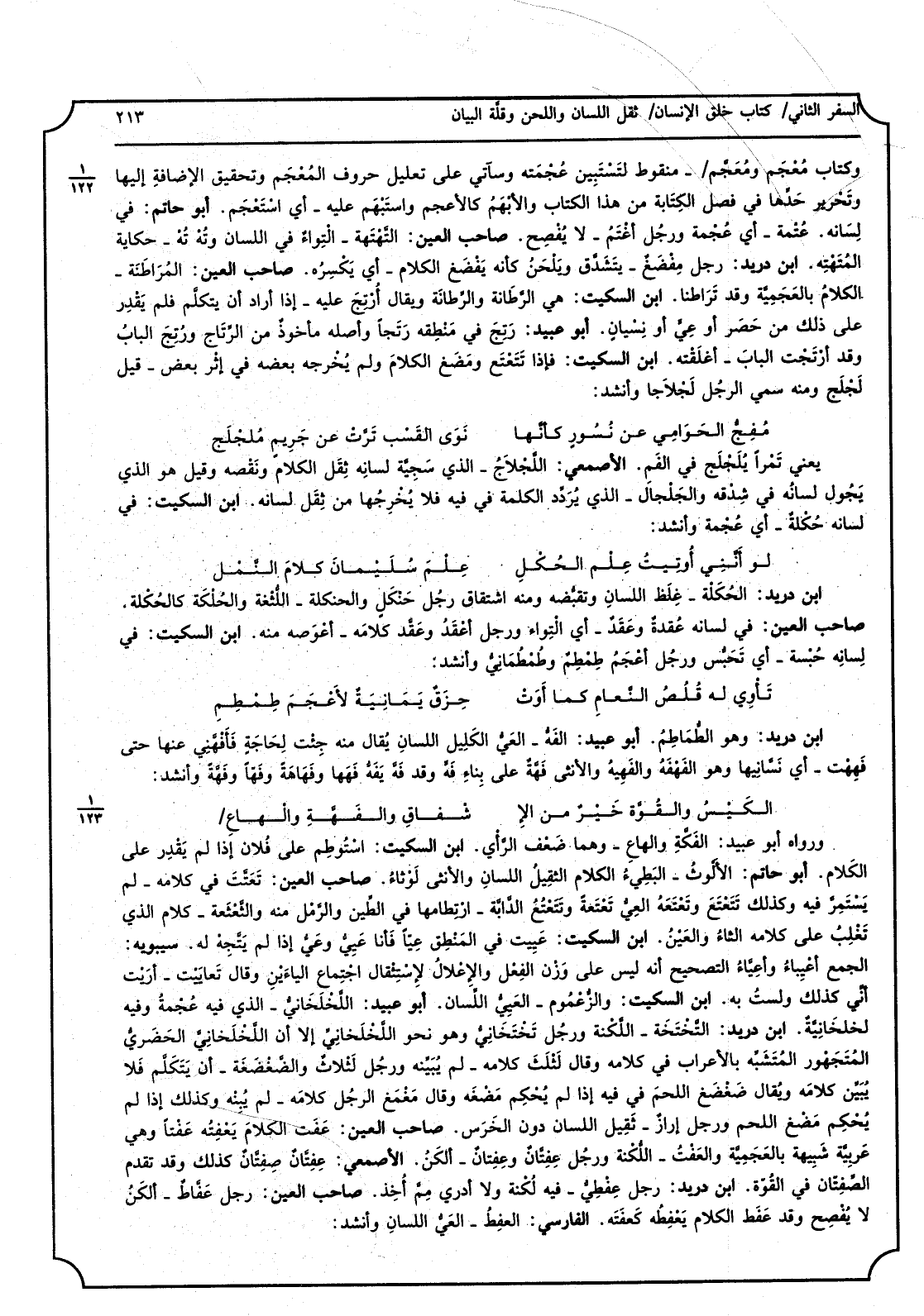 وَكتاب مُعْجم ومعجم منقوط لتستبين عجمته وسآتي على تَعْلِيل حُرُوف المعجم وَتَحْقِيق الْإِضَافَة إِلَيْهَا وتحرير حَدهَا فِي فصل الْكِتَابَة من هَذَا الْكتاب والأبهم كالأعجم واستبهم عَلَيْهِ أَي استعجم أَبُو حَاتِم، فِي لِسَانه غتمة، أَي عجمة وَرجل أغتم لَا يفصح صَاحب الْعين، التهتهة التواء فِي اللِّسَان وته ته، حِكَايَة المتهته، ابْن دُرَيْد رجل مفضغ يتشدق ويلحن كَأَنَّهُ يفضغ الْكَلَام، أَي يكسرهُ، صَاحب الْعين المراطنة الْكَلَام بالعجمية وَقد تراطنا ابْن السّكيت، هِيَ الرطانة والرطانة وَيُقَال أرتج عَلَيْهِ، إِذا أَرَادَ أَن يتَكَلَّم فَلم يقدر على ذَلِك من حصر أَو مى أَو نِسْيَان. أَبُو عبيد، رتج فِي مَنْطِقه رتجاً وَأَصله مَأْخُوذ من الرتاج ورتج الْبَاب وَقد أرتجت الْبَاب أغلقته، ابْن السّكيت فَإِذا تتعتع ومضغ الْكَلَام وَلم يُخرجهُ بعضه فِي إِثْر بعض قيل لجلج وَمِنْه سمي الرجل لجلاجاً وَأنْشد: مفج الحوامي عَن نسور كَأَنَّهَا نوى القسب ترت عَن جريم ملجلج يَعْنِي تَمرا يلجلج فِي الْفَم الْأَصْمَعِي اللَّجْلَاج، الَّذِي سجية لِسَانه ثقل الْكَلَام ونقصه وَقيل هُوَ الَّذِي يجول لِسَانه فِي شدقه والجلجال الَّذِي يردد الْكَلِمَة فِي فِيهِ فَلَا يُخرجهَا من ثقل لِسَانه ابْن السّكيت، فِي لِسَانه حكلة أَي عجمة وَأنْشد: لَو أنني أُوتيت علم الحكل علم سُلَيْمَان كَلَام النَّمْل ابْن دُرَيْد الحكلة غلظ اللِّسَان وتقبضه وَمِنْه اشتقاقا رجل حنكل والحنكلة اللثغة والحكلة كالحكلة صَاحب الْعين، فِي لِسَانه عقدَة وعدق أَي التواء وَرجل أعقد وَعقد كَلَامه أعوضه مِنْهُ ابْن السّكيت فِي لِسَانه حبسة، أَي تحبس وَرجل أعجم طمطم وطمطماني وَأنْشد: تأوى لَهُ قلص النعام كَمَا أوت حزق يَمَانِية لأعجم طمطم ابْن دُرَيْد، وَهُوَ الطماطم أَبُو عبيد، الفه العي الكليل اللِّسَان يُقَال مِنْهُ جِئْت لجاجة فأفهني عَنْهَا حَتَّى فهفه، أَي نسانيها وَهُوَ الفهفه والفهيه وَالْأُنْثَى فهة على بِنَاء فه وَقد فه فههاً وفهاهةً وفهاً وفهةً وَأنْشد: الْكيس وَالْقُوَّة خير من الِاشْتِقَاق والفهة والهاع وَرَوَاهُ أَبُو عبيد الفكة والهاع وهما ضعف الرَّأْي ابْن السّكيت استوطم على فلَان إِذا لم يقدر على الْكَلَام. أَبُو حَاتِم، الألوث البطيء الْكَلَام الثقيل اللِّسَان وَالْأُنْثَى لوثاء صَاحب الْعين تعتعت فِي كَلَامه لم يسْتَمر فِيهِ وَكَذَلِكَ تتعتع وتعتع العي تعتعةً وتتعتع الدَّابَّة، ارتطامها فِي الطين والرمل مِنْهُ والثعثعة كَلَام الَّذِي تغلب على كَلَامه الثَّاء وَالْعين، ابْن السّكيت، عييت فِي الْمنطق عياً فَأَنا عي وعي إِذا لم يتَّجه لَهُ، سِيبَوَيْهٍ، الْجمع أعيباء وأعياء التَّصْحِيح أَنه لَيْسَ على وزن الْفِعْل والاعلال لاستثقال اجْتِمَاع الياءين وَقَالَ تعاييت أريت أَنِّي كَذَلِك وَلست بِهِ، ابْن السّكيت، والزعموم العي اللِّسَان أَبُو عبيد، اللخلخاني الَّذِي فِيهِ عجمة وَفِيه لخلخانية ابْن دُرَيْد، التختخة اللكنة وَرجل تختخاني وَهُوَ نَحْو اللخلخاني إِلَّا أَن اللخلخاني الحضري المتجهور المتشبه بالأعراب فِي كَلَامه وَقَالَ لثلث كَلَامه، لم يُبينهُ وَرجل لثلاث والضغضغة أَن يتَكَلَّم فَلَا يبين كَلَامه وَيُقَال ضغضغ اللَّحْم فِي فِيهِ إِذا لم يحكم مضغه وَقَالَ مغمغ الرجل كَلَامه لم يبنه وَكَذَلِكَ إِذا لم يحكم مضغ اللَّحْم وَرجل إراز ثقيل اللِّسَان دون الخرس صَاحب الْعين، عفت الْكَلَام يعفته عفتاً وعفتان، ألكن الْأَصْمَعِي عفتان صفتان كَذَلِك وَقد تقدم الصفتان فِي الْقُوَّة ابْن دُرَيْد رجل عفطي فِيهِ لكنة وَلَا أَدْرِي مِم أَخذ، صَاحب الْعين، رجل عفاط ألكن لَا يفصح وَقد عفط الْكَلَام يعفطه كعفته، الْفَارِسِي، العفط العي اللِّسَان وَأنْشد: