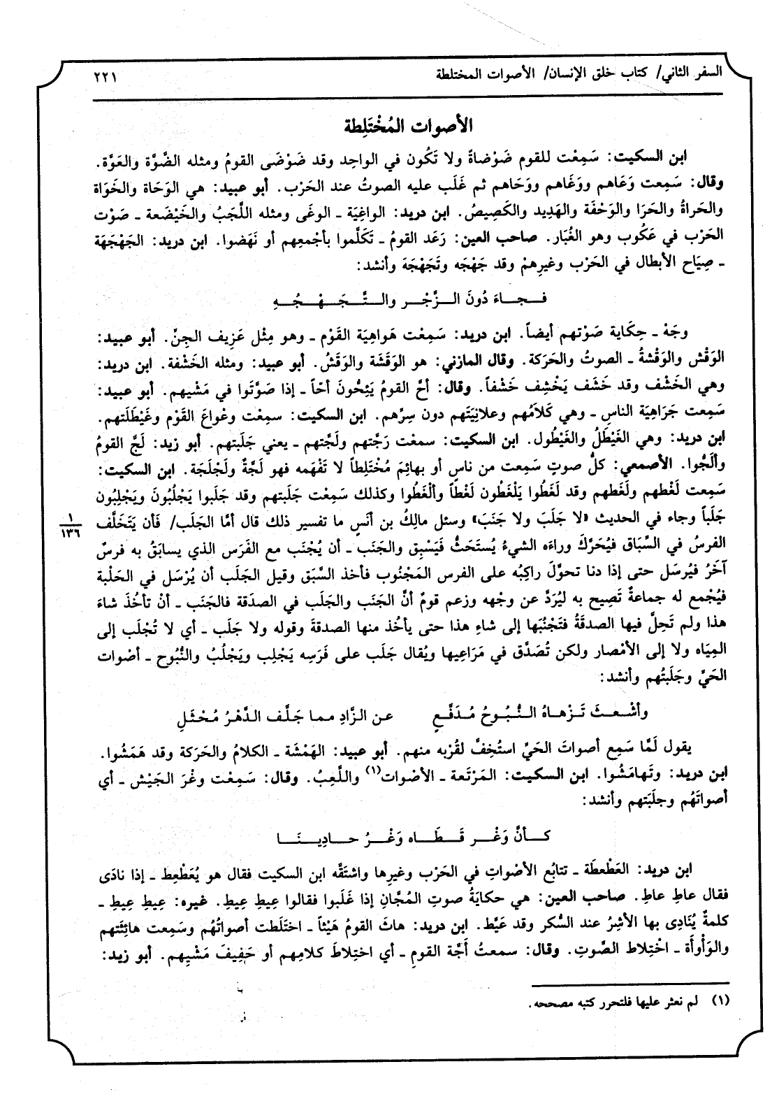 ابْن السّكيت، سَمِعت للْقَوْم ضوضاةً وَلَا تكون فِي الْوَاحِد وَقد ضوضى الْقَوْم وَمثله الضوة والعوة، وَقَالَ: سَمِعت وعاهم ووغاهم ووحاهم ثمَّ غلب عَلَيْهِ الصَّوْت عِنْد الْحَرْب، أَبُو عبيد، هِيَ الوحاة والخواة والحراة والحرا والوحفة والهديد والكصيص، ابْن دُرَيْد، الواغية الوغى وَمثله اللجب والخيضعة صَوت الْحَرْب فِي عكوب وَهُوَ الْغُبَار، صَاحب الْعين، رعد الْقَوْم تكلمُوا بأجمعهم أَو نهضوا ابْن دُرَيْد، الجهجهة، صياح الْأَبْطَال فِي الْحَرْب وَغَيرهم وَقد جهجه وتجهجه وَأنْشد: فجَاء دون الزّجر والتجهجه وَجه حِكَايَة صوتهم أَيْضا، ابْن دُرَيْد، سَمِعت هواهية الْقَوْم وَهُوَ مثل عزيف الْجِنّ، أَبُو عبيد، الوقش والوقشة، الصَّوْت وَالْحَرَكَة، وَقَالَ الْمَازِني، هُوَ الوقشة والوقش، أَبُو عبيدن وَمثله الخشفة، ابْن دُرَيْد، وَهِي الخشف وَقد خشف يخشف خشفاً وَقَالَ: أح الْقَوْم يئحون احاً إِذا صوتوا فِي مشيهم، أَبُو عبيد، سَمِعت جراهية النَّاس وَهِي كَلَامهم وعلانيتهم دون سرهم، ابْن السّكيت، سَمِعت وعواع الْقَوْم وغيطلتهم ابْن دُرَيْد، وَهِي الغيطل والغيطول، ابْن السّكيت، سَمِعت رجتهم ولجتهمن يَعْنِي جلبتهم. أَبُو زيد، لج الْقَوْم وألجوا، الْأَصْمَعِي، كل صَوت سَمِعت من نَاس أَو بهائم مختلطاً لَا تفهمه فَهُوَ لجة ولجلجة، ابْن السّكيت، سَمِعت لغطهم ولغطهم وَقد لغطوا يلغطون لَغطا وألغطوا وَكَذَلِكَ سَمِعت جلبتهم وَقد جلبوا يجلبون ويجلبون جلباً وَجَاء فِي الحَدِيث لَا جلب وَلَا جنب وَسُئِلَ مَالك بن أنس مَا تَفْسِير ذَلِك قَالَ أما الجلب فَإِن يختلق الْفرس فِي السباق فيحرك وَرَاءه الشَّيْء يستحث فَيَسْبق وَالْجنب، أَن يجنب مَعَ الْفرس الَّذِي يسابق بِهِ فرس آخر فَيُرْسل حَتَّى إِذا دنا تحول رَاكِبه على الْفرس المجنوب فَأخذ السَّبق وَقيل الجلب أَن يُرْسل فِي الحلبة فَيجمع لَهُ جمَاعَة تصيح بِهِ ليرد عَن وَجهه وَزعم قوم أَن الْجنب والجلب فِي الصَّدَقَة وَقَوله لَا جلب، أَي لَا تجلب إِلَى الْمِيَاه وَلَا إِلَى الْأَمْصَار وَلَكِن تصدق فِي مراعيها وَيُقَال جلب على فرسه يجلب ويجلب والنبوح أصوات الْحَيّ وجلبتهم وَأنْشد: وَأَشْعَث تزهاه النبوح مدفع عَن الزَّاد مِمَّا جلف الدَّهْر محثل يَقُول لما سمع أصوات الْحَيّ استخف لقُرْبه مِنْهُم، أَبُو عبيد، الهمشة الْكَلَام وَالْحَرَكَة وَقد همشوا ابْن دريدن وتهامشوا، ابْن السّكيت، المرتعة الْأَصْوَات واللعب، وَقَالَ: سَمِعت وغر الْجَيْش أَي أَصْوَاتهم وجلبتهم وَأنْشد: كَأَن وغرقطاه وغرحادينا ابْن دُرَيْد، العطعطة تتَابع الْأَصْوَات فِي الْحَرْب وَغَيرهَا واشتقه ابْن السّكيت فَقَالَ هُوَ يعطعط إِذا نَادَى فَقَالَ عاط عاط صَاحب الْعين، هِيَ حِكَايَة صَوت المجان إِذا غلبوا فَقَالُوا عيط عيط، كلمة يُنَادى بهَا الأشر عِنْد السكر وَقد عيط، ابْن دُرَيْد، هاث الْقَوْم هيثاً اخْتلطت أَصْوَاتهم وَسمعت هائثتهم والأوأة اخْتِلَاط الصَّوْت، وَقَالَ: سَمِعت أجة الْقَوْم أَي اخْتِلَاط كَلَامهم أَو حفيف مشيهم، أَبُو زيد،