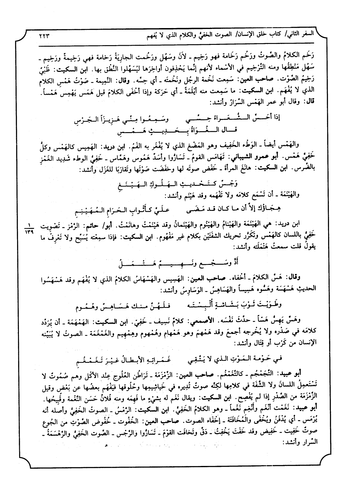 رخم الْكَلَام وَالصَّوْت ورخم فَهُوَ رخيم، لن وَسَهل ورخمت الْجَارِيَة رخامة فَهِيَ رخيمة ورخيم، سهل منطقها وَمِنْه التَّرْخِيم فِي الْأَسْمَاء لأَنهم إِنَّمَا يحذفون أواخرها ليسهلوا النُّطْق بهَا، ابْن السّكيت، ظَبْي رخيم الصَّوْت. صَاحب الْعين، سَمِعت نخمة الرجل ونخمته أَي حسه وَقَالَ: النميمة صَوت هَمس الْكَلَام الَّذِي لَا يفهم، ابْن السّكيت، مَا سَمِعت مِنْهُ أيلمةً أَي حُرْمَة وَإِذا أخْفى الْكَلَام قيل هَمس يهمس همساً قَالَ: وَقَالَ أَبُو عمر الهمس السرَار وَأنْشد: إِذا أحس الشُّعَرَاء حسى وسمعوا مني هزيزاً لجرس قَالَ الغواة بِحَدِيث هَمس. والهمس أَيْضا الْوَطْء الْخَفِيف وَهُوَ المضغ الَّذِي لَا يفغر بِهِ الْفَم، ابْن دُرَيْد، الهميس كالهمس وكل خَفِي هَمس، أَبُو عَمْرو الشَّيْبَانِيّ، تهامس الْقَوْم، تساروا وَأسد هموس وهماس خَفِي الْوَطْء شَدِيد الغمز بالضرس، ابْن السّكيت، هانغ الْمَرْأَة خفض صَوته لَهَا وخفضت صَوتهَا وتقارباً بالغزل وَأنْشد: وجس كتحديث الهلوك الهينغ والهينمة أَن تسمع كَلَامه وَلَا تفهمه وَقد هينم وَأنْشد: هجاؤك إِلَّا أَن مَا كَانَ قد مضى عَليّ كأثواب هينم وَأنْشد ابْن دُرَيْد، هِيَ الهيمنة والهينام والهينوم والهينمان وَقد هيمنت وهانمت، أَبُو حَاتِم، الرَّمْز تصويت خَفِي بِاللِّسَانِ كالهمس وتكرر تَحْرِيك الشفتين بِكَلَام غير مَفْهُوم، ابْن السّكيت، فَإِذا سمعته يسبح وَلَا تعرف مَا يَقُول قلت سَمِعت هتملته وَأنْشد: أد وسجع ونهيم هتمل وَقَالَ: هَمس الْكَلَام أخفاه صَاحب الْعين الهسيس والهسهاس الْكَلَام الَّذِي لَا يفهم وَقد هسهسوا الحَدِيث هسهسة وهسوه هسيساً والهساهس الوساوس وَأنْشد: وطويت ثوب بشاشة ألبسته فَلَهُنَّ مِنْك هساهس وهموم وهس يهس هساً حدث نَفسه، الْأَصْمَعِي، كَلَام نسيق خَفِي ابْن السّكيت، الهمهمة أَن يردد كَلَامه فِي صَدره وَلَا يُخرجهُ أجمع وَقد هَمهمْ وَهُوَ همهام وهمهوم وهمهيم والغمغمة الصَّوْت لَا يُبينهُ الْإِنْسَان من كرب أَو قتال وَأنْشد: فِي حومة الْمَوْت الَّذِي لَا يَتَّقِي غمراته الْأَبْطَال غير تغمغم أَبُو عبيد، التجمجم كالتغمغم، صَاحب الْعين، الزمزمة تراطن العلوج عِنْد الْأكل وهم صموت لَا تسْتَعْمل اللِّسَان وَلَا الشّفة فِي كَلَامهَا لكنه صَوت تديره فِي خياشيمها وحلوقها فيفهم بَعْضهَا عَن بعض وَقيل الزمزمة من الصَّدْر إِذا لم يفصح، ابْن السّكيت، وَيُقَال نغم لَهُ بِشَيْء مَا فهمه وَمِنْه فلَان حسن النغمة وقبيحها. أَبُو عبيد، نغمت أنغم وأنغم نغماً وَهُوَ الْكَلَام الْخَفي، ابْن السّكيت، الرمس الصَّوْت الْخَفي وَأَصله أَنه يرمس أَي يدْفن ويخفي والمخافتة إخفاء الصَّوْت، صاخب الْعين الخفوت خفوض الصَّوْت من الْجُوع صَوت خفيت خفيض وَقد خفت يخفت دق وتخافت الْقَوْم، تساروا والرجس الصَّوْت الْخَفي والرهسمة السرَار وَأنْشد: