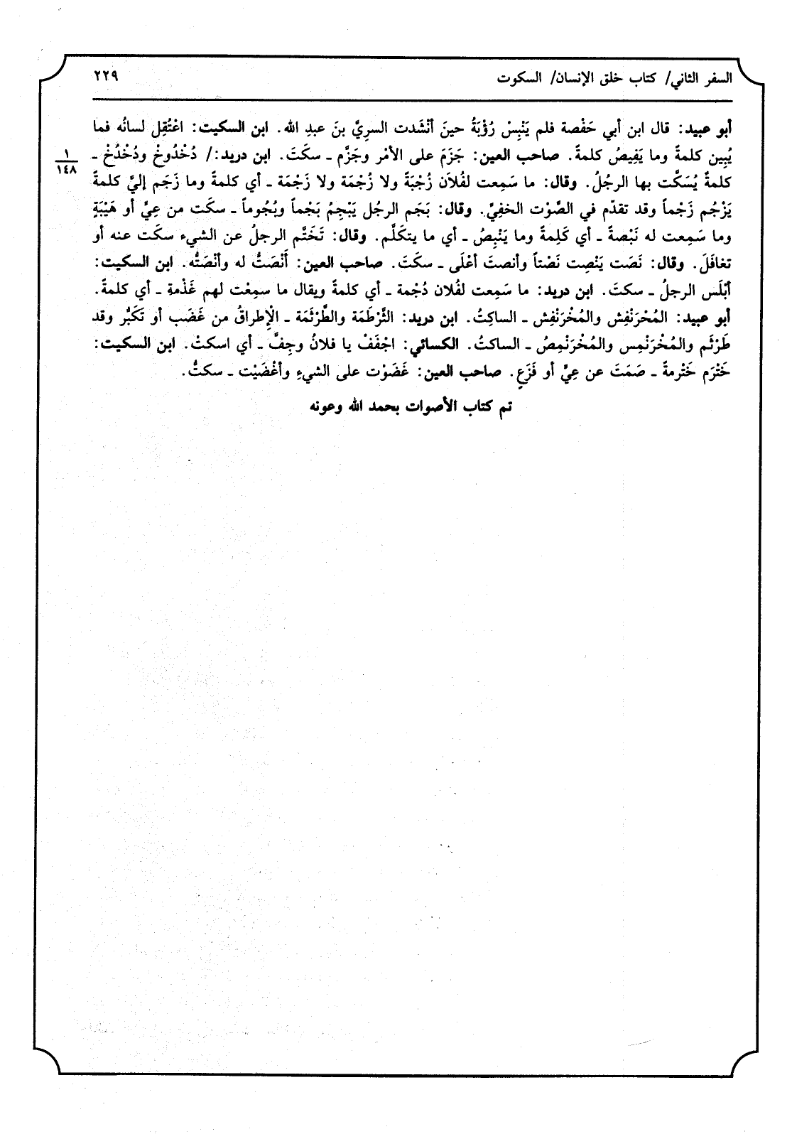 أَبُو عبيد، قَالَ ابْن أبِي حَفْصة فَلم يَنْبِسْ رُؤْبَةُ حينَ أنْشَدت السرِيَّ بنَ عبدِ الله، ابْن السّكيت، اعْتُقِل لسانُه فَمَا يُبِين كلمة وَمَا يَفِيصُ كلمة، صَاحب الْعين، جَزَم على الأَمْر وجَزَّم - سكَتَ، ابْن دُرَيْد، دُحْدُوخْ ودُخْدُخْ - كلمة يُسُكَتَّ بِهِ الرجُلُ، وَقَالَ، مَا سَمِعت لفُلاَن زُجْبَةً وَلَا زُجْمَة وَلَا زَجْمةً - أَي كلمة وَمَا زَجَم إليَّ كلمة يَزْجَم إليَّ كلمة يَزْجُم زَجْما وَقد تقدَّم فِي الصَّوْت الخفِيِّ، وَقَالَ، بجَمَ الرجُلُ يَبْجِمُ بَجْماً وبُجُوماً - سكَت عَن عِيٍ أَو هَيْبَةٍ وَمَا سَمِعت لَهُ نَبْصةً - أَي كَلِمةً وَمَا يَنْبِصُ - أَي مَا يتكَلَّم، وَقَالَ، تَختَّم الرجلُ عَن الشَّيْء سكَت عَنهُ أَو تغافَلَ، وَقَالَ، نَصَت يَنْصِت نَصْتاً وأنصتَ أعْلَى - سكَتَ، صَاحب الْعين، أَنْصَتُّ لَهُ وأَنْصَتُّه، ابْن السّكيت، أَبْلَس الرجُلُ - سكتَ، ابْن دُرَيْد، مَا سَمِعت لفُلان دُجْمة - أَي كلمة وَيُقَال مَا سمِعْت لَهُم غَذْمة - أَي كلمةٌ، أَبُو عبيد، المُحْرَنْفِش والمُخْرَنْفِش - الساكِتُ، ابْن دُرَيْد، الثَّرْطَمَة والطَّرْثَمَة - الإطراق من غَضَب أَو تَكَبرُّ وَقد طَرْثَم والمُخْرَنْمِس والمُخْرَنْمِصُ - الساكتُ، الْكسَائي، اجْفَفْ يَا فلانُ وجِفّ - أَي اسكتْ، ابْن السّكيت، خَتْرَم خَتْرمةً - صَمَتَ عَن عِيٍّ أَو فَزَعٍ، صَاحب الْعين، غَضَوْت على الشَّيءِ وأغْضَيْت - سكتُّ. تمّ كتاب الأَصْوات بِحَمْد الله وعونه