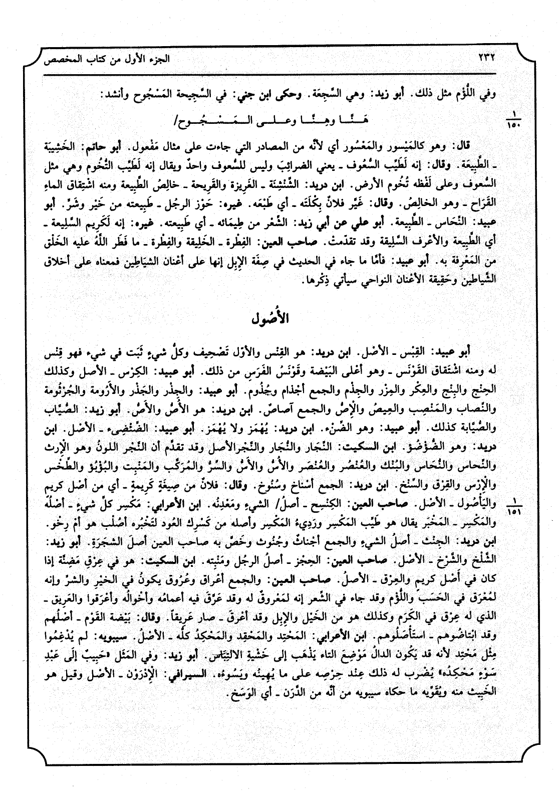 أَبُو عبيد، القِبْس - الأصْل، ابْن دُرَيْد، هُوَ القِنْس والأوّل تَصْحِيف وكلُّ شيءٍ ثَبَت فِي شَيْء فَهُوَ قِنْس لَهُ وَمِنْه اشْتِقاق القَوْنَس - وَهُوَ أعْلى البَيْضة وقَوْنَسُ الفَرَسِ من ذَلِك، أَبُو عبيد، الكِرْس - الأَصْل وَكَذَلِكَ الحِنْج والبِنْج والعِكْر والمِزْر والجِذْم وَالْجمع أجْذام وجُذُوم، أَبُو عبيد، والجِذْر والجِذْر والأَرُومة والجُرْثُومة والنِّصاب والمَنْصِب والعِيصُ والأصُّ وَالْجمع آصاصٌ، ابْن دُرَيْد، هُوَ الأُصُّ والأَصُّ، أَبُو زيد، الصُّيَّاب والصُّيَّابة كَذَلِك، أَبُو عبيد، وَهُوَ الضِّنْ، ابْن دُرَيْد، يُهْمَز وَلَا يُهْمَز، أَبُو عبيد، الضِّئْضئ - الأَصْل، ابْن دُرَيْد، وَهُوَ الضُّؤْضُؤ، ابْن السّكيت، النِّجَار والنُّجَار والنَّجْر - الأَصْل وَقد تقدَّم أَن النَّجْر اللونُ وَهُوَ الْإِرْث والنِّحاس والنُّحَاس والبُنْك والعُنْصُر والعُنْصَر والأُسُّ والأَسُّ والسِّرُّ والمُرَكَّب والمَنْبِت والبُؤْبؤ والطِخْس والإرْس والقِرْق والسِّنْخ، ابْن دُرَيْد، الْجمع أسْناخ وسُنُوخ، وَقَالَ، فلانٌ من صِيغَة كَرِيمةٍ - أَي من أصْل كريمٍ واليَأْصُول - الأَصْل، صَاحب الْعين، الكِنْسِح - أصلُ الشيءِ ومَعْدِنُه، ابْن الْأَعرَابِي، مَكْسِر كلِ شيءٍ - أصْلُه والمَكْسِر - المَخْبَر يُقَال هُوَ طَيِّب المَكْسِر ورَدِيءُ المَكْسِر وَأَصله من كَسْرِك العُود لتَخْبُره أصُلْب هُوَ أمْ رِخْو، ابْن دُرَيْد، الجِنْث - أصل الشيءِ وَالْجمع أجْناثٌ وجُنُوث وخَصَّ بِهِ صَاحب الْعين أصلَ الشَّجَرةِ، أَبُو زيد، الشَّلْخ والشَّرْخ - الأصْل، صَاحب الْعين، الحِجْز - أصلُ الرجُل ومَنْبِته، ابْن السّكيت، هُوَ فِي عِرْقِ مَضِنَّة إِذا كَانَ فِي اصْل كريمٍ والعِرْق - الأصلُ، صَاحب الْعين، وَالْجمع أعْراق وعُرُوق يكونُ فِي الخيْرِ والشرِّ وَإنَّهُ لمُعْرَق ف الحَسَب واللُّؤْم وَقد جَاءَ فِي الشِّعر إِنَّه لمَعْروقٌ لَهُ وَقد عَرَّقَ فِيهِ أعمامُه وأخْوالُه وأعْرَقوا والعَرِيق - الَّذِي لَهُ عِرْق فِي الكَرَم وَكَذَلِكَ هُوَ من الخَيْل والإبِل وَقد أعْرقَ - صَار عَرِيقاً، وَقَالَ، بَيْضة القَوْم - أصْلُهُم وَقد ابتاضُوهم - استأْصَلُوهم، ابْن الْأَعرَابِي، المَحْتِد والمَحْقِد والمَحْكِدُ كلُّه - الأصْلُ، سِيبَوَيْهٍ، لم يُدْغِمُوا مِثْل مَحْتِد لِأَنَّهُ قد يَكُون الدالُ مَوْضِعَ التَّاء يَذْهَب إِلَى خَشْيةِ الالتِبَاس، أَبُو زيد، وَفِي المَثَل حَبِيبٌ إِلَى عَبْدِ سَوْءٍ مَحْكِدُه، يُضْرب لَهُ ذَلِك عِنْد حِرْصِه على مَا يُهِينُه ويَسُوءُه، السيرافي، الادْرَوْن - الأَصْل وَقيل هُوَ الخَبِيث مِنْهُ ويُقَوِّيه مَا حَكَاهُ سِيبَوَيْهٍ من أنَّه من الدَّرَن - أَي الوَسَخ.
