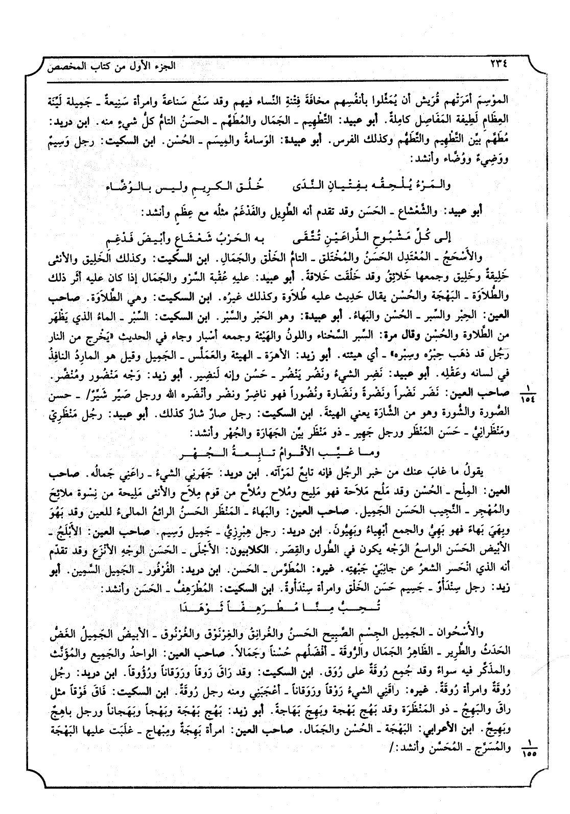 الموْسِمَ أمَرَتْهم قُرَيش أَن يُمَثِّلوا بأنفُسِهم مخافَةً فِتْنةِ النِّساء فيهم وَقد سَنُع سَناعةً وَامْرَأَة سَنِيعةٌ - جَمِيلة لَيِّنة العِظَام لَطِيفة المَفَاصِل كامِلةُ، أَبُو عبيد، التَّطْهِيم - الجَمَال والمُطَهَّم - الحَسَنُ التامُّ كلُّ شيءٍ مِنْهُ، ابْن دُرَيْد، مُطَهَّم بينَ التَّطْهِيم والتَّطَهُّم وَكَذَلِكَ الْفرس، أَبُو عبيد، الوَسامةُ والمِيسَم - الحُسْن، ابْن السّكيت، رجل وَسِيمٌ ووَضِيءٌ ووُضَّاء وَأنْشد: والمَرْءُ يُلْحقُه بِفتْيان النَّدَى خُلُق الكَرِيمِ وَلَيْسَ بالوُضَّاء أَبُو عبيد، والشَّعْشاع - الحَسَن وَقد تقدم أَنه الطَّوِيل والفدْغَمُ مثلُه مَعَ عِظَمٍ وَأنْشد: إِلَى كُلِّ مَشْبُوحِ الذِّراعَيْنِ تُتَّقَى بِهِ الحَرْبُ شَعْشَاعٍ وأبْيضَ فَدْغَمِ والأسْحَجُ - المُعْتَدِل الحَسَنُ المُخْتَلَق - التامُّ الخَلْق والجَمَالِ، ابْن السّكيت، وَكَذَلِكَ الخَلِيق وَالْأُنْثَى خَلِيقةٌ وخَلِيق وَجَمعهَا خَلائِقُ وَقد خَلُفَت خَلاقةً، أَبُو عبيد، عَلَيْهِ عُقْبة السَّرْو والجَمَال إِذا كَانَ عَلَيْهِ أثَر ذَلِك والطُّلاَوَة - البَهْجَة والحُسْن يُقَال حَدِيث عَلَيْهِ طُلاَوة وَكَذَلِكَ غيرُه، ابْن السّكيت، وَهِي الطَّلاوَة، صَاحب الْعين، الحِبْر والسِّبْر - الحُسْن والبَهاءُ، أَبُو عُبَيْدَة، وَهُوَ الحَبْر والسَّبْر، ابْن السّكيت، السِّبْر - الماءُ الَّذِي يَظْهَر من الطَّلاوة والحُسن وَقَالَ مرّة السِّبر السَّحْناء واللونُ والهَيْئة وَجمعه أسْبار وَجَاء فِي الحَدِيث يَخْرج من النَّار رجُل قد ذهَب حِبْرُه وسِبرْره - أَي هَيئته، أَبُو زيد، الأهرَة - الْهَيْئَة والعَمَلَّس - الجَمِيل وَقيل هُوَ المارِدُ النافِذُ فِي لِسَانه وعَقْلِه، أَبُو عبيد، نَضِر الشّيءُ ونَضُر يَنْضُر - حَسُن وَإنَّهُ لنضِير، أَبُو زيد، وَجْه مَنْضُور ومُنَضَّر، صَاحب الْعين، نَضَر نَضْرا ونَضْرةً ونَضَارة ونُضُوراً فَهُوَ ناضِرٌ ونضْر وأنْضَره الله وَرجل صَبِّرشَيِّرٌ - حسن الصُّورة والشُّورة وَهُوَ من الشّارَة يعنِي الهيئةَ، ابْن السّكيت، رجل صارٌ شارٌ كَذَلِك، أَبُو عبيد، رجُل مَنْظَرِيّ ومَنْظَرانِيُّ - حَسَن المَنْظَر وَرجل جَهِير - ذُو مَنْظَر بيِّن الجَهَارة والجُهْر وَأنْشد: وَمَا غيَّب الأقْوامُ تابِعةُ الجُهْر يقولُ مَا غابَ عَنْك خبر الرجُل فَإِنَّهُ تابِعٌ لَمرْآته، ابْن دُرَيْد، جَهَرنِي الشيءُ - راعَنِي جَمالُه، صَاحب الْعين، المِلْحْ - الحُسْن وَقد مَلُح مَلاَحة فَهُوَ مَلِيح ومُلاح ومُلاَّح من قومٍ ملاَح وَالْأُنْثَى مَلِيحة من نِسْوة ملائِحَ والمَهْجِر - النَّجِيب الحَسَن الجَمِيل، صَاحب الْعين، والبَهاءُ - المَنْظَر الحَسنُ الرائعُ المالئُ للعين وَقد بَهُوَ وبَهِيَ بهاءً فَهُوَ بَهِيٌّ وَالْجمع أبْهِياءُ وبَهِيُّونَ، ابْن دُرَيْد، رجل هِبْرِزِيٌّ - جَمِيل وَسِيم، صَاحب الْعين، الأَبْلَجُ - الأبْيض الحَسَن الواسعُ الوَجْه يكون فِي الطُّول والقِصَر، الكلابيون، الأَجْلَى - الحَسَن الوجْهِ الأنْزَع وَقد تقدم أَنه الَّذِي انْحَسر الشعرُ عَن جانِبَي جَبْهتِه، غَيره، المُطَوَّس - الحَسَن، ابْن دُرَيْد، الفُرفور - الجَمِيل السَّمِين، أَبُو زيد، رجلِ سنْدَأْوٌ - جَسِيم حَسَن الخلْق وَامْرَأَة سِنْدَأْوةٌ، ابْن السّكيت، المُطَّرَهِفُّ - الحَسَن وَأنْشد تُحِبُّ منَّا مُطْرَهِفَّاً ثَوْهَدَا الأَسْحُوان - الجَمِيل الجِسْيم الصَّبيح الحسَنُ والغُرانِقُ والغِرْنوق والغُرْنُوق - الأبيضُ الجَمِيلُ الغَضُّ الحَدَثُ والطَّرِير - الظَاهر الجَمال والرُّوقَة - أفْضَلُهم حُسْناً وجَمَالاً، صَاحب الْعين، الواحدُ والجَمِيع والمُؤَنَّث والمذَكَّر فِيهِ سواءٌ وَقد جُمِع رُوقَةٌ على رُوَق، ابْن السّكيت، وَقد راقَ رَوْقاً ورَوَقاناً ورُؤُوقاً، ابْن دُرَيْد، رجُل رُوقَةٌ، ابْن السّكيت، فَاقَ فوْق