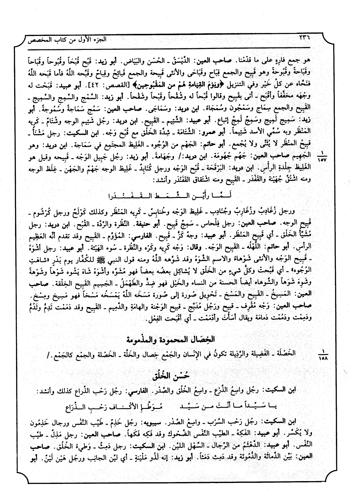 هُوَ جمع فارِهٍ على مَا قدّمْنا، صَاحب الْعين، الدَّيْسَقُ - الحُسْن والبَيَاض، أَبُو زيد، قَبُح قُبْحَاً وقُبُوحاً وقُبَاحاً وقَبَاحةٍ وقُبُوحةً وَهُوَ قَبِيح وَالْجمع قِبَاح وقَبَاحَى وَالْأُنْثَى قَبِيحة وَالْجمع قَبائِحُ وقِباحٌ وقَبَّحه الله فَأَما قَبَّحه اللهُ فنَحَّاه عَن كلِّ خير وَفِي التَّنْزِيل ويَوْمَ القِيامةُ هُمْ من المَقْبُوحِين، أَبُو عبيد، قَبَحْت لَهُ وجْهَه مخفَّفاً وأقْبَح - أَتَى بقَبِيح وَقَالُوا قُبْحاً لَهُ وشُقْحاً وقَبْحاً وشَقْحاً، أَبُو زيد، السَّمْج والسَّمِجِ والسَّمِيج - القَبِيح وَالْجمع سِمَاج وسَمْجُون وسُمَجَاءُ، ابْن دُرَيْد، وسَمَاجَى، صَاحب الْعين، سَمُج سَمَاجةً وسُمُوجةً، أَبُو زيد، سَمِيج لَمِيج وسَمِجٌ لَمِجٌ إتباع، أَبُو عبيد، الشَّتيم - القَبِيح، ابْن دُرَيْد، رجُل شَتِيم الْوَجْه وشُتَامٌ - كَرِيه المَنْظَر وَبِه سُمِّي الْأسد شَتِيماً، أَبُو عَمْرو، الشَّتَامَة - شِدَّة الخَلْق مَعَ قُبْح وَجْه، ابْن السّكيت، رجل مَشْنَأٌ - قبِيحُ المنْظَر لَا يُثَنَّى وَلَا يُجْمع، أَبُو حَاتِم، الجَهْم من الوُجُوه - الغَلِيظ المجتَمِع فِي سَمَاجة، ابْن دُرَيْد، وَهُوَ الجَهِيم، صَاحب الْعين، جَهُم جُهُومَة، ابْن دُرَيْد، وجَهَامةً، أَبُو زيد، رجُل جَبِيل الوَجْه - قَبِيحه وَقيل هُوَ الغَلِيظ جِلْدةِ الرأْسِ، ابْن دُرَيْد، البَرْقَحَة - قُبْح الوَجْه وَرجل كُنَابِدٌ - غَلِيظ الْوَجْه جَهْمٌ والجَهْن - غَلِظ الْوَجْه وَمِنْه اشتُقَّ جُهَيْنة والقَفْدَر - القَبِيح وَمِنْه اشْتِقاق القَفَنْدَر وَأنْشد لَمَّا رأَيْن الشَّمَط القَفَنْدَرا وَرجل زُغَادِبٌ وزُغَارِبُ وجُنَادِب - غَلِيظ الوَجْه وخُنابِسٌ - كَرِيه المَنْظَر وَكَذَلِكَ كَوْلَحٌ وَرجل كُرْشُوم - قَبيح الْوَجْه، صَاحب الْعين، رجل فِلْحاس - سَمجٌ قَبيح، أَبُو حنيفَة، النَّظْرة والرَّدَّة - القُبْح، ابْن دُرَيْد، رجل مُشَيَّأُ الخَلْق - أبي قَبيح المنْظَر، أَبُو عبيد، وجهٌ كَزٌّ - قَبِيح، الْفَارِسِي، المُؤَوَّم - القَبِيح وَقد تقدم أنَّه العَظِيم الرأسِ، أَبُو حَاتِم، اللُّهْلُه - القَبِيح الوَجْه، وَقَالَ، وَجْه كَرِيه وكَرْه والنَّظْرة - سُوء الهَيْئة، أَبُو عبيد، رجل أشْوَهُ - قَبِيح الوَجْه وَالْأُنْثَى شَوْهاءُ وَالِاسْم الشَّوَهُ وَقد شَوَّهه اللهُ وَمِنْه قَول النَّبِي عَلَيْهِ السَّلَام للكُفَّار يَوْم بَدْرٍ شاهَتِ الوُجُوه - أَي قَبُحتْ وكلُّ شيءٍ من الخَلْق لَا يُشاكِل بعضُه بَعْضًا فَهُوَ مُشَوَّه وأشْوَهُ شاهَ يَشُوه شَوْهاً وشَوْهةً وشَوِهَ شَوَهاً والشَّوْهاء أَيْضا - الحَسَنة من النِّساء والخَيْل فَهُوَ ضِدُّ والطَّهْمَلُ - الجَسِيم القَبِيح الخِلْقة، صَاحب الْعين، المَسِيخُ - القَبيح والمَسْخ - تَحْوِيل صُورة إِلَى صُورة مَسَخه اللهُ يَمْسَخُه مَسْخاً فَهُوَ مَسِيخ ومِسْخ، صَاحب الْعين، وَجْهٌ مُقْرِف - قَبيح ورَجُل مُدَبَّجَ - قَبِيح الوَجْه والهامَةِ والدَّمِيم - القَبيح وَقد دَمَمْت تَدِمُّ وتَدُمُّ ودَمِمْت ودَمُمْت دَمامَة وَيُقَال أسأْتَ وأدْمَمْت - أَي أقْبَحت الفِعْل.