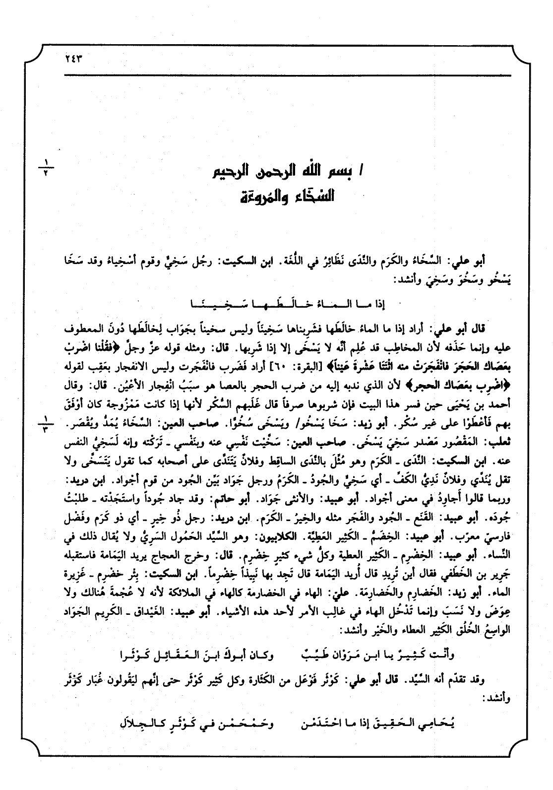 أَبُو عَليّ، السَّخَاءُ والكَرَم والنَّدَى نَظَائِرُ فِي اللُّغَة، ابْن السّكيت، رجُل سَخِيٌّ وَقوم أسْخِياءُ وَقد سَخَا يَسُْخو وسَخُوَ وسَخِيَ وَأنْشد: إِذا مَا المَاء خالَطَها سَخِينَا قَالَ أَبُو عَليّ، أَرَادَ إِذا مَا الماءُ خالَطَها فشَرِبناها سَخِينَا وَلَيْسَ سَخِينَا بَجَوَاب لِخالَطَها دُونَ الْمَعْطُوف عَلَيْهِ وَإِنَّمَا حَذَفه لِأَن المخاطِب قد عُلِم أنَّه لَا يَسْخَى إِلَّا إِذا شَرِبها، قَالَ، وَمثله قَوْله عزًَّ وجَلَّ (فقُلْنا اضْرِبْ بعَصَاك الحَجَرَ فانْفَجَرَتْ مِنْهُ اثْنَتا عشْرةَ عَيْناً) أَرَادَ فضَرب فانْفَجَرَت وَلَيْسَ الانفجار بعَقِب لقَوْله اضْرِب بعَصَاك الْحجر لِأَن الَّذِي نَدبه إِلَيْهِ من ضرب الْحجر بالعصا هُوَ سببُ انْفجار الأعْيُن، قَالَ، وَقَالَ أَحْمد ابْن يَحْيَى حِين فسر هَذَا الْبَيْت فَإِن شَرِبُوهَا صرفا قَالَ غَلَبهم السُّكْر لِأَنَّهَا إِذا كَانَ مَمْزُوجة كَانَ أوْفَقَ بهم فأعْطَوْا على غير سُكْر، أَبُو زيد، سَخَا يَسْخُو ويَسْخَى سُخُوَّاً، صَاحب الْعين السَّخَاءُ يُمَدُّ ويُقْصَر، ثَعْلَب، المَقْصُور مَصْدر سَخِيَ يَسْخَى، صَاحب الْعين، سَخَّيْت نَفْسِي عَنهُ وبنَفْسي - تَرَكْته وَإنَّهُ لَسَخِيُّ النَّفس عَنهُ، ابْن السّكيت، النَّدَى - الكَرَم وَهُوَ مُثِّلَ بالنَّدى الساقِط وفلانٌ يَتَنَدَّى على أَصْحَابه كَمَا تَقول يَتَسَخّى وَلَا تقل يُنَدِّي وفلانٌ نَدِيُّ الكَفِّ - أَي سَخِيُّ والجُودُ - الكَرَمُ وَرجل جَوَاد بَيِّن الجُود من قوم أجْواد، ابْن دُرَيْد، وَرُبمَا قَالُوا أجاوِدُ فِي معنى أجْواد، أَبُو عبيد، وَالْأُنْثَى جَوَاد، أَبُو حَاتِم، وَقد جاد جُوداً واستَجَدْته - طَلبْتُ جُودَه، أَبُو عبيد، الفَنَع - الجُود والفَجَر مثله والخِيرُ - الكَرَم، ابْن دُرَيْد، رجل ذُو خِيرٍ - أَي ذُو كَرَم وفَضْل فارسيّ معرّب، أَبُو عبيد، الخِضَمُّ - الكَثِير العَطِيَّة، الكلابيون، وَهُوَ السَّيِّد الحَمُول السَرِيُّ وَلَا يُقال ذَلِك فِي النِّساء، أَبُو عبيد، الخِضِمُّ - الكَثِير الْعَطِيَّة وكلُّ شَيْء كثيرٍ خضْرِم، قَالَ، وَخرج العجاج يُرِيد اليَمَامة فَاسْتَقْبلهُ جَرَير بن الخَطَفَي فَقَالَ أَيْن تُرِيد قَالَ أُرِيد اليمَامة قَالَ تَجِد بهَا نَبِيذاً خِضْرِماً، ابْن السّكيت، بِئْرِ خَْرِم - غَزِيرة المَاء، أَبُو زيد، الخَضارِم والخَضارِمَة، عليّ، الْهَاء فِي الخَضارمة كالهاء فِي الْمَلَائِكَة لِأَنَّهُ لَا عُجْمةَ هُنالك وَلَا عِوَضَ وَلَا نَسَبَ وَإِنَّمَا تَدْخُل الْهَاء فِي غالِب الْأَمر لأحد هَذِه الْأَشْيَاء، أَبُو عبيد، الغَيْداق - الكَرِيم الجَوَاد الواسِعُ الخُلُق الكَثِير الْعَطاء والخَيْر وَأنْشد: وأنْت كَثِيرٌ يَا ابنَ مَرْوانَ طَيِّبٌ وَكَانَ أبوكَ ابنَ العَقَائِل كَوْثَرا وَقد تقدّم أَنه السِّيِّد، قَالَ أَبُو عَليّ، كَوْثَر فَوْعَل من الكَثَارة وكل كَثِير كَوْثَر حَتَّى إنَّهم ليَقُولون غُبَار كَوْثَر وَأنْشد: يُحَامِي الحَقِيقَ إِذا مَا احْتَدَمْن وجحَمْن فِي كَوْثَرٍ كالجِلاَل