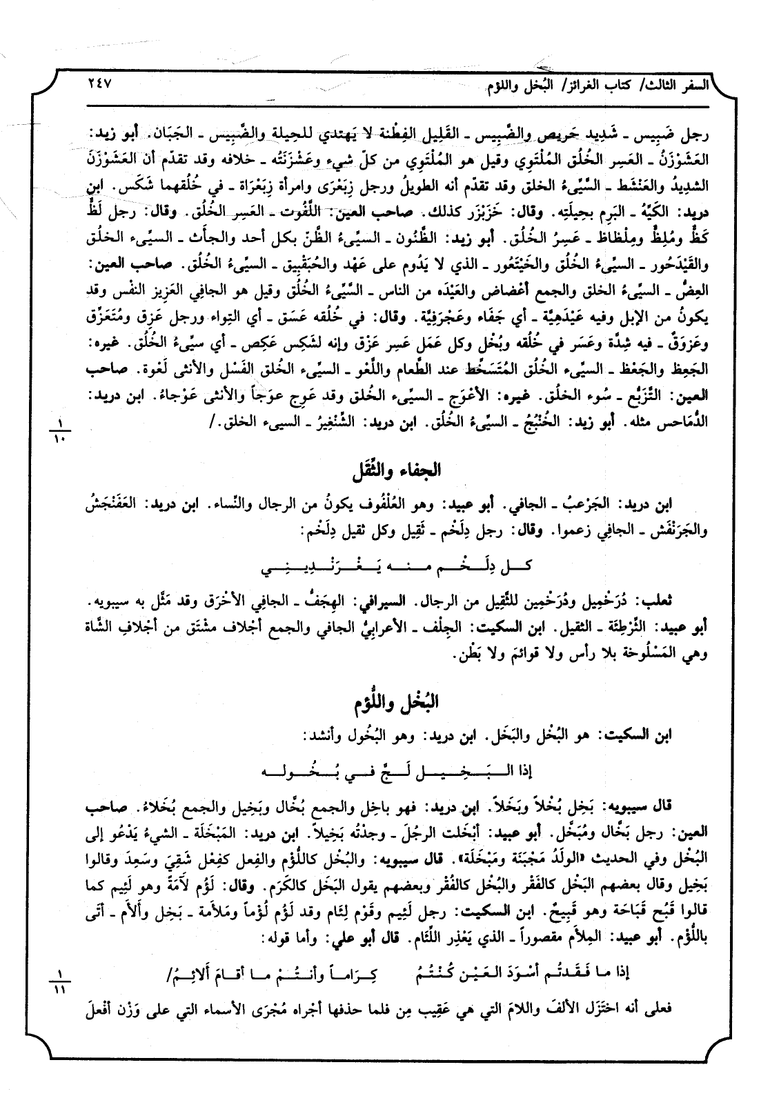 ابْن دُرَيْد، الجَرْعبُ - الجافي، أَبُو عبيد، وَهُوَ العُلْفُوف يكونُ من الرِّجَال والنِّساء، ابْن دُرَيْد، العَفَنْجَشُ والجَرَنْفَش - الجافِي زَعَمُوا، وَقَالَ، رجل دِلَخْم - ثَقِيل وكل ثَقيل دِلَخْم. كل دِلَخْم مِنْهُ يَغْرَنْدِيني ثَعْلَب، دُرَخْمِيل ودُرَخْمِين للثَّقِيل من الرِّجَال، السيرافيّ، الهِجَفُّ - الجافِي الأخْرَق وَقد مَثَّل بِهِ سِيبَوَيْهٍ، أَبُو عبيد، الثِّرْطِئَة - الثقيل، ابْن السّكيت، الجِلْف - الأعرابِيُّ الجافي وَالْجمع أجْلاف مشْتَق من أجْلافِ الشَّاة وَهِي المَسْلُوخة بِلَا رأْس وَلَا قوائمَ وَلَا بَطْن.