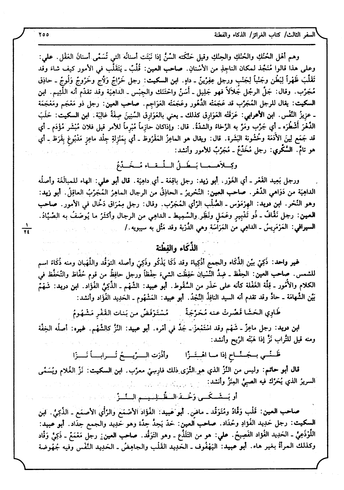 غير، ذَكِيّ بَيِّن الذَكَاء وَالْجمع أذْكِياءُ وَقد ذَكَا يَذْكُوُ وذَكِيَ وَأَصله التوَقُّد واللَهَبان وَمِنْه ذُكَاءُ اسْم الشَّمْس، صَاحب الْعين، الحِفْظ - ضِدُّ النِّسْيان حَفِظْت الشيءَ حِفْظاً وَرجل حافِظٌ من قوم حُفَّاظ والتَّحَفُّظ فِي الْكَلَام والأمُور - قِلَّة الغَفْلة كَأَنَّهُ على حَذَر من السُّقُوط، أَبُو عبيد، الشَّهْم - الفُؤَاد، ابْن دُرَيْد، شَهْمٌ بَيِّن الشَّهامَة - حادٌّ وَقد تقدم أَنه السَّيِّد النافِذُ النَّجْدُ، أَبُو عبيد، المَشْهُوم - الحَدِيد الفُؤَاد وَأنْشد: طَاوي الحَشَا قَصَّرتْ عَنهُ مُحْرَّجَةٌ مُسْتَوْفَضٌ من بَنات القَفِر مَشْهُومُ ابْن دُرَيْد، رجل ماعِزٌ - شَهْم وَقد اسْتَمْعَز - جَدَّ فِي أمْره، أَبُو عبيد، النَّزُّ كالشَّهْم، غَيره، اسلُه الخِفَّة وَمِنْه قيل للتُّراب نَزٌّ إِذا هَبَتْه الرِّيح وَأنْشد: ظَنِّي بجَنَّاحٍ إِذا مَا اهْتَزَّ وأذْرَت الرِّيحُ تُراباً نَزَّا قَالَ أَبُو حَاتِم، وَلَيْسَ من النَّزِّ الَّذِي هُوَ الثَّرى ذَلِك فارِسيّ معرِّب، ابْن السّكيت، نَزَّ الغُلام ويُسَمَّى السريرُ الَّذِي يُحَرِّك فِيهِ الصبِيُّ المِنَزُّ وَأنْشد: أَو بَشَكي وَخْد الظَّلِيم النَّزِّ صَاحب الْعين، قلْب وَقَّادٌ ومُتَوَقِّد - ماضٍ، أَبُو عبيد، الفُؤَاد الأصْمَع والرَّأْي الأصمَع - الذَكِيُّ، ابْن السّكيت، رجل حَدِيد الفُؤادِ وحُدَاد، صَاحب الْعين، حَدّ يَحِدُّ حِدّيحدُّ حِدَّة وَهُوَ حَدِيد وَالْجمع حِدَاد، أَبُو عبيد، اللّوْذَعِيُّ - الحَدِيد الفُؤاد الفَصِيحُ، عَليّ، هُوَ من التَلَذُع - وَهُوَ التَوَقُّد، صَاحب الْعين، رجل مَعْمَعٌ - ذَكٌِّ وَقَّاد وَكَذَلِكَ المرأةُ بِغَيْر هَاء، أَبُو عبيد، اليَهْفُوف - الحَدِيد القَلْب والجاهِضُ - الحَدِيد النَّفْس وَفِيه جُهُوضة