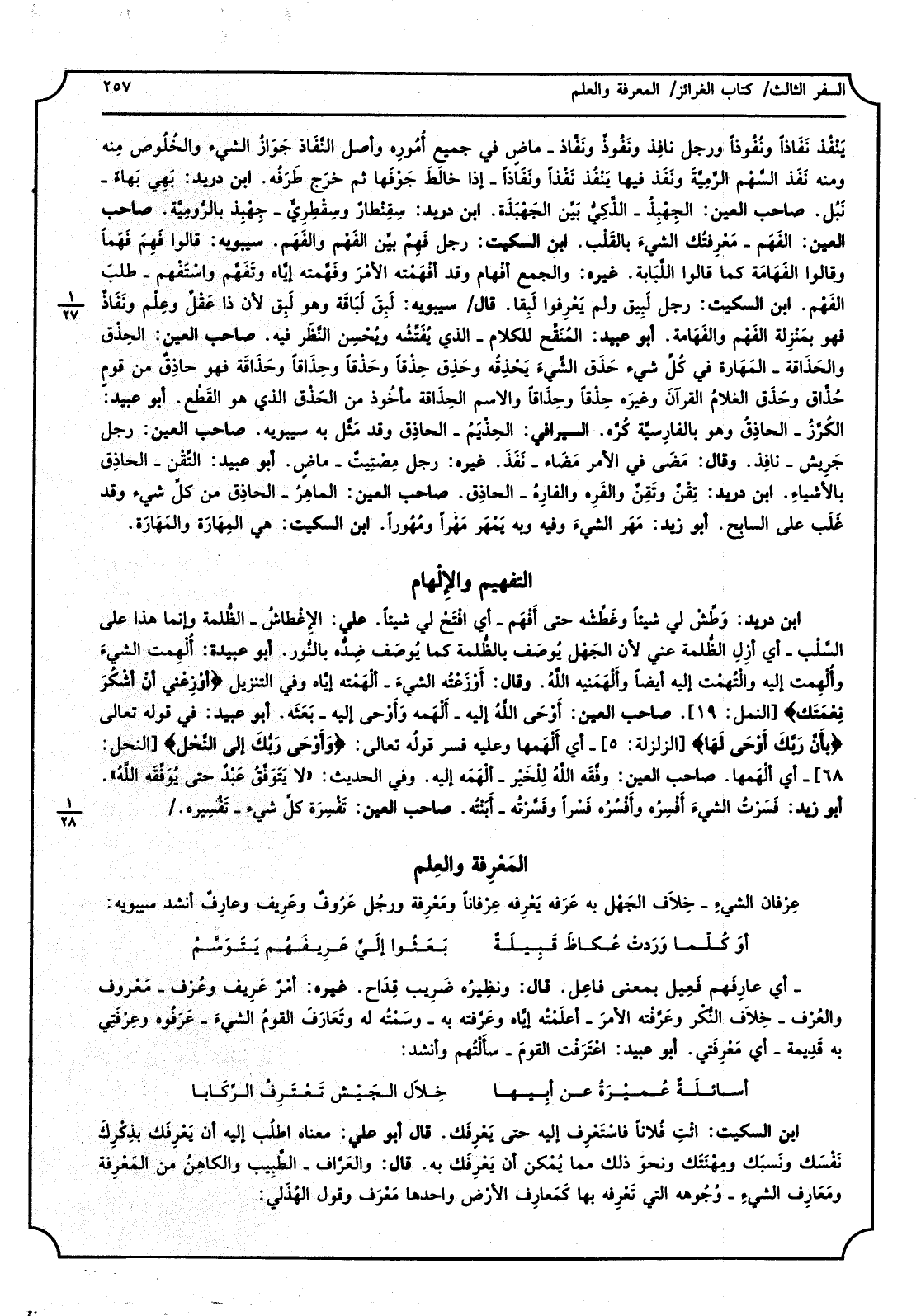 ابْن دُرَيْد، وَطِّشْ لي شيأ غَطِّشْه حَتَّى أَفْهَم - أَي افْتَحْ لي شيأ، عَليّ، الاغْطاشُ - الظُّلمة وَإِنَّمَا هَذَا على السَّلْب - أَي أزِلِ الظُّلمة عني لِأَن الجَهْل يُوصَف بالظُّلمة كَمَا يُوصَف ضِدُّ بالنُّور، أَبُو عُبَيْدَة، أُلْهِمت الشيءَ وأُْهِمت إِلَيْهِ والْتُهمْت إِلَيْهِ أَيْضا وأَلْهَمَنيه اللهُ، وَقَالَ، أَوْزَعْتُهُ الشيءَ - أْلَهمته إيَّاه وَفِي التَّنْزِيل أَوزَعَنِي أنْ أشْكُرَ نِعْمَتَك، صَاحب الْعين، أَوْحَى اللهُ إِلَيْهِ - أَلْهَمه وَأَوْحى إِلَيْهِ - بَعَثَه، أَبُو عبيد، فِي قَوْله تَعَالَى بأَنَّ رَبَّكَ أَوْحَى لَهَا - أَي أَلْهَمها وَعَلِيهِ فسر قولهُ تَعَالَى وَأَوْحى رَبُّكَ إِلَى النَّحْل - أَي أَلْهَمها، صَاحب الْعين، وفَّقَه اللهُ لِلْخَيْر - أَلْهَمَه إِلَيْهِ، وَفِي الحَدِيث لَا يَتَوفَّقُ عَبدٌ حَتَّى يُوَفِقَه اللهُ، أَبُو زيد، فَسَرْتُ الشيءَ أَفْسِرُه وأَفْسُرُه فَسْراً وفَسَّرْتُه - أَبَنْتُه، صَاحب الْعين، تَفْسِرَة كلِّ شَيْء - تَفْسِيره.