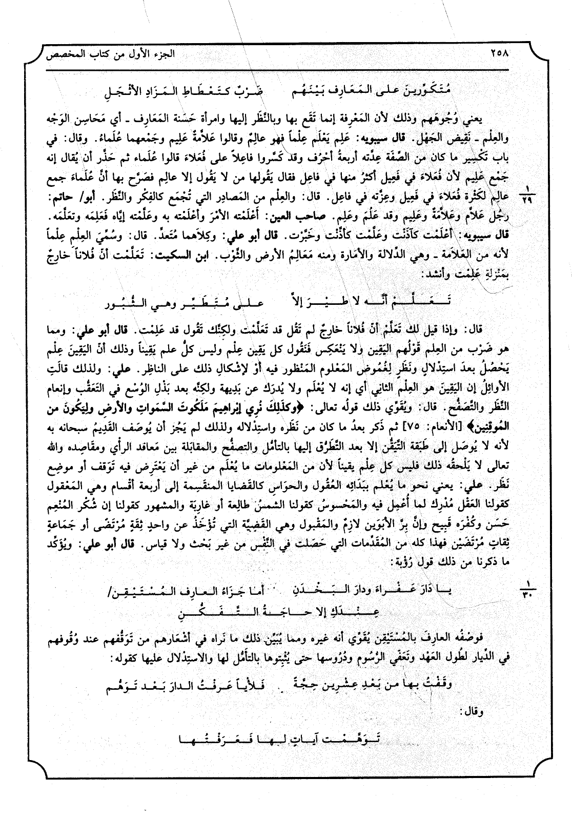 مُتَكَوِّرينَ على المَعَارِف بَيْنُهم ضَرْبٌ كتَعْطَاطِ المَزَادِ الأثْجَلِ يَعْنِي وُجُوهَهم وَذَلِكَ لِأَن المَعْرِفة إِنَّمَا تَقَع بهَا وبالنَّظَر إِلَيْهَا وامرأَة حَسَنة المَعَارِف - أَي مَحَاسِن الوَجْه والعِلْم - نَقَيض الجَهْل، قَالَ سِيبَوَيْهٍ، عَلِم يَعْلَم عِلْماً فَهُوَ عالمٌ وَقَالُوا عَلاَّمةٌ عَلِيم وجَمْعهما عُلَماءُ، وَقَالَ، فِي بَاب تَكْسِير مَا كَانَ من الصِّفة عِدْته أربعةُ أحْرُف وَقد كَسَّروا فاعِلاً على فُعَلاءَ قَالُوا عُلَماء ثمَّ حَذَّر أَن يُقال إِنَّه جَمْع عَلِيم لن فُعَلاءَ فِي فَعِيل أكثرُ مِنْهَا فِي فاعِل فَقَالَ يَقُوها من لَا يَقُول إِلَّا عالِم فصَرَّح بهَا أنَّ عُلَماءَ جمع عالمِ لكَثْة فُعَلاءَ فِي فَعِيل وعِزَّته فِي فاعِل، قَالَ، والعِلْم من المَصادِر الَّتِي يُجْمَع كالفِكْر والنَّظَر، أَبُو حَاتِم، رجُل عَلاَّم وعَلاَّمَةٌ وعَلِيم وَقد عَلُمَ وعَلِم، صَاحب الْعين، أَعْلَمْته الأمْرَ وأعْلَمْته بِهِ وعَلَّمْته إيَّاه فَعَلِمَه وتَعَلَّمَه، قَالَ سِيبَوَيْهٍ، أعْلَمْت كآذَنْت وعَلَّمْت كأذَنْت وخَبَّرْت، قَالَ أَبُو عليّ، وكِلاَهما مُتَعدٍّ، قَالَ، وسُمِّيَ العِلْمِ عِلْماً لِأَنَّهُ من العَلاَمة - وَهِي الدِّلالة والأمَارة وَمِنْه مَعَالِمُ الأَرْض والثَّوْب، ابْن السّكيت، تَعَلَّمْت أنّ فُلاناً خارِجٌ بمَنْزِل عَلِمْت وَأنْشد: تَعَلَّمْ إنَّه لَا طيْرَ إلاَّ على مُتَطَيِّر وَهِي الثُّبُور قَالَ، وَإِذا قيل لَك تَعَلَّمْ أنّ فُلاناً خارِجٌ لم تَقُل قد تَعَلَّمْت ولكنَّك تَقُول قد عَلِمْت، قَالَ أَبُو عَليّ، وَمِمَّا هُوَ ضَرْب من العِلم قَوْلُهم اليَقِين وَلَا يَنْعَكِس فَنَقُول كل يَقِين عِلْم وَلَيْسَ كلُّ علم يَقيناً وَذَلِكَ أنّ اليّقِينَ علْم يَحْصُلُ بعدَ استِدْلالٍ ونَظَرٍ لِغُمُوض المَعْلوم المَنْظُور فِيهِ أوْ لإشكال ذَلِك على الناظِر، عَليّ، وَلذَلِك قالَتِ الأوائِلُ إِن اليَقِينَ هُوَ العِلْم الثانِي أَي أَنه لَا يُعْلَم وَلَا يُدرَك عَن بَدِيهة ولكِنَّه بعد بَذْلِ الوُسْع فِي التَعَقُّب وإنعام النَّظَر والتَّصَفُّح، قَالَ، ويُقَوِّي ذَلِك قولُه تَعَالَى وكذَلِكَ نُرِي إبْراهيمَ مَلَكُوتَ السّمواتِ وَالْأَرْض ولِيَكُونَ من المُوقِنِين ثمَّ ذَكر بعدُ مَا كَانَ من نَظَره واستِدْلاله وَلذَلِك لم يَجُز أَن يُوصَف القَدِيمُ سُبْحَانَهُ بِهِ لِأَنَّهُ لَا يُصَل إِلَى طَبَقة التَّيَقُّن إِلَّا بعد التَّطَرُّق إِلَيْهَا بالتأمُّل والتصفُّح والمقابَلة بَين مَعاقِد الرأْي ومقَاصِده وَالله تَعَالَى لَا يَلْحقُه ذَلِك فَلَيْسَ كل عِلْم يقِينا لِأَن من المَعْلومات مَا يُعْلَم من غير أَن يَعْتَرِض فِيهِ تَوَقف أَو موضِع نَظَر، عَليّ، يَعْنِي نَحْو مَا يُعْلم ببَدائِه العُقُول والحوَاسَ كالقَضَايا المنقَسِمة إِلَى أَرْبَعَة أقْسام وَهِي المَعْقول كَقَوْلِنَا العَقْل مُدْرِك لما اُعْمِل فِيهِ والمَحْسوسُ كَقَوْلِنَا الشَّمْس طلعة أَو غارِبَة وَالْمَشْهُور كَقَوْلِنَا إِن شُكْر المُنْعِم حَسَن وكُفْرَه قَبِيح وإنَّ بِرَّ الأبَوَين لازِمٌ والمَقْبول وَهِي القَضِيَّة الَّتِي تُؤْخَذُ عَن واحدٍ ثِقَةٍ مُرْتَضَى أَو جَمَاعةٍ ثِقاتٍ مُرْتَضَين فَهَذَا كُله من المُقَدِّمات الَّتِي حَصَلت فِي النَّفْس من غير بَحْث وَلَا قِيَاس، قَالَ أَبُو عَليّ، ويُؤَكِّد مَا ذكرنَا من ذَلِك قَول رُؤْبة: يَا دَارَ عَفْراءَ ودارَ البَخْدَنِ أما جَزَاءُ العارِف المُسْتَيْقِن فوصْفُه العارِفَ بالمُسْتَيْقِن يُقَوّي أَنه غَيره وَمِمَّا يُبَيِّن ذَلِك مَا نَراه فِي أشْعارهم من تَوَقُّفهم عِنْد وُقُوفهم فِي الدِّيار طُول العَهْد وتَعَفِّي الرُّسُوم ودُرُوسها حَتَّى يُثْبِتوها بالتأَمُّل لَهَا والاستِدْلال عَلَيْهَا كَقَوْلِه: وقَفْتُ بهَا من بَعْد عِشْر