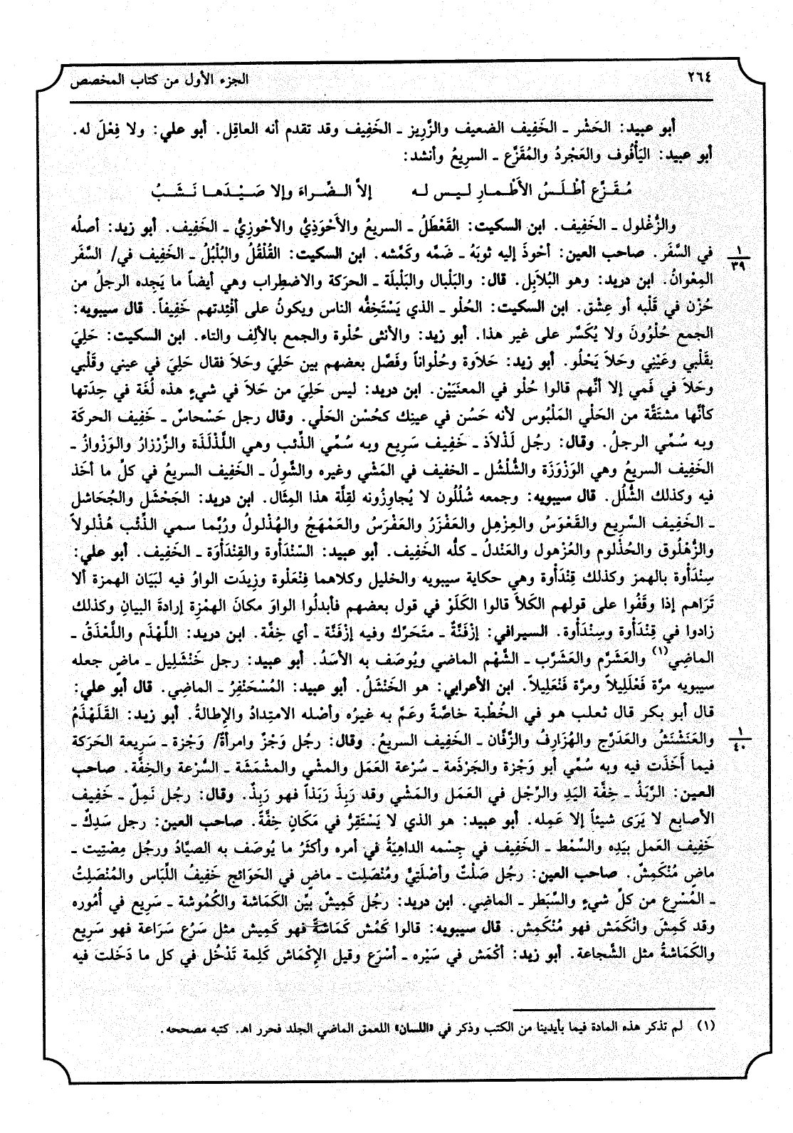 أَبُو عبيد، الحَشْر - الخَفِيف والزَّرِين - الخَفِيف وَقد تقدم أَنه العاقِل، أَبُو عَليّ، وَلَا فِعْل لَهُ، أَبُو عبيد، اليَأْفُوف والعَجْردُ والمُقَزَّع - السرِيعُ وَأنْشد: مُقَزَّعٌ أطْلَسُ الأَطْمارِ لَيْسَ لَهُ إلاَّ الضِّراءَ وَإِلَّا صَيْدَها نَشَبُ والزُّغْلول - الخَفِيف، ابْن السّكيت، القَعْطَلُ - السريعُ والأَحْوَذِيُّ والأَحْوزِيُّ - الخَفِيف، أَبُو زيد، أصلُه فِي السَّفَر، صَاحب الْعين، أحْوذَ إِلَيْهِ ثوبَهُ - ضمَّه وكَمَّشه، ابْن السّكيت، القُلْقُلُ والبُلْبُلُ - الخَفِيف فِي السَّفَر المِعْوانُ، ابْن دُرَيْد، وَهُوَ البُلاَبِل، قَالَ، والبَلْبال والبَلْبلَة - الحَركة وَالِاضْطِرَاب وَهِي أَيْضا مَا يَجِده الرجلُ من حُزْن فِي قَلْبه أَو عِشْق، ابْن السّكيت، الحُلْو - الَّذِي يَسْتَخِفُّه النَّاس ويكونُ على أفْئِدتهم خَفِيفا، قَالَ سِيبَوَيْهٍ، الْجمع حُلْوُونَ وَلَا يُكَسْر على غير هَذَا، أَبُو زيد، وَالْأُنْثَى حُلْوة وَالْجمع بالألِف وَالتَّاء، ابْن السّكيت، حَلِيَ بقَلْبِي وعَيْنِي وحَلاَ يَحْلوُ، أَبُو زيد، حَلاَوة وحُلْواناً وفَصَّل بَعضهم بَين حَلِيَ وحَلاَ فَقَالَ حَلِيَ فِي عَيْني وقَلْبي وحَلاَ فِي فَمِي إِلَّا أنَّهم قَالُوا حُلْو فِي الْمَعْنيين، ابْن دُرَيْد، لَيْسَ حَلِيَ من حَلاَ فِي شيءٍ هَذِه لُغَة فِي حِدَتها كأنَّها مشتَقَّة من الحَلْي المَلْبُوس لِأَنَّهُ حَسُن فِي عينِك كحُسْن الحَلْي، وَقَالَ، رجل حَسْحاسٌ - خَفِيف الحركَة وَبِه سُمِي الرجلُ، وَقَالَ، رجُل لَذْلاَذ - خَفِيف سَرِيع وَبِه سُمِّي الذِّئب وَهِي الَّلذلَذَة والزَّرزارُ والوَزْوازُ - الخَفِيف السريعُ وَهِي الوَزْوَزَة والشُّلْشُل، قَالَ سِيبَوَيْهٍ، وَجمعه شُلُلُون لَا يُجاوِزُنه لِقلَّة هَذَا المِثَال، ابْن دُرَيْد، الحَجْشَل والجُحاشل - الخَفِيف السَّرِيع والقَعْوَسُ والعِزْهِل والعَفْزَرُ والعَفْرَسُ والعَمْهَجُ والهُذْلولُ ورُبَّما سمي الذِّئْب هُذْلولا والزُّهْلُوق والحُذْلوم والعُزْهول والعَنْدُل - كلَّه الخَفِيف، أَبُو عبيد، السَنْدَأْوة والقِنْدَأوَة - الخَفِيف، أَبُو عَليّ، سِنْدَأْوة بِالْهَمْز وَكَذَلِكَ قِنْدَأْوة وَهِي حِكَايَة سِيبَوَيْهٍ والخليل وَكِلَاهُمَا فِنْعَلْوه وزِيْدَت الواوُ فِيهِ لبَيَان الْهمزَة أَلا تَرَاهم إِذا وقَفُوا على قَوْلهم الكَلأ قَالُوا الكَلَوْ فِي قَول بَعضهم فأبدلُوا الواوَ مكانَ الْهمزَة إرادةَ البيانِ وَكَذَلِكَ زادوا فِي قِنْدَأُوة وسِنْدَأُوة، السيرافي، إِزْفَنَّةٌ - متَحَرِّك وَفِيه إِزْفَنَّه - أَي خِفَّة، ابْن دُرَيْد، اللَّهْذم واللَّعْذَقُ - الماضِي والعَشَرَّم والعَشَرَّب - الشَّهْم الْمَاضِي ويُوصَف بِهِ الأسدُ، أَبُو عبيد، رجل خَنْشَلِيل - ماضٍ جعله سِيبَوَيْهٍ مَرَّة فَعْلَلِيلا ومرَّة فَنْعَلِيلا، ابْن الْأَعرَابِي، هُوَ الخَنْشَلُ، أَبُو عبيد، المُسْتَحنْفِرُ - الماضِي، قَالَ أَبُو عَليّ، قَالَ أَبُو بكر قَالَ ثَعْلَب هُوَ فِي الخُطْبة خاصَّة وعمَّ بِهِ غيرهُ وأصْله الامِتدادُ والإِطالةُ، أَبُو زيد، القَلَهْذَمُ والعَنَشْنَشُ والعَدَرَّج والهُزَارِفُ والزَّفَّان - الخَفِيف السريعُ، وَقَالَ، رجُل وَجْزٌ وامرأةٌ وَجْزة - سَرِيعة الحَرَكة فِيمَا أَخَذ فِيهِ وَبِه سُمِّي وَجْزة والجَرْذَمة - سُرْعة العَمَل والمشْيِ والمشْمَشَة - السُّرْعة والخِفَّة، صَاحب الْعين، الرَّبَذُ - خِفَّة اليَدِ والرِّجْل فِي العَمَل والمَشْي وَقد رَبِذَ رَبَذاً فَهُوَ رَبِذٌ، وَقَالَ، رجُل نَمِلٌ - خَفِيف الْأَصَابِع لَا يَرَى شيأ إِلَّا عَمِله، أَبُو عبيد، هُوَ الَّذِي لَا يَسْتَقِرُّ فِي مَكَانٍ خِفَّةً، صَاحب الْعين، رجل سَدِكٌ - خَفِيف العَمَل بيَدِه والسِّمْط - الخَفِيف فِي جِسْمه الداهِيَةُ فِي أمره وأكثَرُ مَا يُوصَف بِهِ الصيَّادُ ورجُل مِصْ