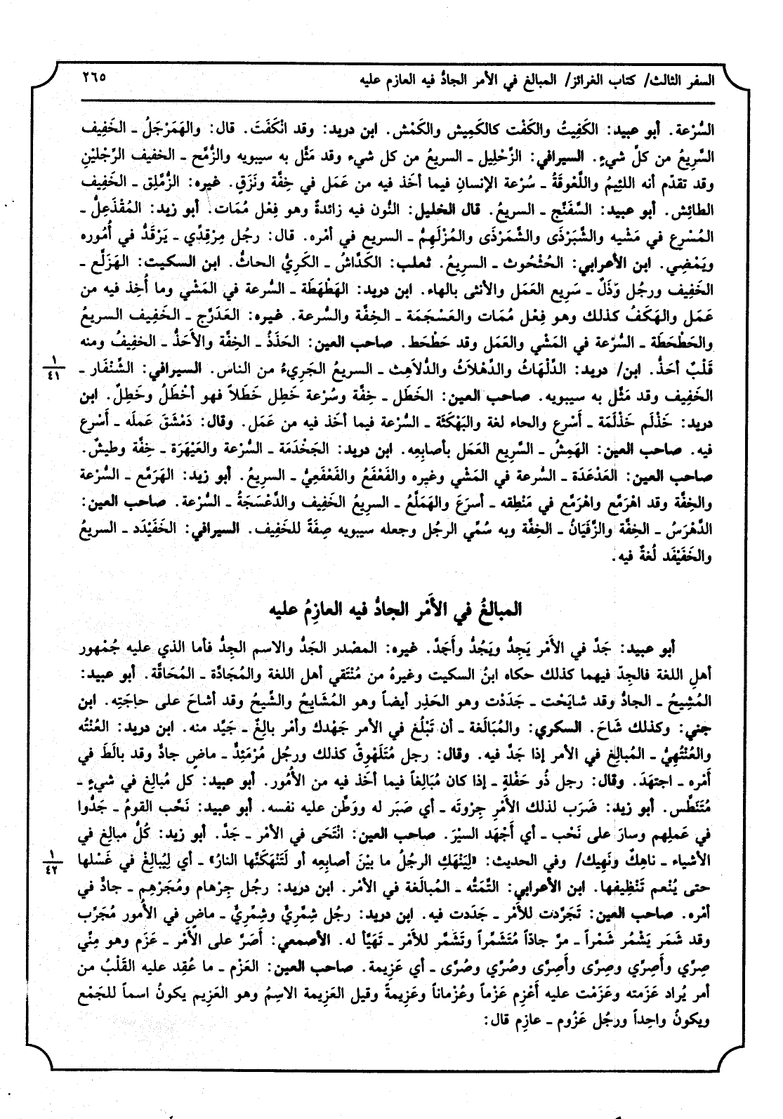 أَبُو عبيد، حَدَّق فِي الأمْر يَجِدُّ ويَجُدُّ وأجَدَّ، غَيره، المصْدر الجَدُّ والسم الجِدُّ فَأَما الَّذِي عَلَيْهِ جُمْهور أهلل اللُّغَة فالجِدّ فيهمَا كَذَلِك حَكَاهُ ابْن السّكيت وغيرُه من مُنْتَقِي أهل اللُّغَة والمُجَادَّة - المُحَاقَّة، أَبُو عبيد، المُشِيحُ - الجادُّ وَقد شايَحْت - جَدَدْت وَهُوَ الحَذِر أَيْضا وَهُوَ المُشَايِحُ والشِّيحُ وَقد أشاح على حاجَتِه، ابْن جنى، وَكَذَلِكَ شَاحَ، السكرِي، والمُبَالَغة - أَن تَبْلُغ فِي الْأَمر جَهْد وأمْر بالِغٌ - جَيِّد مِنْهُ، ابْن دُرَيْد، العُنْتُه والعُنْتُهِيُّ - المُبالِغ فِي الْأَمر إِذا جَدَّ فِيهِ، وَقَالَ، رجل مُتَلَهْوِقٌ كَذَلِك ورجُل مُرْمَئِدٌّ - ماضٍ جادٌّ وَقد بالَطَ فِي أَمْره - اجتَهدَ، وَقَالَ، رجل ذُو حَفْلةٍ - إِذا كَانَ مُبَالِغاً فِيمَا اَخَذ فِيهِ من الأُمور، أَبُو عبيد، كل مُبالِغ فِي شيءٍ - مُتَنَطِّس، أَبُو زيد، ضَرَب لذَلِك الأمْرِ جِرْوتَه - أَي صَبَر لَهُ ووَطَّن عَلَيْهِ نَفسه، أَبُو عبيد، نَحَّب القومُ - جَدُّوا فِي عَمَلِهم وسارَ على نَحْب - أَي أجْهد السيْرَ، صَاحب الْعين، انْتَحَى فِي الأمْر - جَدَّ، أَبُو زيد، كُلُّ مبالِغ فِي الْأَشْيَاء - ناهِكٌ ونَهِيكٌ وَفِي الحَدِيث لِيَنْهِك الرُجُل مَا بَيْنَ أصابِعهِ أَو لَتَنْهَكَنَّها النارُ - أَي لِيُبالغْ فِي غَسْلها حَتَّى يُنْعم تَنْظِيفها، ابْن الْأَعرَابِي، التَّمَتُّه - المُبالَغة فِي الأمْر، ابْن دُرَيْد، رجُل جِرْهام ومُجَرْهِم - جادٌّ فِي أَمْره، صَاحب الْعين، تَجَرَّدت للأَمْر - جَدَدت فِيهِ، ابْن دُرَيْد، رجُل شِمَّرِيٌّ وشمِّريٌّ - مَاض فِي الأُمور مُجَرِّب وَقد شَمَر يَشْمُر شَمْراً - مَرَّجادَاً مُتَشَمِّراً وتَشَمَّر للأَمْر - تَهَيَّأ لَهُ، الْأَصْمَعِي، أَصَرَّ على الأَمْر - عَزَم وَهُوَ مِنِّي وصِرِّي وأصِرِّي وصِرّى وأَصِرَّى وصُرِّى وصُرَّى - أَي عَزِيمة، صَاحب الْعين، العَزْم - مَا عُقِد عَلَيْهِ القَلْبُ من أَمر يُراد عَزَمته وعَزَمْت عَلَيْهِ أَعْزِم عَزْماً وعُزْماناً وعَزِيمةً وَقيل العَزِيمة الاسمُ وَهُوَ العَزِيم يكونُ اسْم للجَمْع ويكونُ واحِداً ورجُل عَزُوم - عازِم قَالَ: