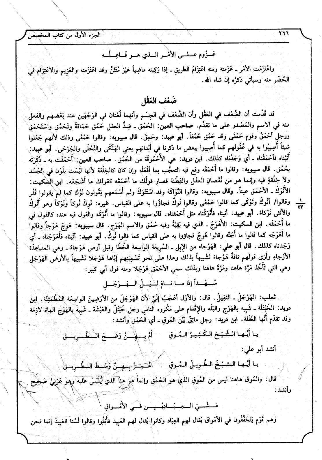 قد قَدَّمت أَن الضَّعْف فِي الْعقل وَأَن الضُّعْف فِي الجِسْم وأنهما لُغَتان فِي الوَجْهِين عِنْد بَعْضهم وَالْفِعْل مِنْهُ فِي الِاسْم والمَصْدر على مَا تقدَّم، صَاحب الْعين، الحُمُق - ضِدُّ الْعقل حَمُق حَمَاقةً وتَحَمَّق واسْتحْمَق وَرجل أحْمَقُ وَقوم حَمْقَى وَقد حَمُق حُمُقاً، أَبُو عبيد، وحَمِقَ، قَالَ سِيبَوَيْهٍ، وَقَالُوا حَمْقَى وَذَلِكَ لأَنهم جَعَلوا شيأ أُصِيبُوا بِهِ فِي عُقُولهم كَمَا أُصِيبوا بِبَعْض مَا ذكرنَا فِي أَبْدانهم يَعْنِي الهَلْكَى والنَّحْلى والجَرْحى، أَبُو عبيد، أَتَيْناه فأحْمَقْناه - أَي وَجَدْناه كَذَلِك، ابْن دُرَيْد، هِيَ الأُحْموقَة من الحُمُق، صَاحب الْعين، أَحْمقْت بِهِ - ذَكَرته بحُمُق، قَالَ سِيبَوَيْهٍ، وَقَالُوا مَا أَحْمَقَه وَقع فِيهِ التَّجُّب بِمَا أفْعَلَه وَإِن كَانَ كالخِلْقَة لِأَنَّهَا ليْسَتا بلَوْن فِي الجَدَ وَلَا خِلْقةٍ فِيهِ وَإِنَّمَا هُوَ نُقْصان العقْل والفِطْنة فَصَارَ قولُك مَا أحْمَقه كَقَوْلِك مَا أَشْجَعَه، ابْن السّكيت، الأَنْوَكُ - الأْحمَق عينا، وَقَالَ سِيبَوَيْهٍ، وَقَالُوا النَّوَاكَة وَقد اسْتَنْوَك وَلم أَسْمَعهم يَقُولون نَوُك كَمَا لم يقُولوا فَقُر وَقَالُوا أَنْوكُ ونَوْكَى كَمَا قَالُوا حَمْقَى وَقَالُوا نُوكٌ فجاؤُا بِهِ على الْقيَاس، غَيره، نَنِكَ نُوكاً ونَوَكاً وَهُوَ أَنْوكُ وَالْأُنْثَى نَوْكاءُ، أَبُو عبيد، أتيناه فأَنْوَكْناه مثل أًحْمَقناه، قَالَ سِيبَوَيْهٍ، وَقَالُوا مَا أَنْوكَه وَالْقَوْل فِيهِ عِنْده كالقول فِي مَا أَحْمَقَه، ابْن السّكيت، الأَهْوَجُ - الَّذِي فِيهِ بَقِيَّةٌ وَفِيه حُمُق وَالِاسْم الهَوَج، قَالَ سِيبَوَيْهٍ، هَوِجَ هَوَجاً وَقَالُوا مَا أَهْوَجَه كَمَا قَالُوا مَا اَجَنَّه وَقَالُوا هُوجٌ فجاؤا بِهِ على الْقيَاس كَمَا قَالُوا نُوكٌ، أَبُو عبيد، أَتَيناه فأَهْوَجْناه - أَي وَجَدناه كَذَلِك، قَالَ أَبُو عبي، الهَوْجاء من الإِبِل - السَّرِيعة الواسِعة الخُطَا وَقيل أَرض هَوْجاءُ - وَهِي المتباعِدَة الأرْجاءِ واَرَى قولَهم ناقةٌ هَوْجاءُ تَشْبيهاً بذلك وَهَذَا على نَحْو تَسْمِيَتِهم إيَّاها هَوْجلاً تَشْبيهاً بِالْأَرْضِ الهَوْجَل وَهِي الَّتِي تَأْخُذ مَرَّة هَهُنَا ومَرَّة هَهُنَا وَبِذَلِك سمي الأَحْمَق هَوجَلاً وَمِنْه قَول أبي كَبِير: سُهُداً إِذا مَا نامَ لَيْلُ الهَوْجَلِ ثَعْلَب، الهَوْجَلُ - الثقِيلُ، قَالَ، والأوّل أعْجَبُ إلَيَّ لِأَن الهَوْجَلَ من الأَرَضِينَ الواسِعَة المُطْمَئِنّة، ابْن دُرَيْد، الخَبْتَلَة - شَبِيه بالهَوَج والبَلَه والإقْدام على مَكْروه الناسِ رجل خُبْتُلٌ والعَبْشَة - شَبِيه بالهَوَج الهاءُ لازِمَة وَقد تقدّم أَنَّها الغَفْلة، ابْن دُرَيْد، رجل مائِقٌ بَيِّن المُوقِ - أَي الحُمْق وَأنْشد: يَا أَيُّها الشَّيْخ الكَثِيرُ المُوقِ أُمَّ بِهِنَّ وَضَح الطَّريقِ وَأنْشد أَبُو عَليّ: يَا أَيُّها الشَّيْخ الطوِيلُ المُوقِ أغُمِزْ بِهِنَّ وَسَط الطَّريقِ قَالَ، والمُوق هَهُنَا لَيْسَ من المُوقِ الَّذِي هُوَ الحُمُق وَإِنَّمَا هوهنا الَّذِي يُلْبَس عَلَيْهِ وَهُوَ عَرَبِيٌّ صَحِيح وَأنْشد: مَشْيَ العِبَادِيِّين فِي الأَمْواقِ وهم قَوْم يَتَخَفَّفُون فِي الأمْواق يُقال لَهُم العِبَاد وَكَانُوا يُقال لَهُم العَبيد فأَنِفُوا وَقَالُوا لَسْنا العَبِيدَ إِنَّمَا نَحن
