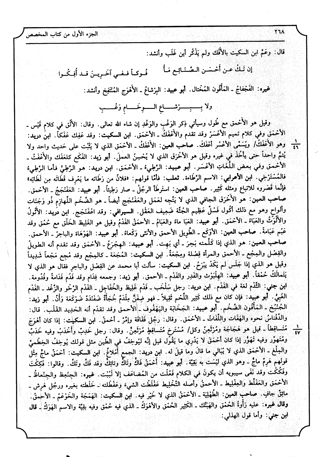 وعَمَّ ابْن السّكيت بالأَفْك وَلم يَذْكُر أَيْن غَلَب وَأنْشد: إِن تَكُ عَن أَحْسَن الصَّنَائِع مَأْ فُوكَاً فِي آخَرِينَ قد أُفِكُوا غَيره، الفَجْفاجُ - المأْفُون المُخْتال، أَبُو عبيد، البِرشاعُ - الأهْوَج المُنْتَفِخ وَأنْشد: وَلَا بِبِرْشاعِ الوِخَامِ وَغْبِ وَقيل هُوَ الأحْمَق مَعَ طُول سَيَأْتِي ذِكْر الوَغْبِ والوَغْدان إِن شَاءَ الله تَعَالَى، وَقَالَ الأَلْق فِي كلامِ قَيْس - الأحْمَق وَفِي كَلَام تَمِيم الأَعْسَرُ وَقد تقدم والأَعْفَكُ - الأحْمَق، ابْن السّكيت، وَقد عَفك عَفَكاً، ابْن دُرَيْد، وَهُوَ الأَعْفَكُ ويُسَمَّى الأَعْسَرُ أَعْفَكَ، صَاحب الْعين، الاَعْفَكُ - الأحمق الَّذِي لَا يَثْبُت على حَدِيث وَاحِد وَلَا يُتمُّ واحِداً حَتَّى يأخُذَ فِي غَيره وَقيل هُوَ الأخْرَق الَّذِي لَا يُحْسِنُ العملَ، أَبُو زيد، الفَكَع كالعَفَك والأَعْفَتُ - الأَحْمق وَفِي بعض اللُّغَاتِ الأعْسَر، أَبُو عبيد، الرَّطِيءُ - الأحْمَق، ابْن دُرَيْد، هُوَ الرَّطِيُّ فَأَما الرَّطِيءُ فالمُسْتَرْخِي، ابْن الْأَعرَابِي، الِاسْم الرَّطَاءة، ثَعْلَب، فأمَّا قَوْلهم فلانٌ من رَطَانه مَا يَعْرِف قَطَانَه من لَطَانِه فإنَّما فَصَروه للأتباع وَمثل كَثِير، صَاحب الْعين، هُوَ الأَخْرَق الجافِي الَّذِي لَا يَتَّجه لعَمَل والعَفَنْجَج أَيْضا - هم الضَّخْم اللَّهازِم ذُو وَجَنَات وألواحٍ وَهُوَ مَعَ ذَلِك أَكُول فَسْلٌ عَظِيم الجُثَّة ضَعِيف العَقْل، السيرافي، وَقد اعْفَنْجَج، ابْن دُرَيْد، الأَثْولُ الألْوَثُ والعَيَاءُ - الأحْمَق، أَبُو عبيد، العَبَاماءُ والعَبَامُ - الأحْمَقُ الفَدْمُ وَقيل هُوَ الغَلِيظ الخَلْق معم حُمُق وَقد عَبُم عَبَامةً، صَاحب الْعين، الأَوْكَع - الطَّوِيل الأحمق وَالْأُنْثَى وَكْعاءُ، أَبُو عبيد، الهَوْهاة والباحِرُ - الأحمق، صَاحب الْعين، هُوَ الَّذِي إِذا كَلَّمته بَحِر - أَي بَهِت، أَبُو عبيد، الهِجْرَعُ - الأحْمَق وَقد تقدم أَنه الطويلُ والفِصْل والمِجْع - الأحمق وَالْمَرْأَة قِصْلة ومِجْعةٌ، ابْن السّكيت، المُجَعَة - كالمِجْع وَقد مُجِع مَجْعاً شَدِيداً وَقيل هُوَ الَّذِي إِذا جَلَس لم يَكَدْ يَبْرَحُ، ابْن السّكيت، سَأَلت أَبَا مُحَمَّد عَن القِصْل والباحِرِ فَقَالَ هُوَ الَّذِي لَا يَتَمالَكُ حُمْقاً، أَبُو عبيد، الهِلْبوْث والفَدِر والفَدْم - الأحمق، أَبُو زيد، وَجمعه فِدَام وَقد فَدُم فَدَامةً وفُدُومة، أبن جنى، الثَّدْم لُغَة فِي الفَدْم، ابْن دُرَيْد، رجل سَلْخَب - فَدْم غَلِيظ والخُفَاجِل - الفَدْم الرِّخّو والزَّغْد - الفَدْم الغَبِيُّ، أَبُو عبيد، فَإِن كَانَ مَعَ ذَلِك كَثِير اللَّحْم ثَقيلاً - فَهُوَ ضِقَنٌّ مِلْدَمٌ خُجَأَةٌ ضَفَنْدَدٌ ضَوْكَعةٌ وَأنٌ، أَبُو زيد، الجُنْبُنج - المَأْفُون الضَّخْم، أَبُو عبيد، الجَخَابَة واليَهْفُوف - الأحمق وَقد تقدّم أَنه الحَدِيد القَلْب، قَالَ، والدِّفْناسُ نَحوه والهَفَات واللَّفَاتُ - الأَحْمَق، وَقَالَ، رجُل فَقَاقَة وإمْرٌ - أَحْمٌق، أبن السّكيت، إِذا كَانَ أَهْوَجَ مُتَساقِطاً - قيل هُوَ هَجاجَة ومُرْثَعِن وكل مُسْتَرخٍ مُتَساقِطٍ مُرْثَعِنٌّ، وَقَالَ، رجل خَدِبٌ وأَخْدَبُ وَفِيه خَدَبٌ ومُتَهوِّر وَفِيه تَهَوُّر إِذا كَانَ أحْمَقَ لَا يَدْرِي مَا يَقُول قيل إنَّه ليُوخِفُ فِي الطِّين مثل قَوْلك يُوخِفُ الخِطْميَّ والمِلْغ - الأَحْمَق الَّذِي لَا يُبَالِي مَا قالَ وَمَا قيلَ لَهُ، ابْن دُرَيْد، الْجمع أَمْلاغٌ، ابْن السّكيت، أَحْمَقُ ماجٌّ مِثْل قَوْلهم هَرمٌ ماجٌّ - وَهُوَ الَّذِي ليْسَت بِهِ بَقِيَّة، أَبُو عبيد، أَحْمَقُ فَاكٌّ وتَاكٌّ وتائِكٌ وَقد فَكَّ وتَكَّ، وَقَالُوا، فَكِكْتَ وفَكُكْت وَقد نَفَى سِيبَوَيْهٍ أَن يكونَ فِي الْكَلَام فَعُلْت من المُضاعَف والألبُبْت، غَيره، الجِنْعِظ والجِنعاظُ - الأحْمَق والعَفَلَ
