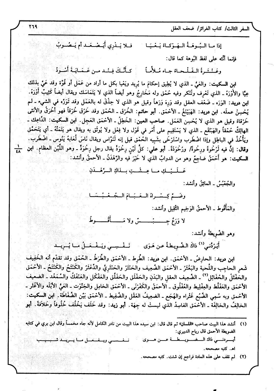 إِذا مَا البُوهَةُ الهَوْكاءُ يَعْيَا فَلَا يَدْرِي أَيًعَد أَن يَصُوبُ فَإِنَّمَا أنَّثه على لفظ البُوهة كَمَا قَالَ: وعَنْتَرةُ الفَلْحاءُ جَاءَ مُلأَّماً كأنَّكَ فِنْد من عَمَايَة أَسْودُ ابْن السّكيت، والعَيُّ - الَّذِي لَا يُطِيق إحكامَ مَا يُرِيد ويَعْيا بِكُل مَا أَرَادَ من عَمَل أَو قُوَّة وَقد عَيَّ بذلك عِيّاً والأَوْرهُ - الَّذِي تَعْرِف وتَنْكر وَفِيه حُمْق وَله مَخَارجُ وَهُوَ أَيْضا الَّذِي لَا يَتَماسَك وَيُقَال أَيْضا كَثِيبٌ أَورَهُ، ابْن دُرَيْد، الوَرَه - ضَعْف الْعقل وَقد وَرِهَ وَرَها وَقيل هُوَ الَّذِي لَا حِذْقَ لَهُ بالعَمَل وَقد تَوَرَّه فِي الشيءِ - لم يُحْسِنْ عملَه، ابْن دُرَيْد، الهَبَينَغُ - الأَحْمَق، أَبُو حَاتِم، الخُرْق - الحُمْق وَقد خَرُق خُرْقاً فَهُوَ أخْرَقُ وَالْأُنْثَى خَرْقاءُ وَقل هُوَ الَّذِي لَا يُحْسِن العَمَل، صَاحب الْعين، الخَطِلُ - الأحْمَق العَجِل، ابْن السّكيت، الدَّاعِك - الهالِكُ حُمْقاً والهَبَنْقَع - الَّذِي لَا يَسْتَقِيم على أَمْر فِي قَوْل وَلَا فِعْلٍ وَلَا يُوثَق بِهِ وَيُقَال هُوَ يَتَمَتَّهُ - أَي يَتَحَمَّق ويَأْخُذُ فِي الْبَاطِل وَإِذا اضْطَرَب واسْتَرْخَى بشَبيه الحُمْق قيل إِنَّه لَنَوَّاس وَيُقَال نَاسَ لُعَابُه ينُوس - اضْطَرب، وَقَالَ، إنَّ فِيهِ لَرَخْوةً ورِخْوةً ورِخْوَدّةً، أَبُو عَليّ، كلُّ لَيِّنٍ رِخْوَدٌّ يُقَال رجل رِخْوَدٌّ - وَهُوَ اللَّيِّن العظامِ، ابْن السّكيت، هُوَ أحْمَقُ ضاجِعٌ وَهُوَ من الدوابِّ الَّذِي لَا خَيْرَ فِيهِ والرَّهْدَنُ - الأحْمقُ وَأنْشد: عَلَيْكِ مَا عِشْتِ بذاكِ الرَّهْدَنِ والجُعْبُسُ - المائِقُ وَأنْشد: وضَمَّ كِسْراهُ العَبَامَ الجُعْبُسَا والماْقُوط - الأحمقُ الوَخِيم الثَّقِيل وَأنْشد: لَا وَرَعٌ جِبْسٌ وَلَا مَأْقُوطُ وَهُوَ الضَّوِيطةُ وَأنْشد: أيَرُدُّنِي ذاكَ الضَّوِيطةُ عَن هَوَى نَفْسِي ويَفْعَلُ مَا يُرِيد ابْن دُرَيْد، الحارِضُ - الأحمَق، ابْن دُرَيْد، الطَّرِط - الأحْمَق والطَّرَطْ - الحُمْق وَقد تقدّم أَنه الخَفِيفِ شَعْرِ الحاجِب واللِّحية والبَغثَرُ - الأَحْمَق الضَّعِيف والخَنْثَرُ والحَنْثَرِيُّ والدَّعْثَرُ والكَنْثَحُ والكَنْتَحُ - الأحْمَق والحَفْثَلُ والحُفَاثِل - الضَّعِيف العقلِ والبَدَنِ والحَفْلَق والحَفَلَّق والعَفْكَل والعَنْفَكُ والسِّمَغْد - الضَّعيف الأحْمَق والعَفَلَّط والعِفْلِيط والعُفْلُوق - الأحْمَقُ والكَفَرْنَى - الأحْمق الخامِل والخِنَّوْت - العَيُّ الأبْلَه والإْثَر - الأحْمق وَبِه سُمِّي الضَّبُع غَثْراء والهُجَع - الضعِيفُ العَقْل والضّفِيط - الأحْمَق بَيِّن الضَّفَاطَة، ابْن السّكيت، الخالِفُ والخالِفَة - الأحْمَق الفاسِدُ الَّذِي ليستْ لَهُ جِهَة، أَبُو زيد، وَقد خَلَف يَخْلُف خُلُوفاً وخلاَفةٌ، أَبُو