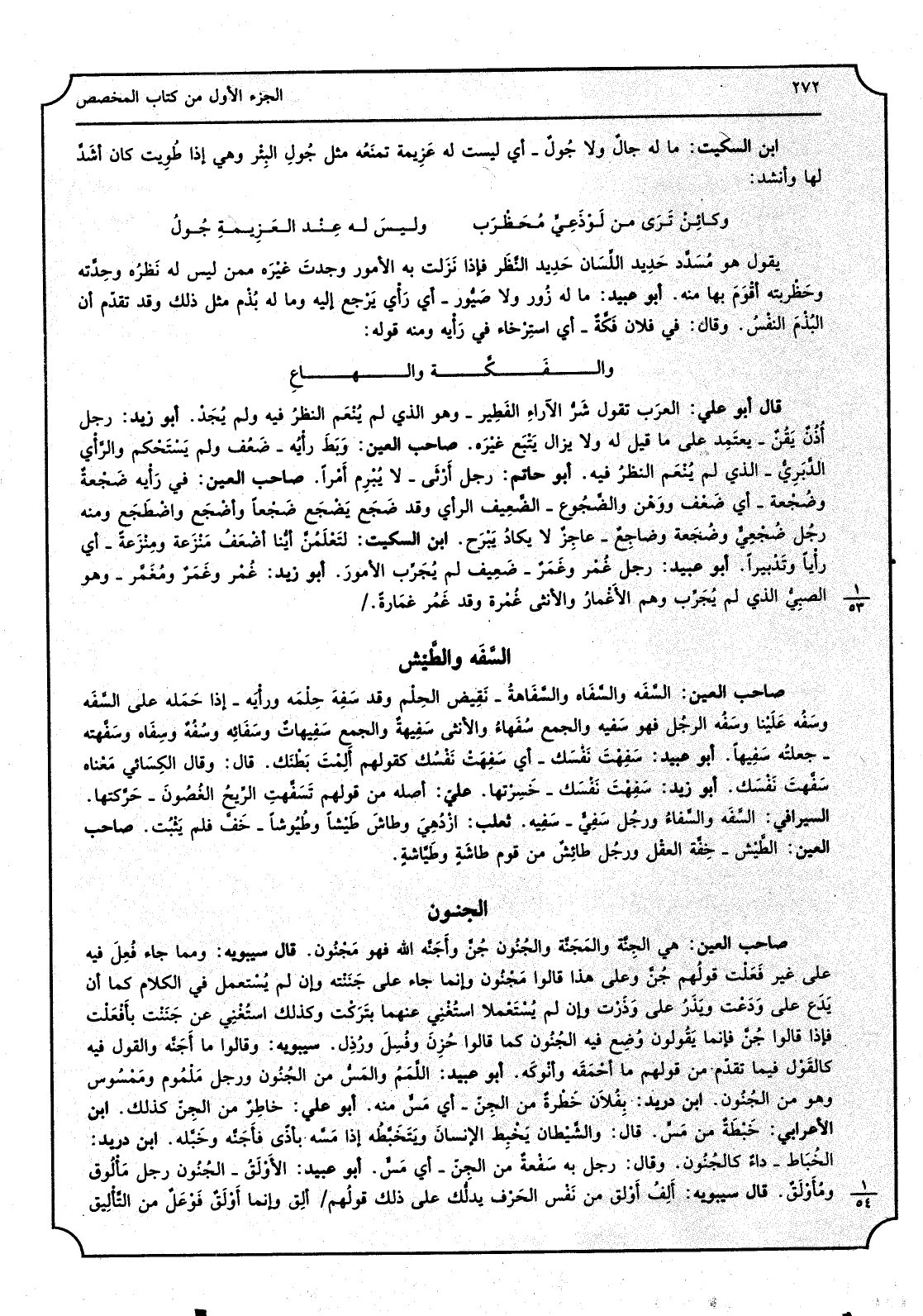 صَاحب الْعين، السَّفَه والسَّفَاه والسَّفاهةُ - نَقِيض الحِلْم وَقد سَفِهَ حِلْمَه ورأْيَه - إِذا حَمَله على السَّفَه وسَفُه عَلِيْنا وسَفُه الرجُل فَهُوَ سَفيه وَالْجمع سُفَهاءُ وَالْأُنْثَى سَفِيهةٌ وَالْجمع سَفِيهاتٌ وسَفَائِه وسُفُهٌ وسِفَاه وسَفَّهته جَعلتُه سَفِيهاً، أَبُو عبيد، سَفِهْتَ نَفْسَك - أَي سَفِهَتْ نَفْسُك كَقَوْلِهِم أَلِمْتَ بَطْنَك، قَالَ، وَقَالَ الكِسَائِي مَعْناه سَفَّهتَ نَفْسَك، أَبُو زيد، سَفِهْتَ نَفْسَك - خَسرْتها، عليّ، أَصله من قَوْلهم تَسَفَّهتِ الرِّيحُ الغُصُونَ - حَرَّكتها، السيرافي، السَّفَه والسَّفاءُ ورجُل سَقيٌّ - سَفِيه، ثَعْلَب، ازْدُهِيَ وطاشَ طَيْشاً وطُيُوشاً - خَفَّ فَلم يَثْبُت، صَاحب الْعين، الطَّيْش - خِفَّة العقْل ورجُل طائِشٌ من قوم طاشَةٍ وطَيَّاشةٍ.